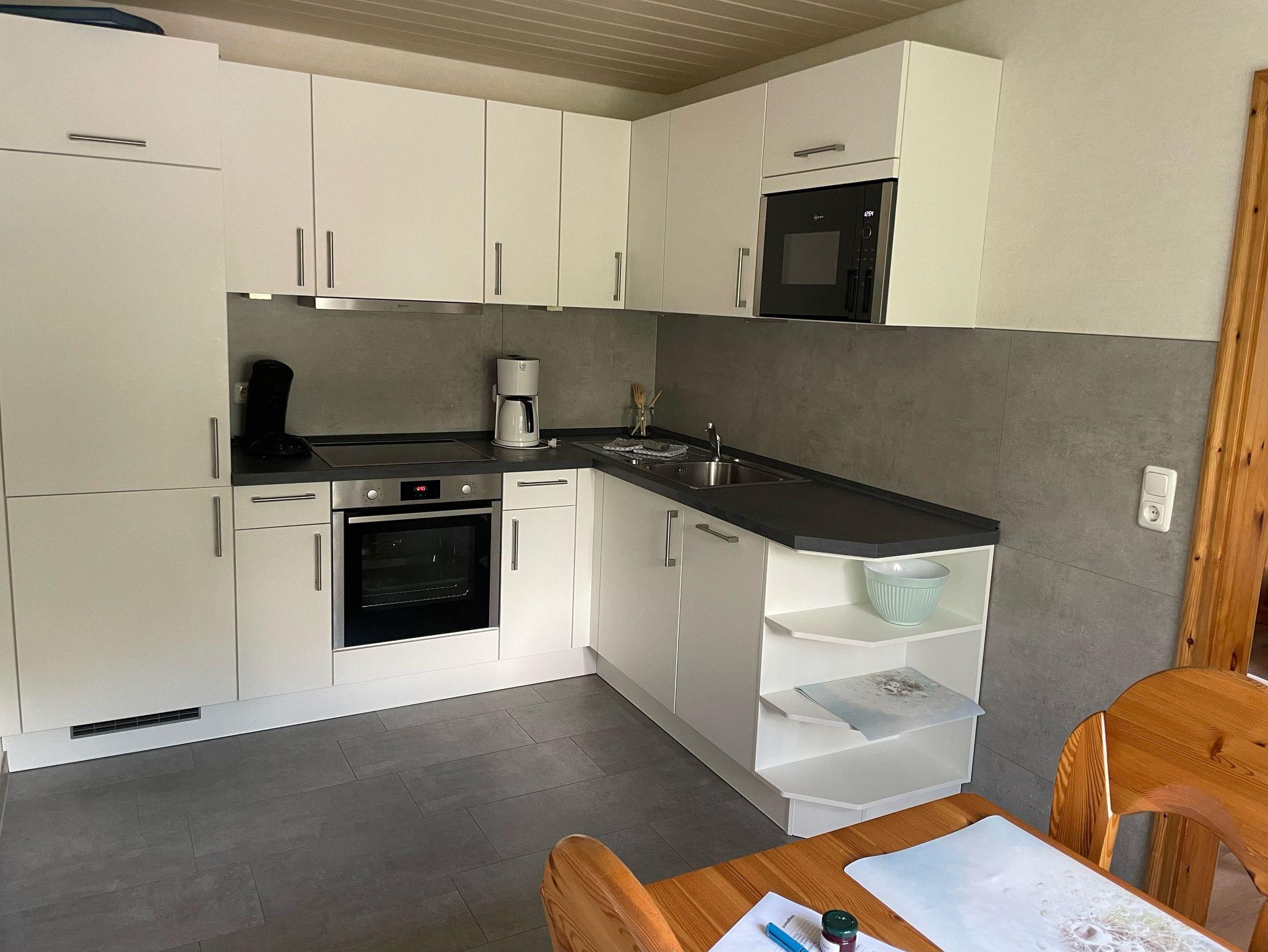 Die separate Küche ist komfortabel und großzügig eingerichtet u.a. mit E-Herd, Kühlschrank, Spülmaschine, Mikrowelle und Kaffeemaschine.