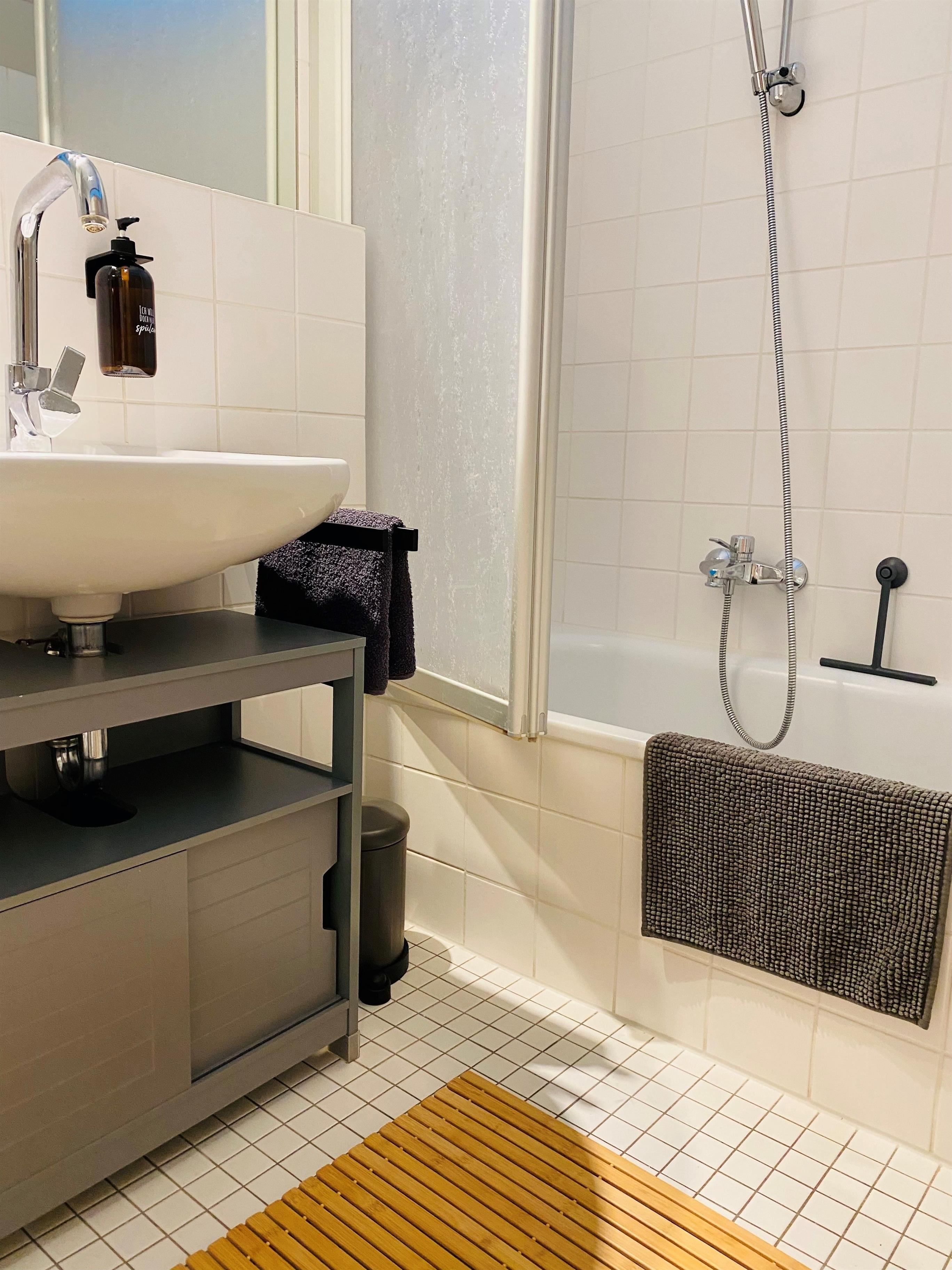Unser Badezimmer verfügt über eine großzügige Badewanne mit Duschabtrennung und ein WC. Einen Fön haben wir hier bereits für sie hinterlegt. Ihre persönlichen Sachen finden Platz in einer Badezimmerkommode.