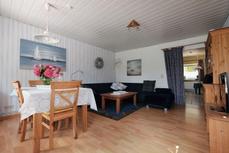 Unser idyllisch gelegener Bungalow liegt hinter dem Haupthaus, mit Blick auf die Pferdekoppeln. Er ist ca. 70 qm groß, wobei alle Räume auf einer Ebene liegen. Der Bungalow ist im nordischen Stil eingerichtet. Die Fußböden sind mit pflegeleichtem Laminat ausgelegt und deshalb auch gut für Allergiker geeignet. Weiterhin finden Sie ein Schlafzimmer mit Ehebetten und ein weiteres Schlafzimmer mit zwei Etagenbetten. Alle Betten sind 1m x 2m groß. Ein Kinderbett kann bequem dazu gestellt werden. Der Bungalow verfügt über eine vollständig eingerichtete Einbauküche mit Geschirrspüler, Mikrowelle und Herd mit Backofen. Im großzügig geschnittenen Wohnzimmer finden Sie eine gemütliche Couchgarnitur, eine Essecke, Sat-TV und Stereoanlage. Der Ausgang führt Sie direkt auf die ruhig gelegene Terrasse mit Gartenmöbeln und dem Zugang zu unserem ca. 5000 qm großen Garten.