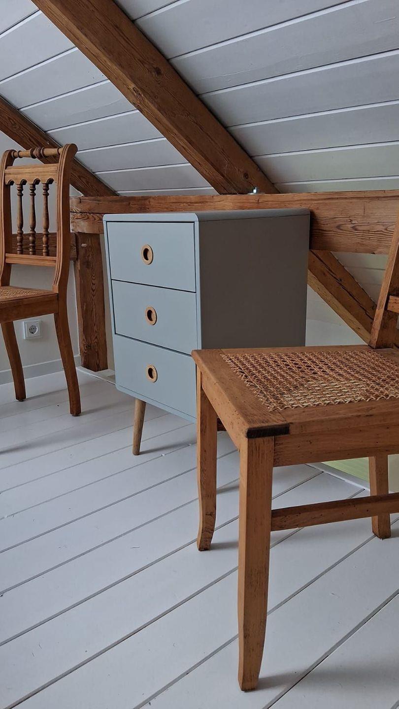 Vom Wohnraum her kommen Sie über ein offene Treppe auf die Empore, wo ein kleines Doppelbett 160x200 mit durchgehender Matzratze steht. Sie finden dort Haken für Kleidung, eine Kommode mit Schubladen sowie 2 Stühle.