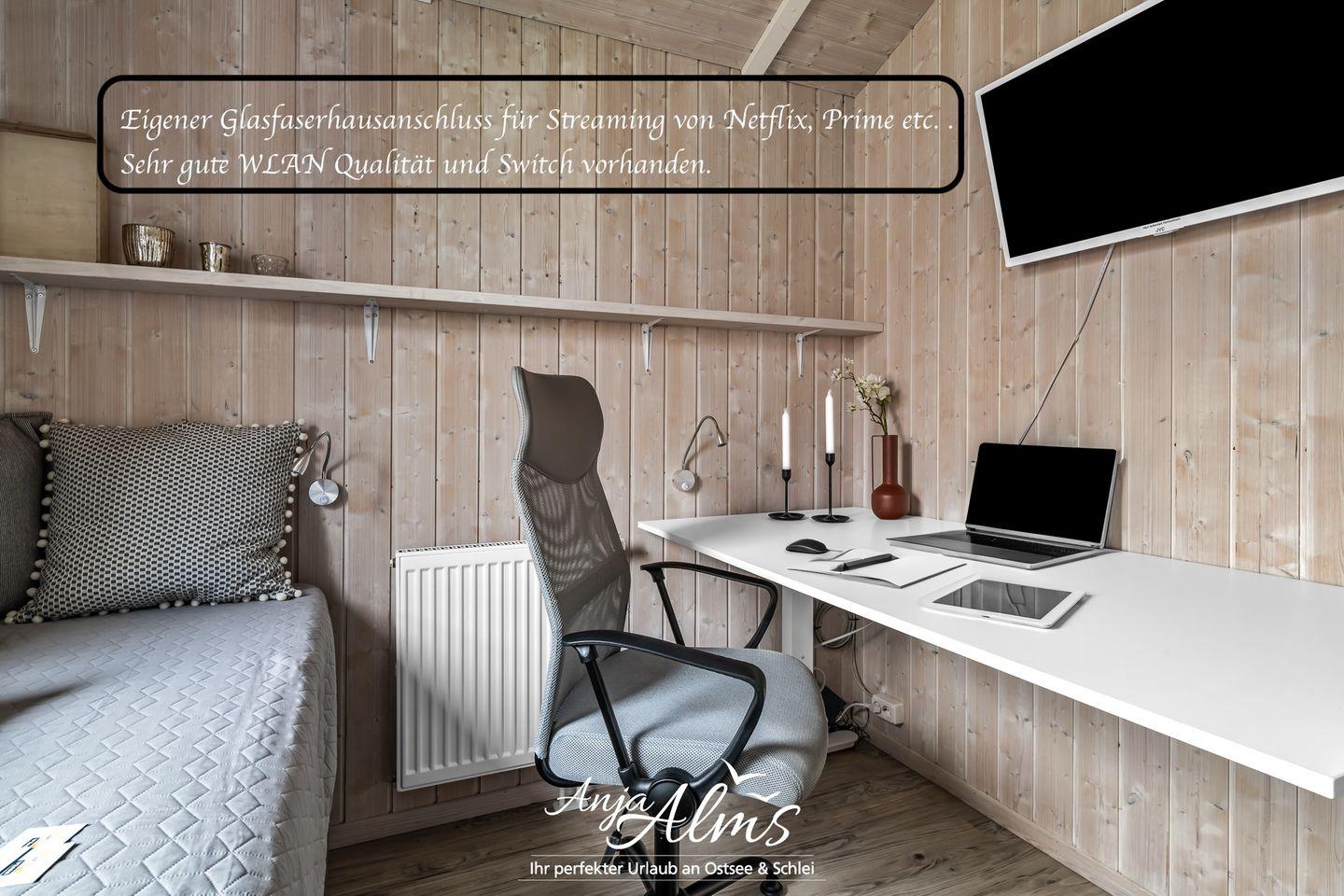 Sie müssen auch während Ihres Urlaubs arbeiten oder habe eine Kombination aus beidem geplant? Unser Ferienhaus bietet mit Schreibtisch und Glasfaseranschluß die Möglichkeit für Homeoffice.