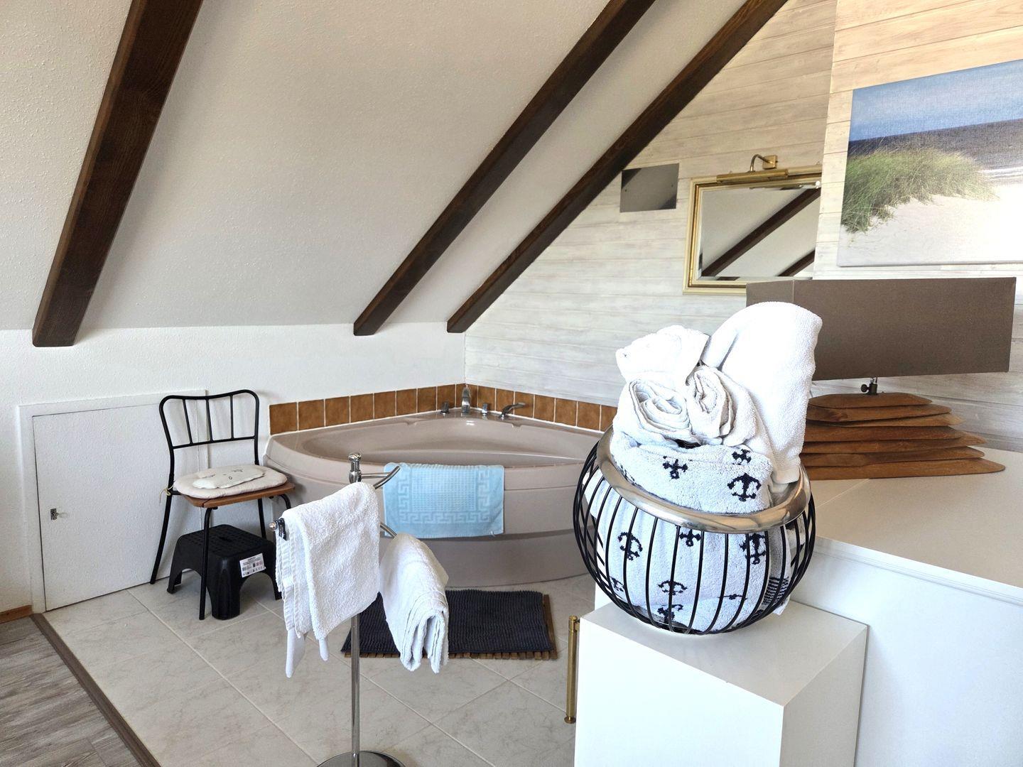• Großes Schlafzimmer mit Doppelbett (180x200 cm), Badewanne, Waschbecken, Sportmatte und Fliegengitter