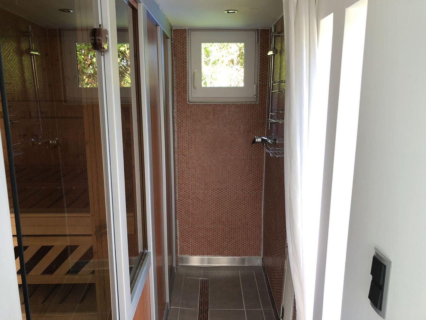 Das Saunahaus (18qm) mit einer Innen-und Außendusche verfügt über einen Ruheraum - hier können Sie perfekt entspannen. Die Krönung ist der große Außenwhirlpool für bis zu 6 Personen. (die Mindestbuchungsdauer beträgt für die Nutzung 7 Nächte; Sauna und Whirpool sind nicht im Preis inbegriffen und müssen extra vor Ort bezahlt werden! Sauna: 15€ pro Nacht, Reinigung Saunahaus 25€ einmalig, Pool 20€ pro Nacht)