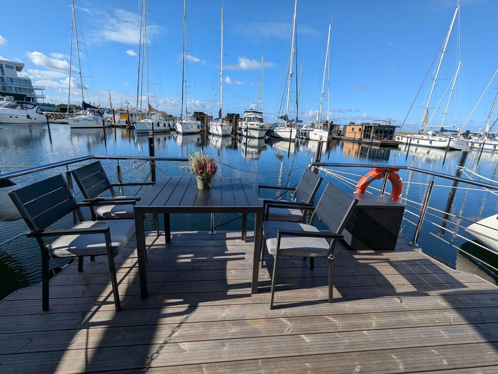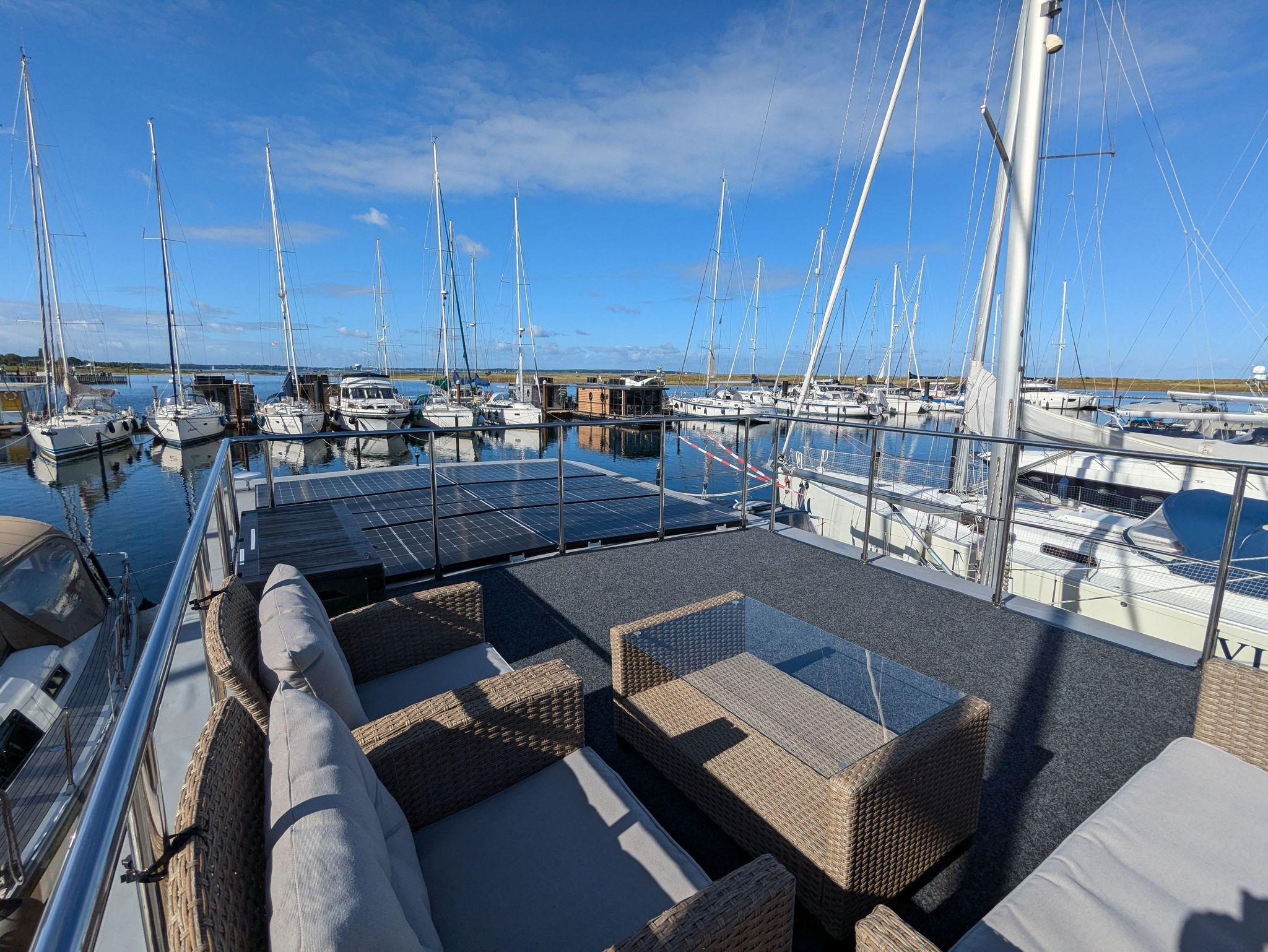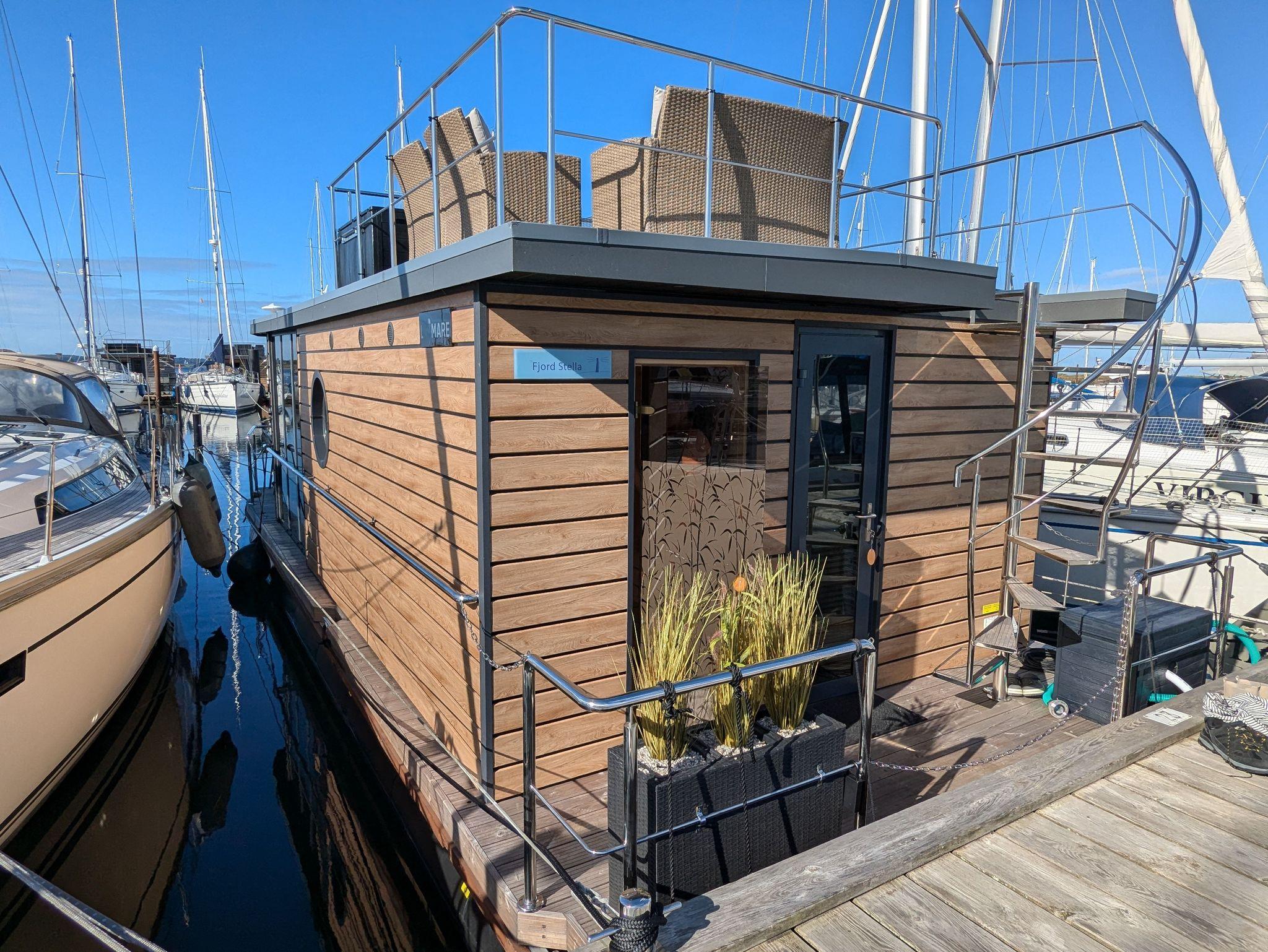 Erleben Sie nachhaltigen Urlaub auf dem Solar-Hausboot Fjord Stella mit Meerblick und moderner Ausstattung.