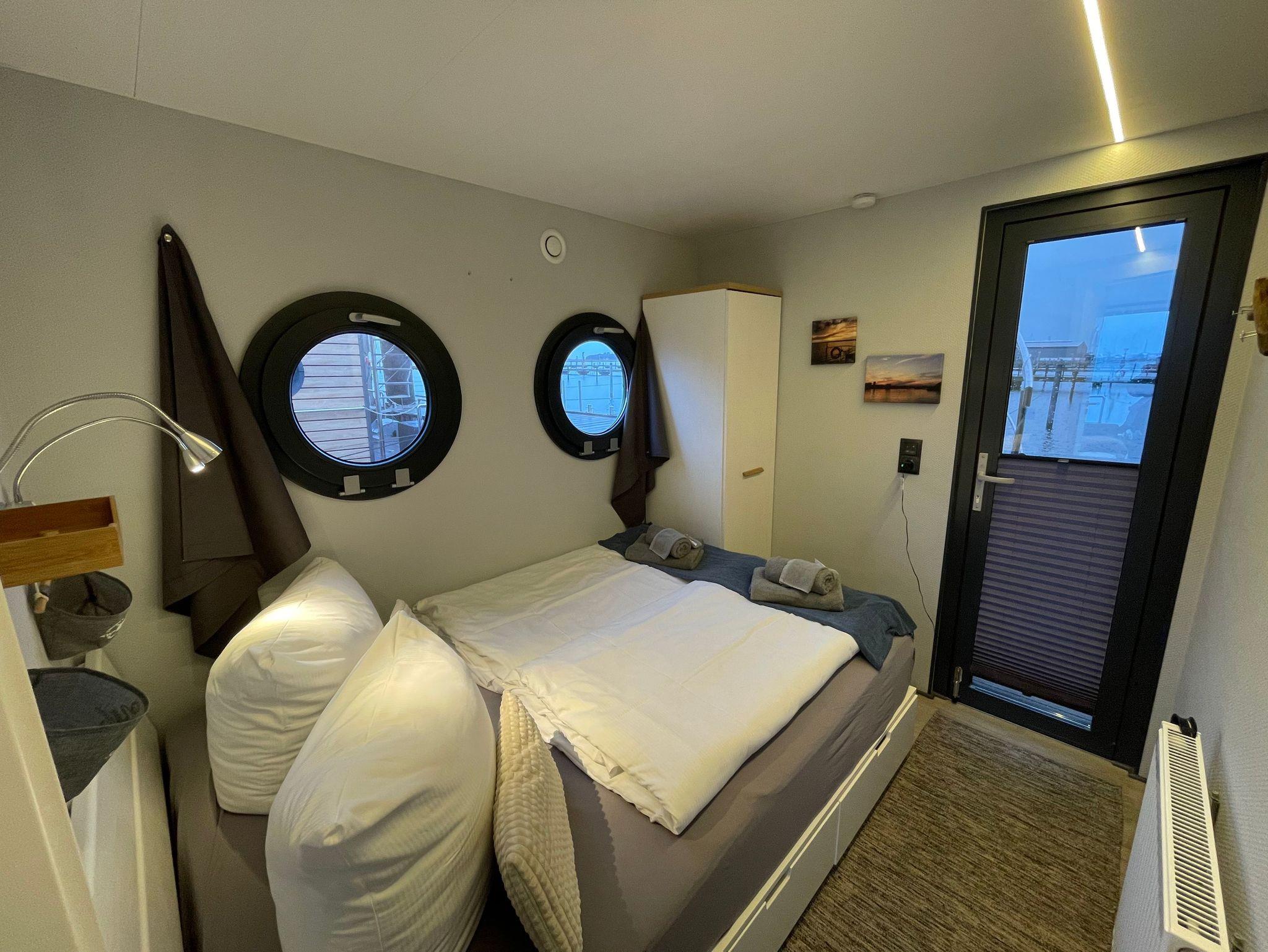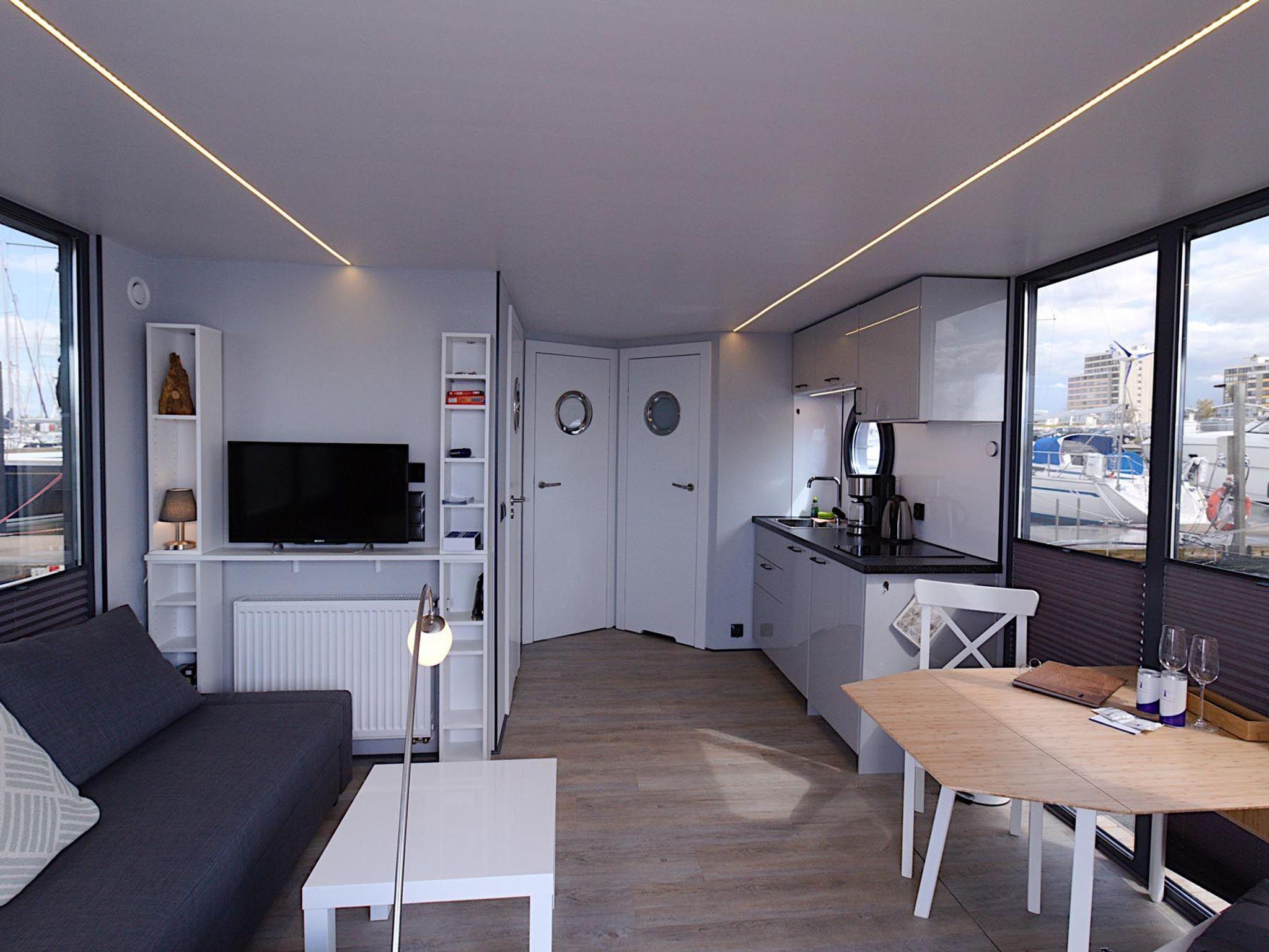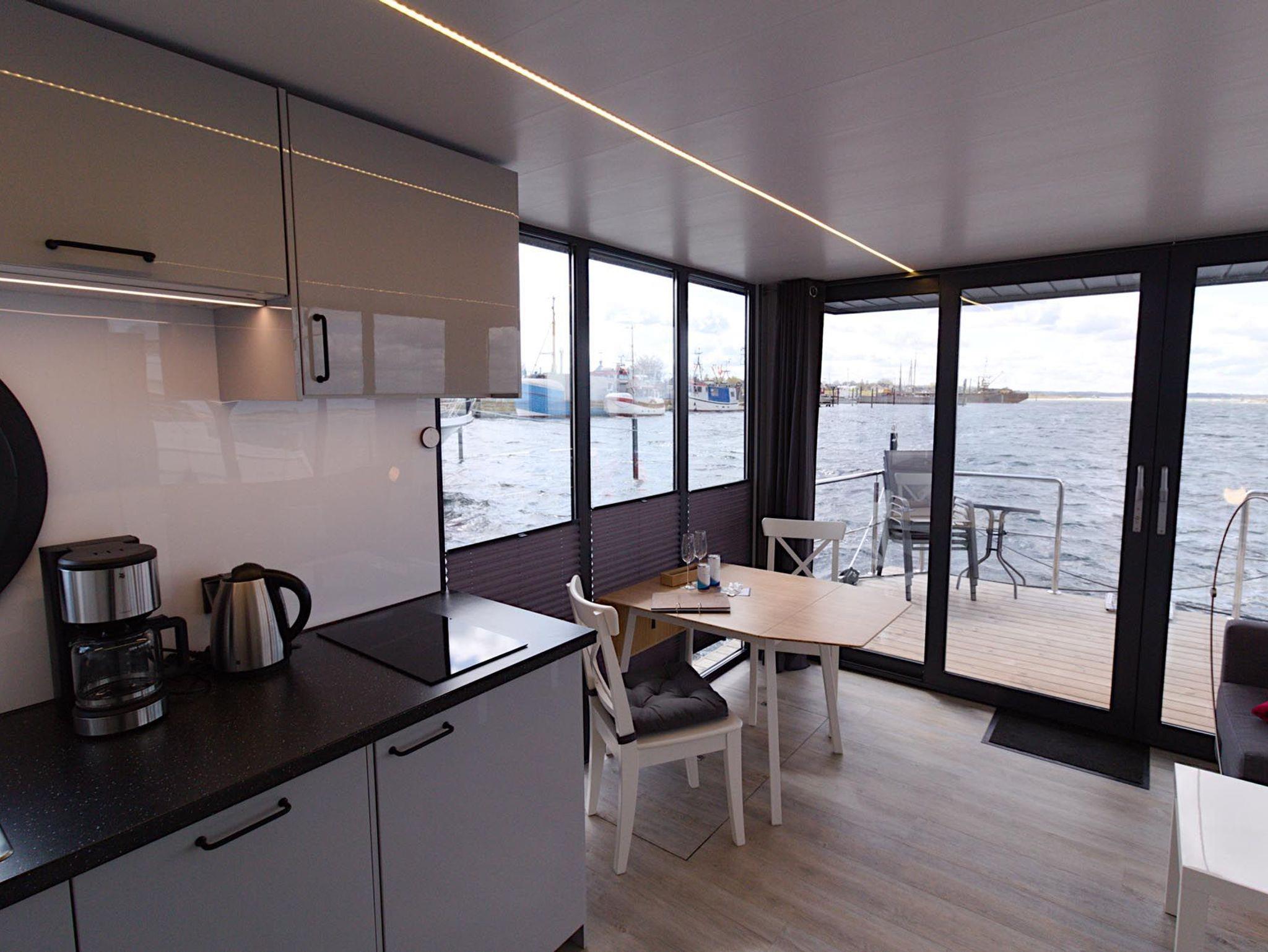 Genießen Sie nachhaltigen Urlaub auf dem Solarhausboot Fjord Auriga mit Meerblick und moderner Ausstattung.