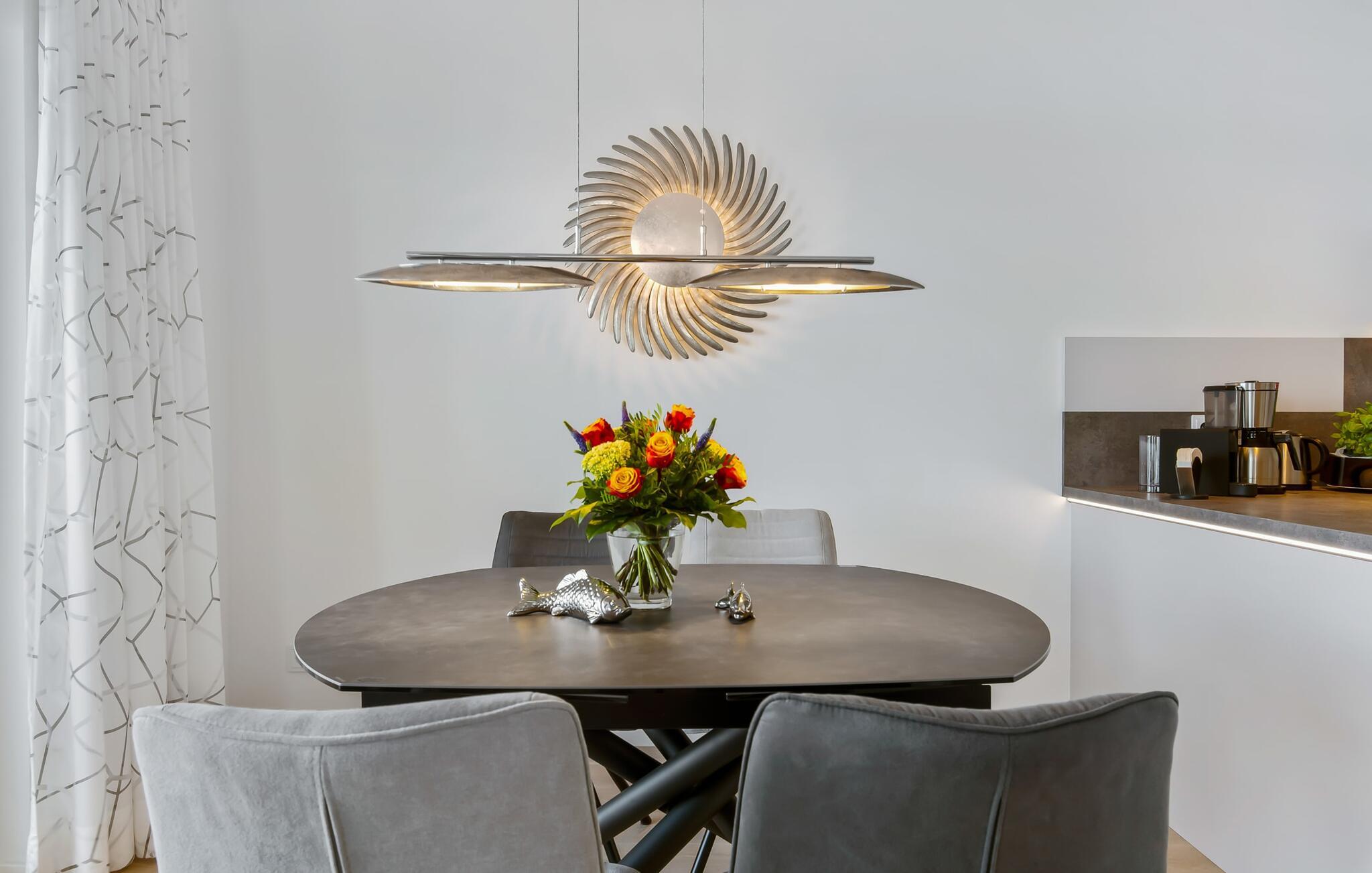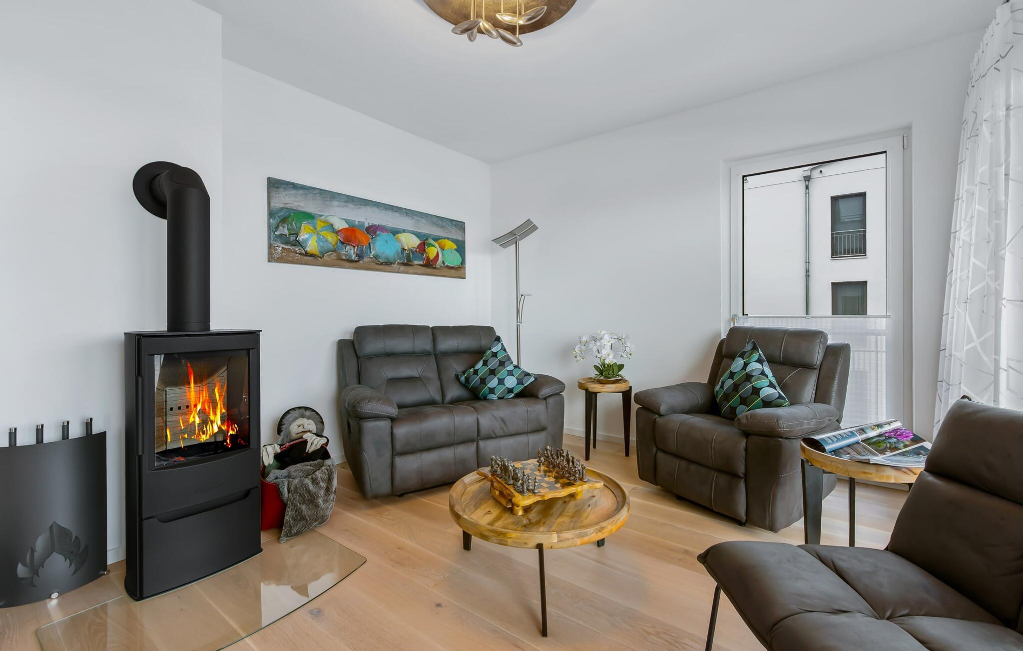 Die gesamte Wohnung verfügt über echten Parkettboden sowie eine Fußbodenheizung. Der lichtdurchflutete und großzügige Wohn- und Essbereich mit Kaminofen strahlt Eleganz und Wärme aus. Zarte Farben und sehr hochwertige Möbel wie ein manuell verstellbares Doppelsofa oder ein elektrisch verstellbarer Relaxsessel unterstreichen das Ambiente.