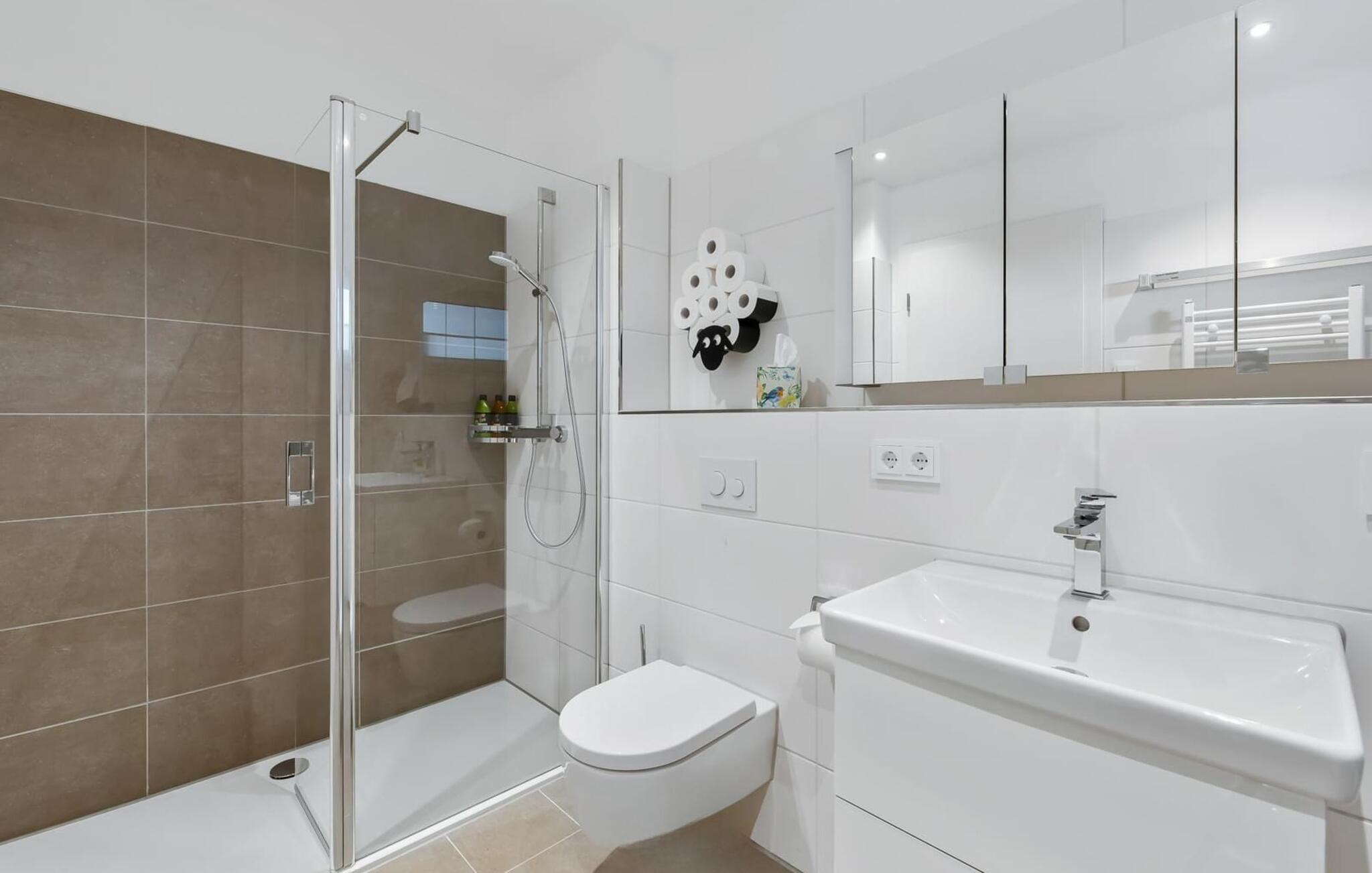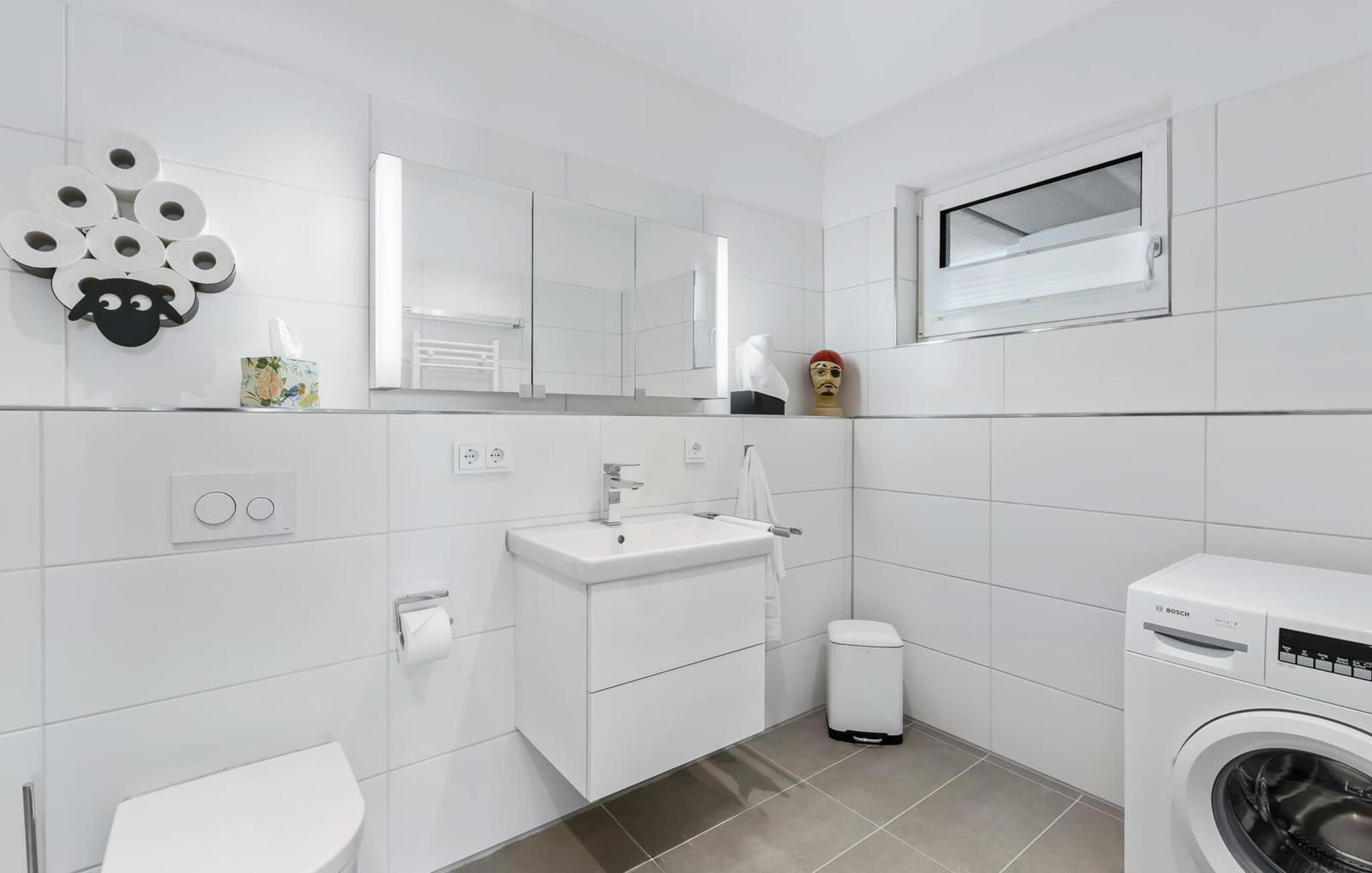 Wenn ihr das Bad betretet, verwöhnt euch eine extra große ebenerdige Dusche für den Start in einen gelungenen Urlaubstag und für eure Wäsche steht euch eine Waschmaschine sowie eine ausziehbare Wand-Wäscheleine von Leifheit sowie ein Wäscheständer für die Terrasse zur Verfügung.