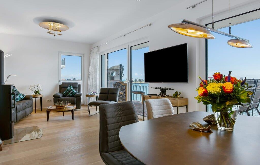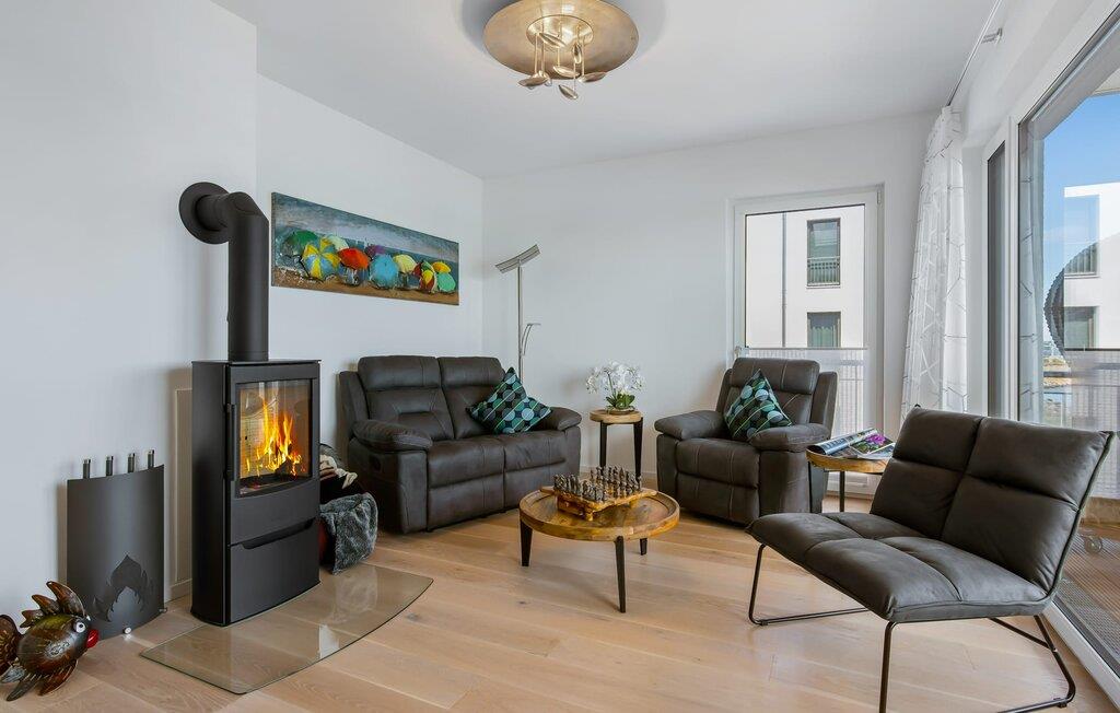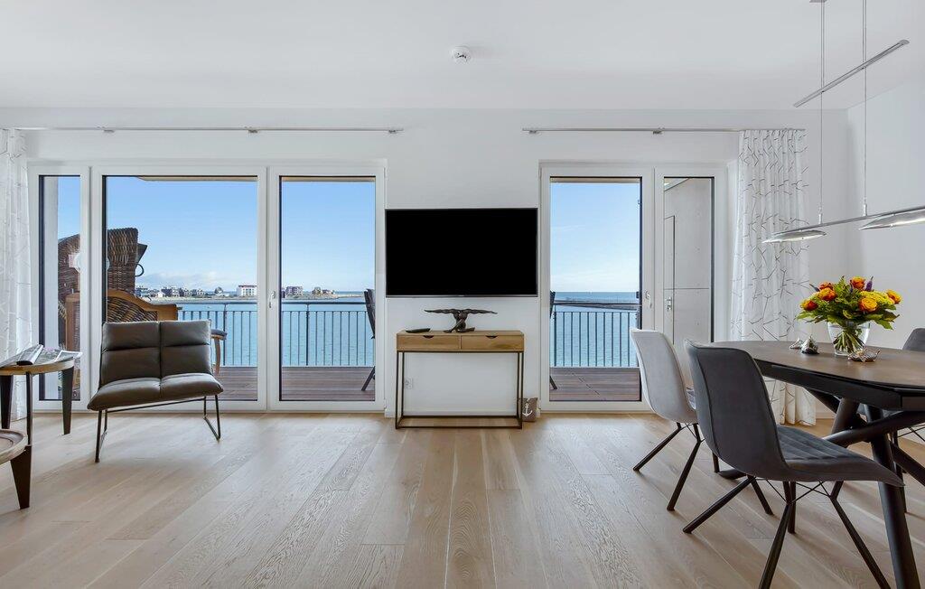 All dies genießt vor dem unglaublichen Panorama der Ostsee. Es ist ein beeindruckendes und unglaubliches Wasserschauspiel was euch hier 24 Stunden rund um die Uhr geboten wird. Sollte das Wetter das auf dem Balkon sitzen nicht gestatten, könnt ihr das Spektakel aufgrund der bodentiefen Fenster auch ganz gemütlich vom Sofa aus genießen. Wenn ihr eine musikalische Untermalung benötigt, steht euch im Wohnzimmer sowie in beiden Schlafzimmern jeweils ein Radio und ein Fernseher zur Verfügung.