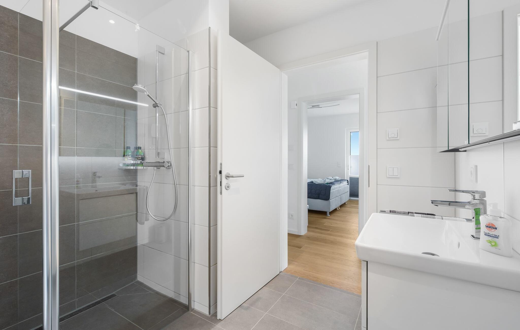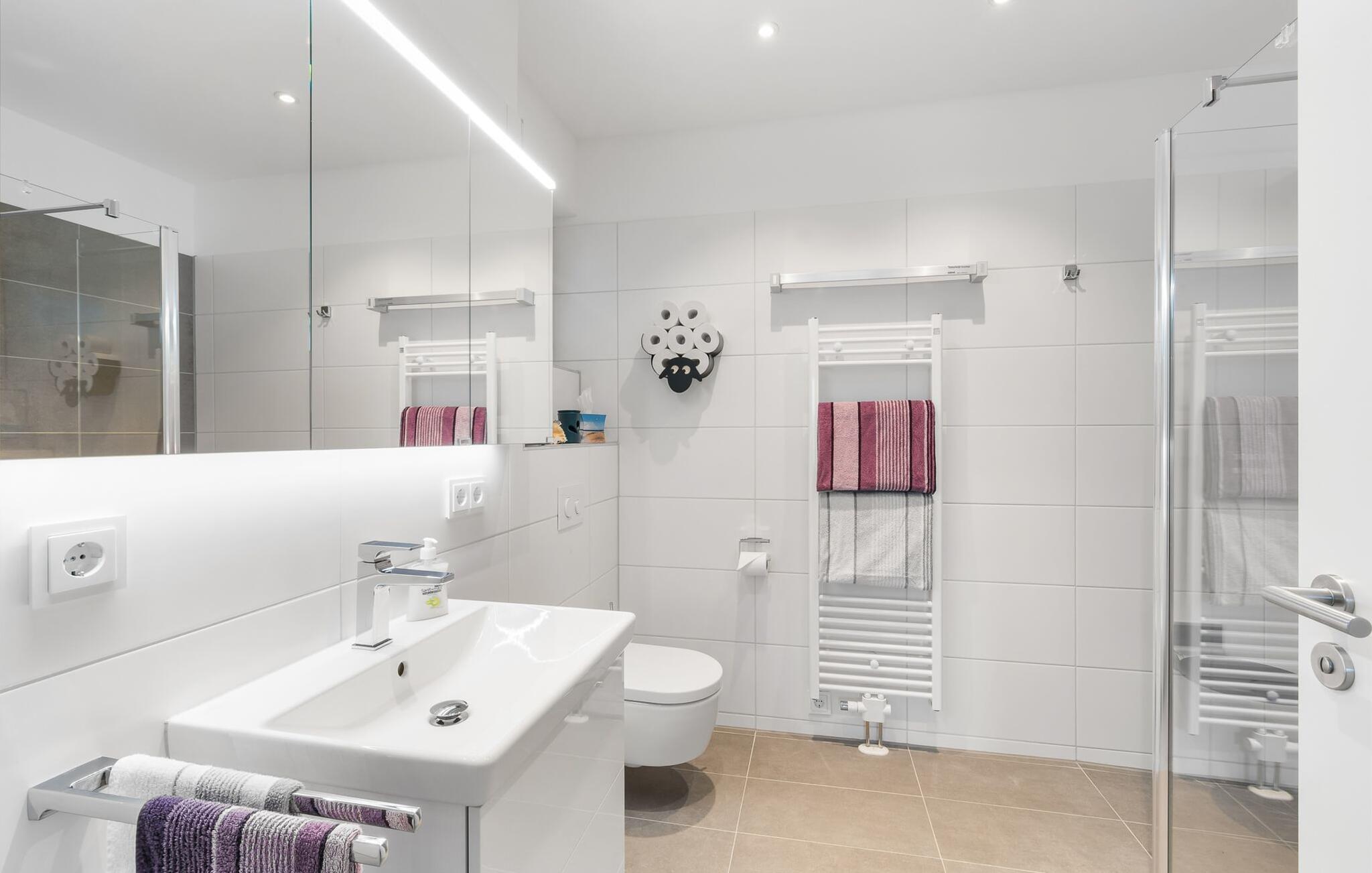 Im Bad erwartet euch eine große begehbare Dusche mit klappbarem Sitz, WC, Waschbecken mit Unterschrank, ein großer Spiegelschrank, Kosmetikspiegel, Föhn, Handtuchheizkörper, die Waschmaschine und ein ausziehbarer Wand-Wäschetrockner.
