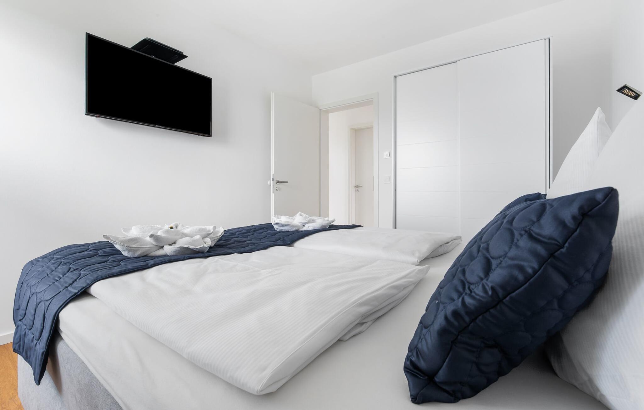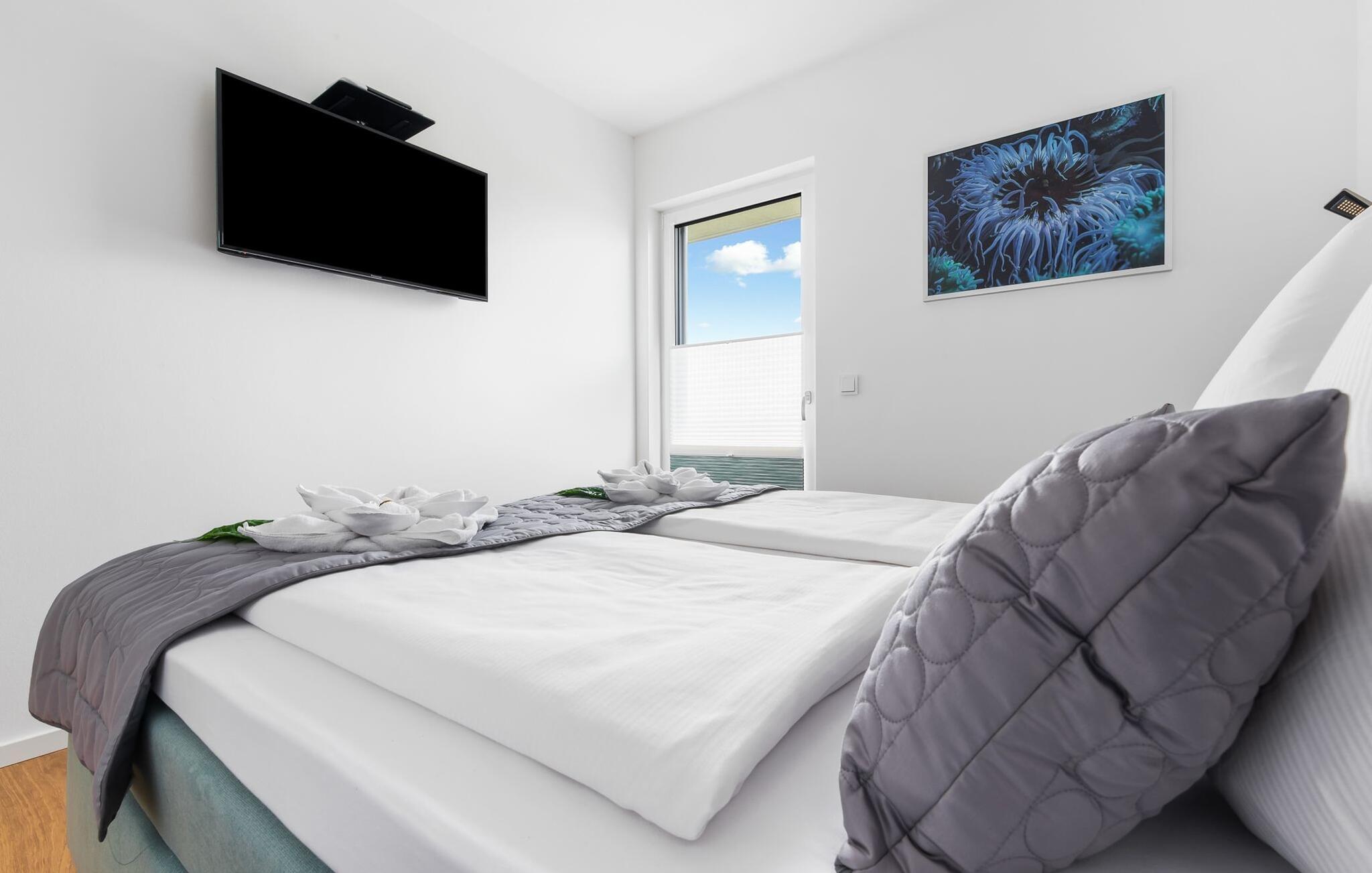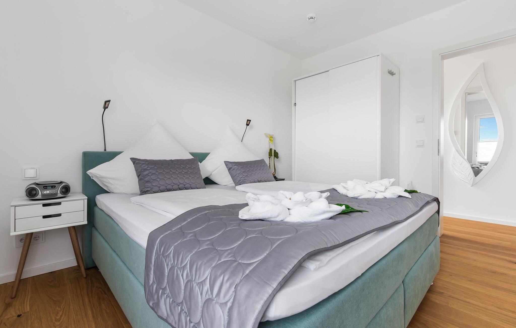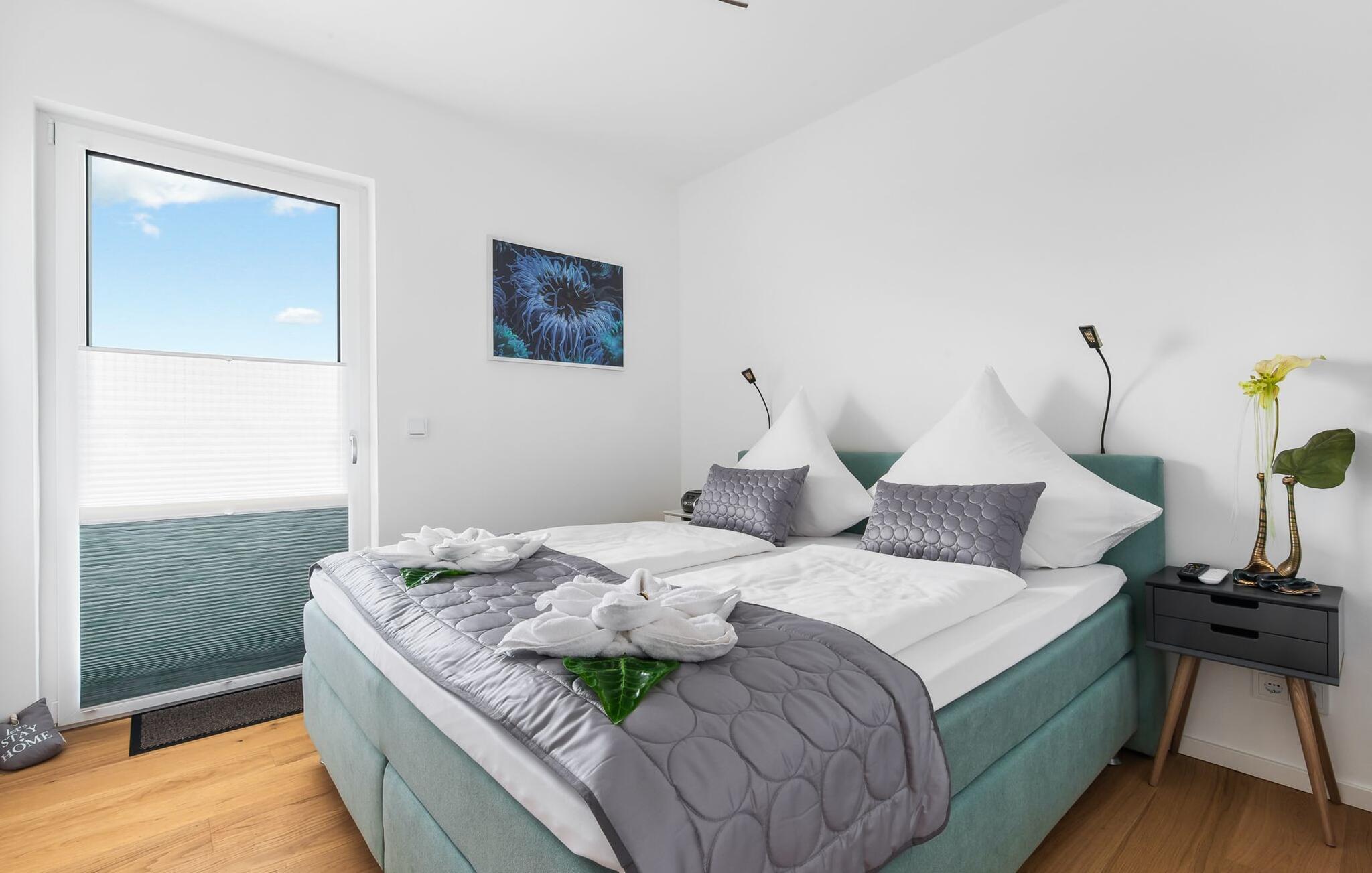 Herrlich träumen könnt ihr auch in den beiden Schlafzimmern, die jeweils mit einem bequemen Boxspringbett (180 cm x 200 cm), Wohlfühltopper, zusätzlicher Hygienebettwäsche, Leselampen, geräumigen Kleiderschrank, Verdunklungsplissees, Flachbildschirm und schiebbarem Insektenschutzgitter ausgestattet sind. Von beiden Schlafräumen habt ihr Zugang zur möblierten Westterrasse.