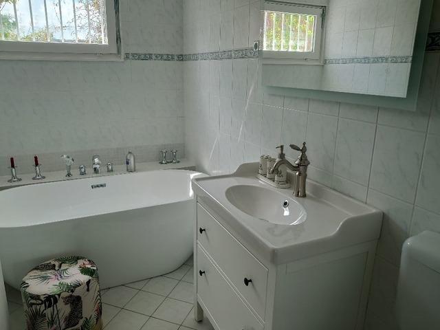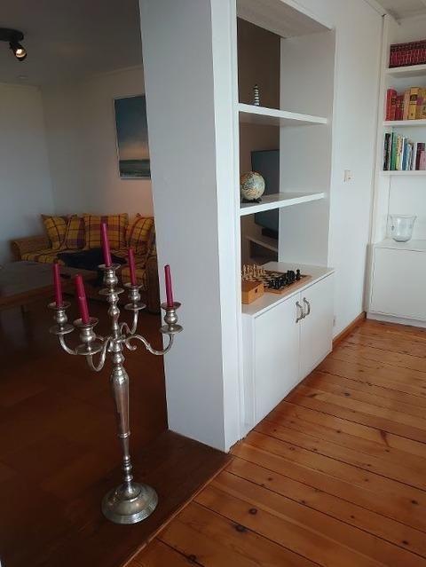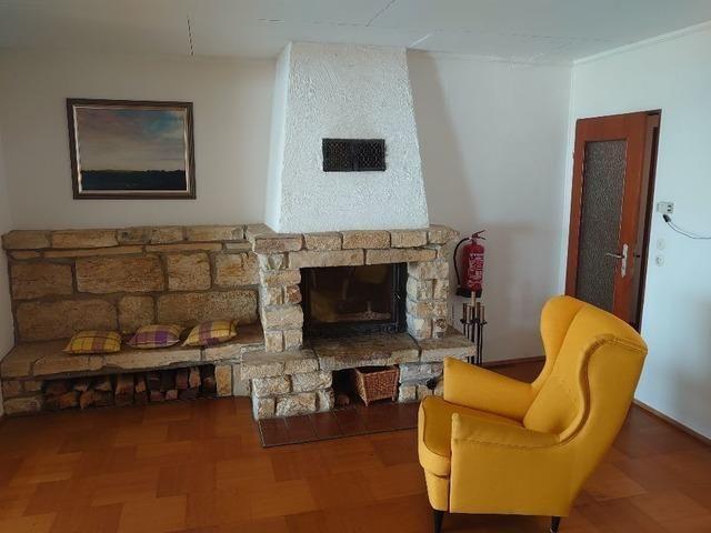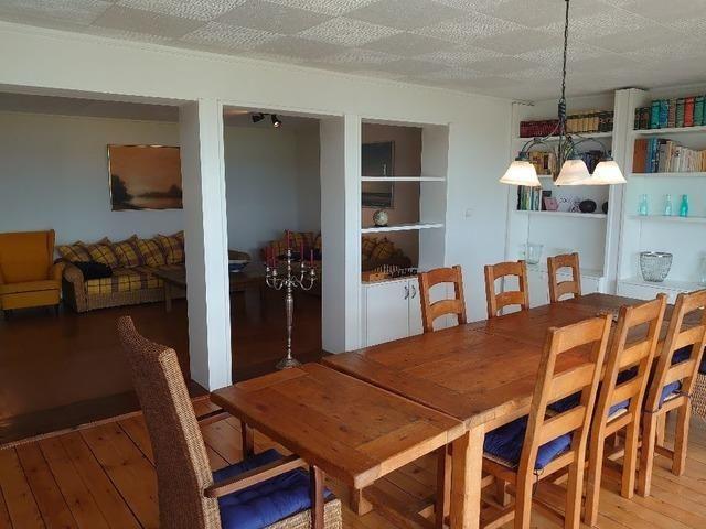 Bad und ein Gäste-WC, ein großes Wohnzimmer mit Sitzecke und Kamin . Von dort gelangen Sie durch eine breite Tür in den großzügigen Essbereich. Sie haben dann einen direkten Meerblick, den Sie auch von der sich anschließenden Terrasse genießen können.