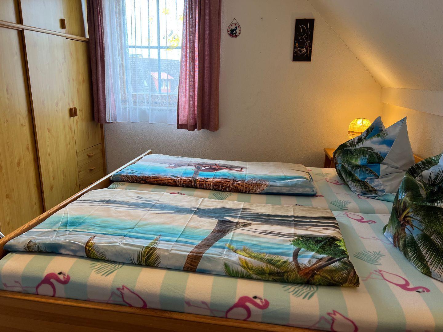 Doppelbett und großem Kleiderschrank, zus. für ein Kind ein aufklappbares Einzelbett finden Sie im Schlafzimmer vor.