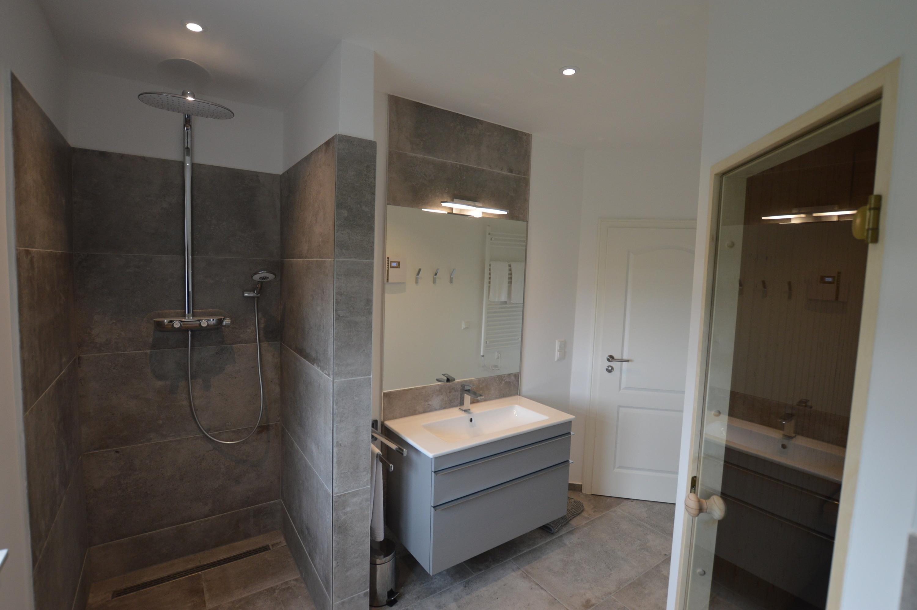 Ihre Sauna ist durch Ihr ansprechendes Duschbad erreichbar.