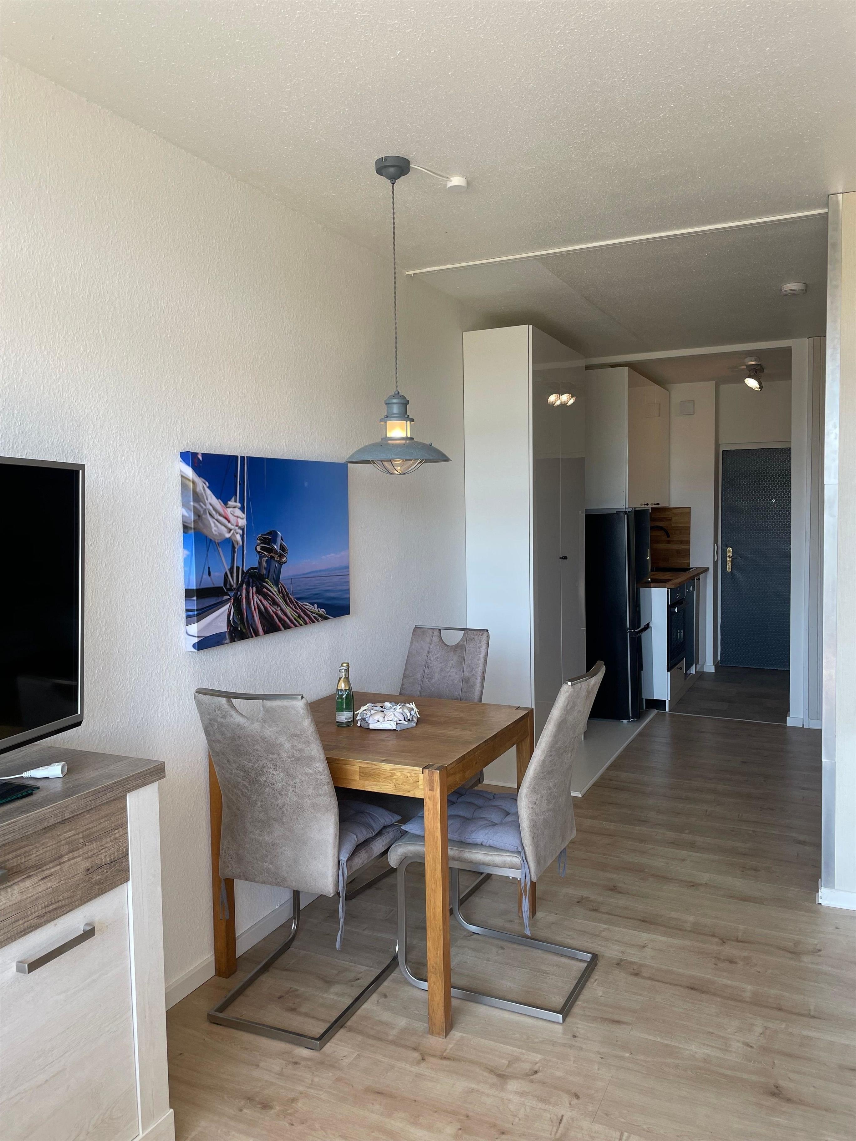 Nach dem Betreten des Apartments im Erdgeschoss befindet ihr euch in der 2023 frisch renovierten Küche mit offenem Blick in das restliche Apartment. Auf Geschirrspüler, Backofen und alle Annehmlichkeiten die Ihr von zu Hause kennt müsst ihr nicht verzichten. Ausgestattet mit vollständigem Geschirr, Kochutensilien, Gewürzen, Nespresso Maschine usw.