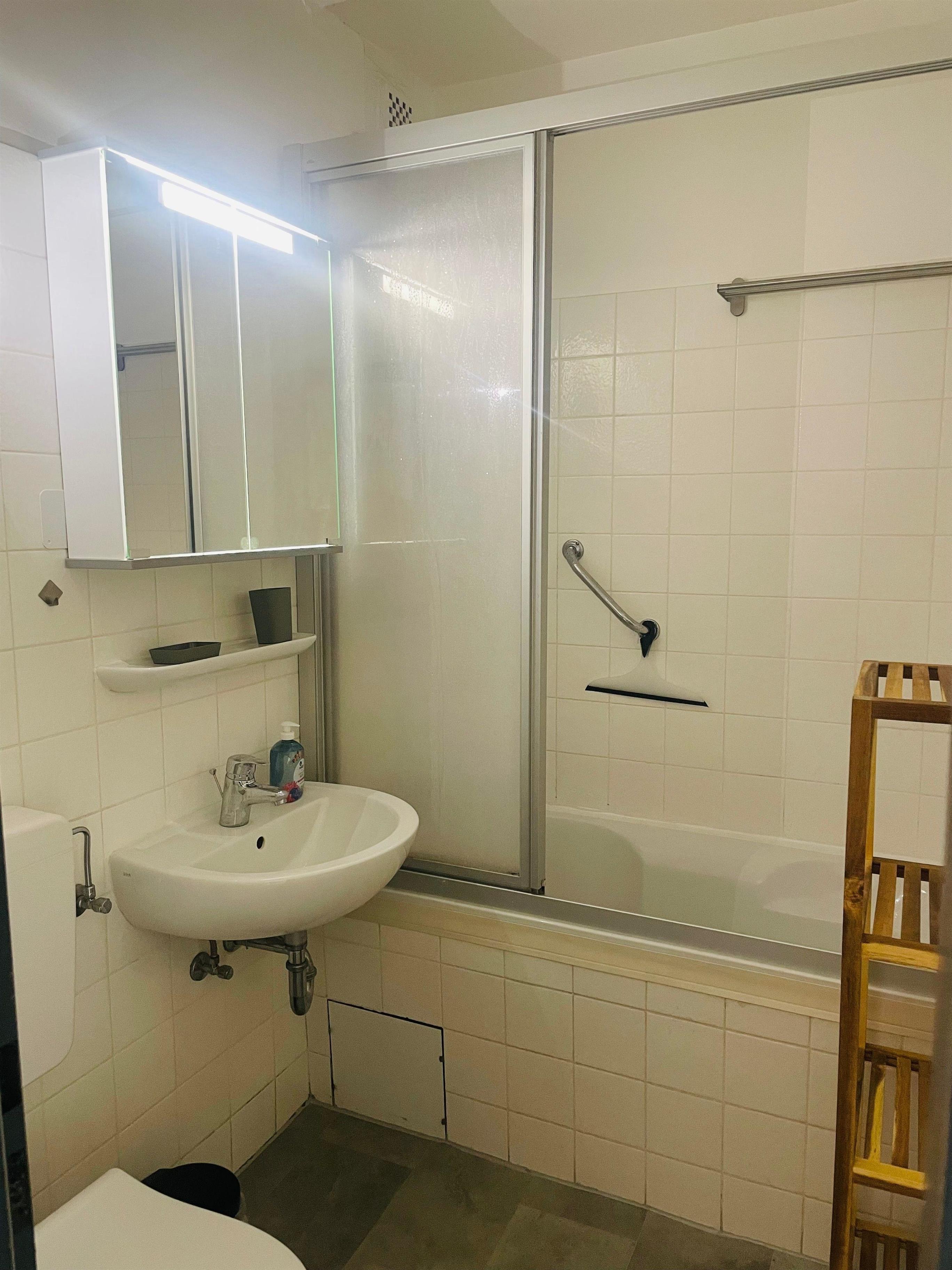 Im Badezimmer findet ihr eine Badewanne mit Duschtrennwand.