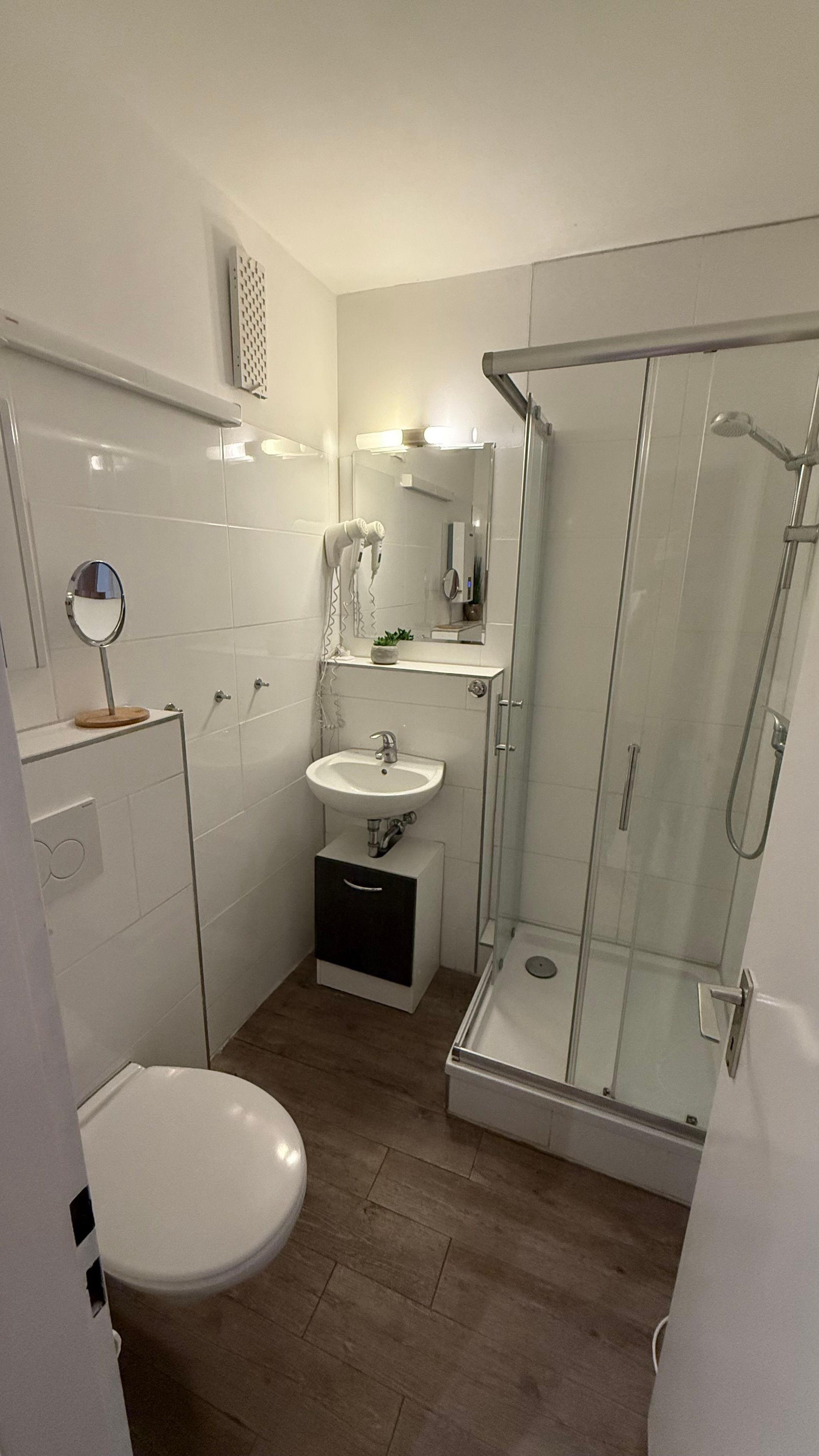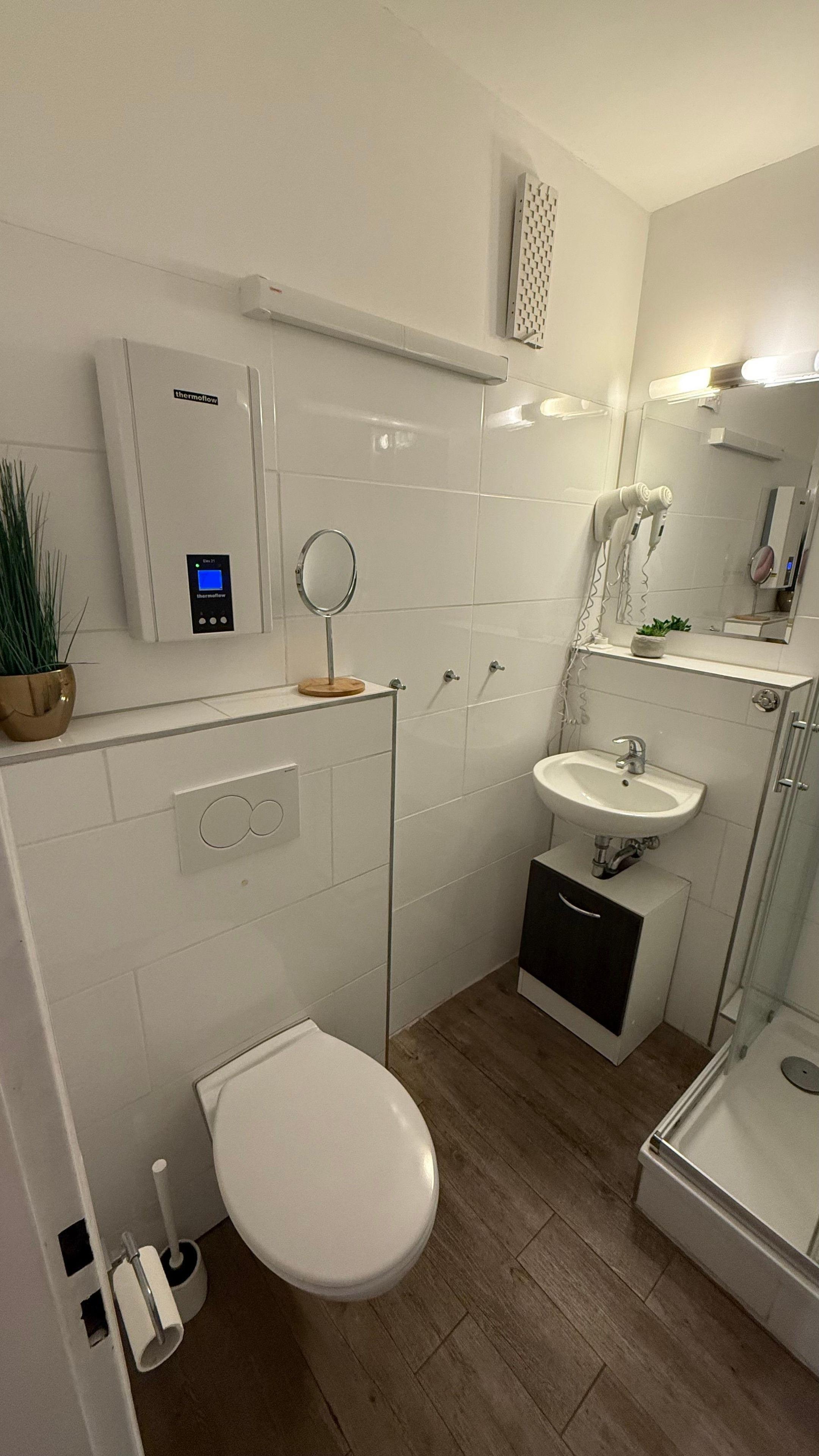 Das Duschbad ist hell und modern. Sie finden einen Schrank und Ablageflächen; selbst Ihren Fön können Sie zuhause lassen. Ein Handtuch-Heizkörper und eine Wäschespinne sind vorhanden.