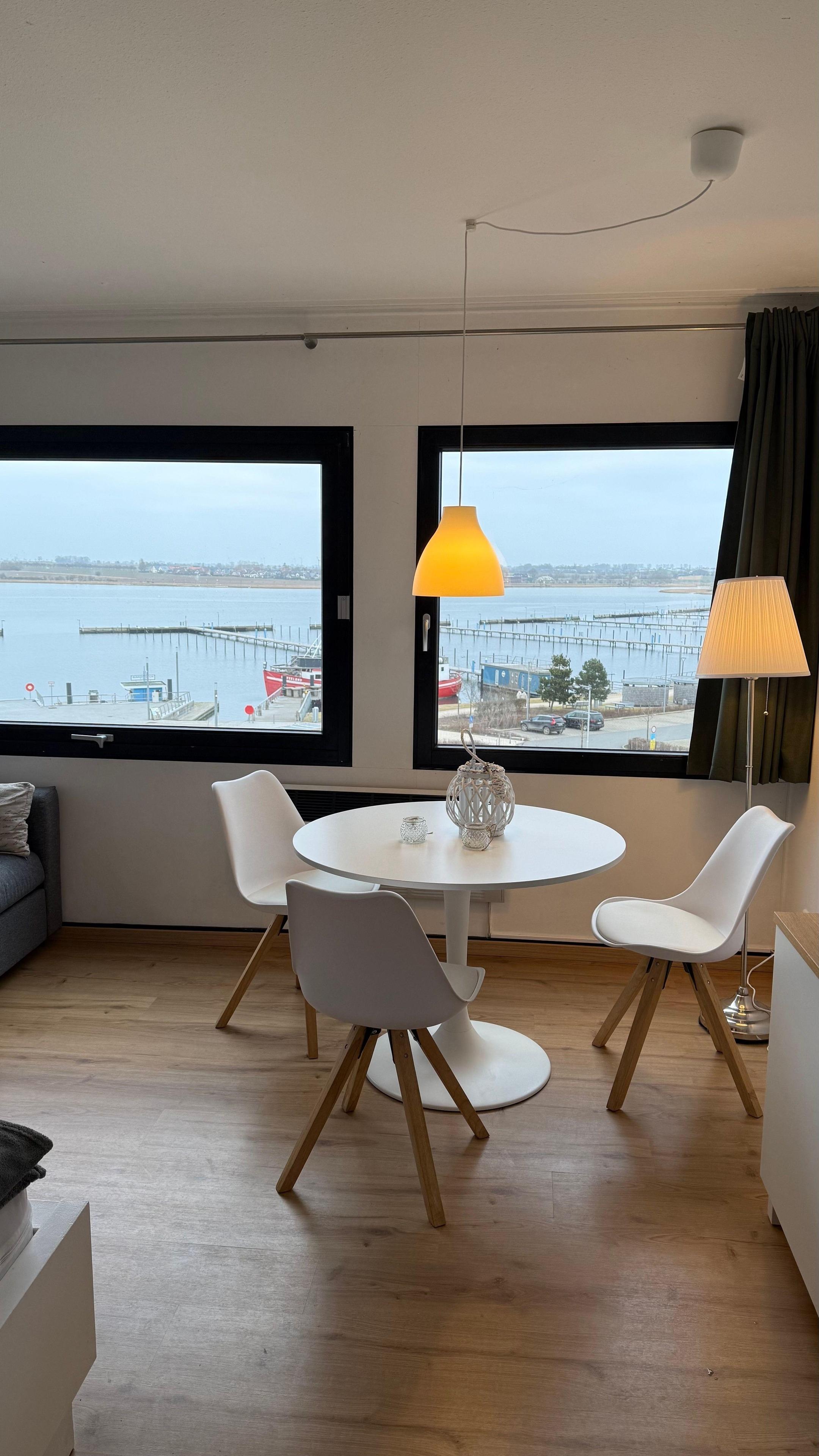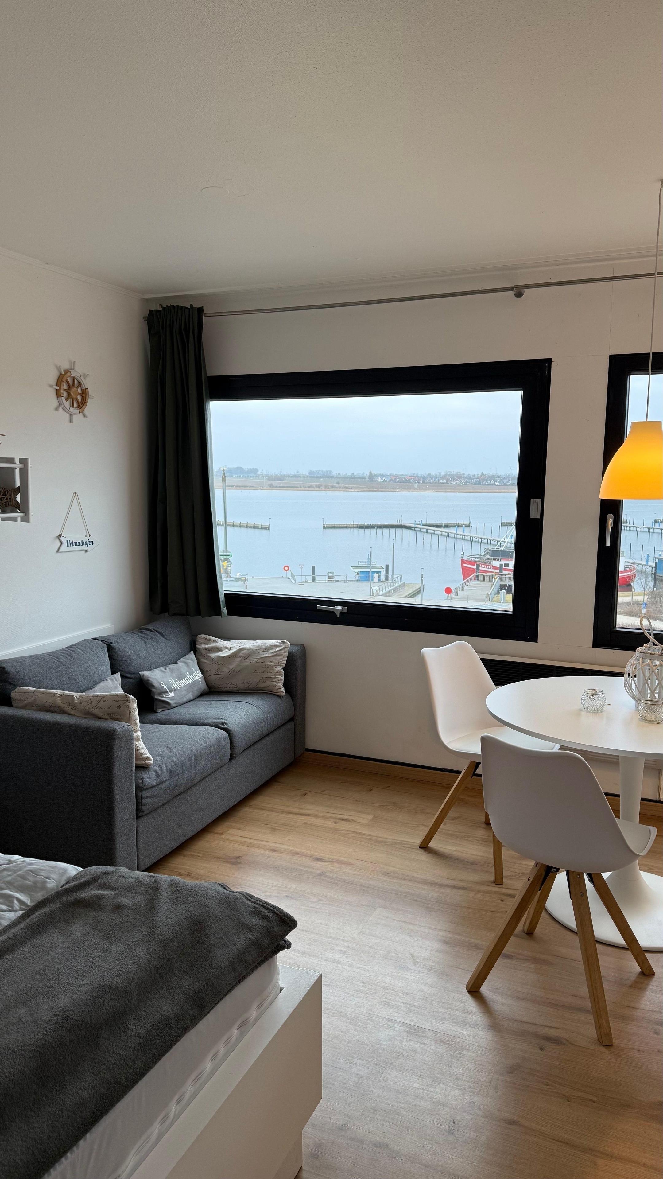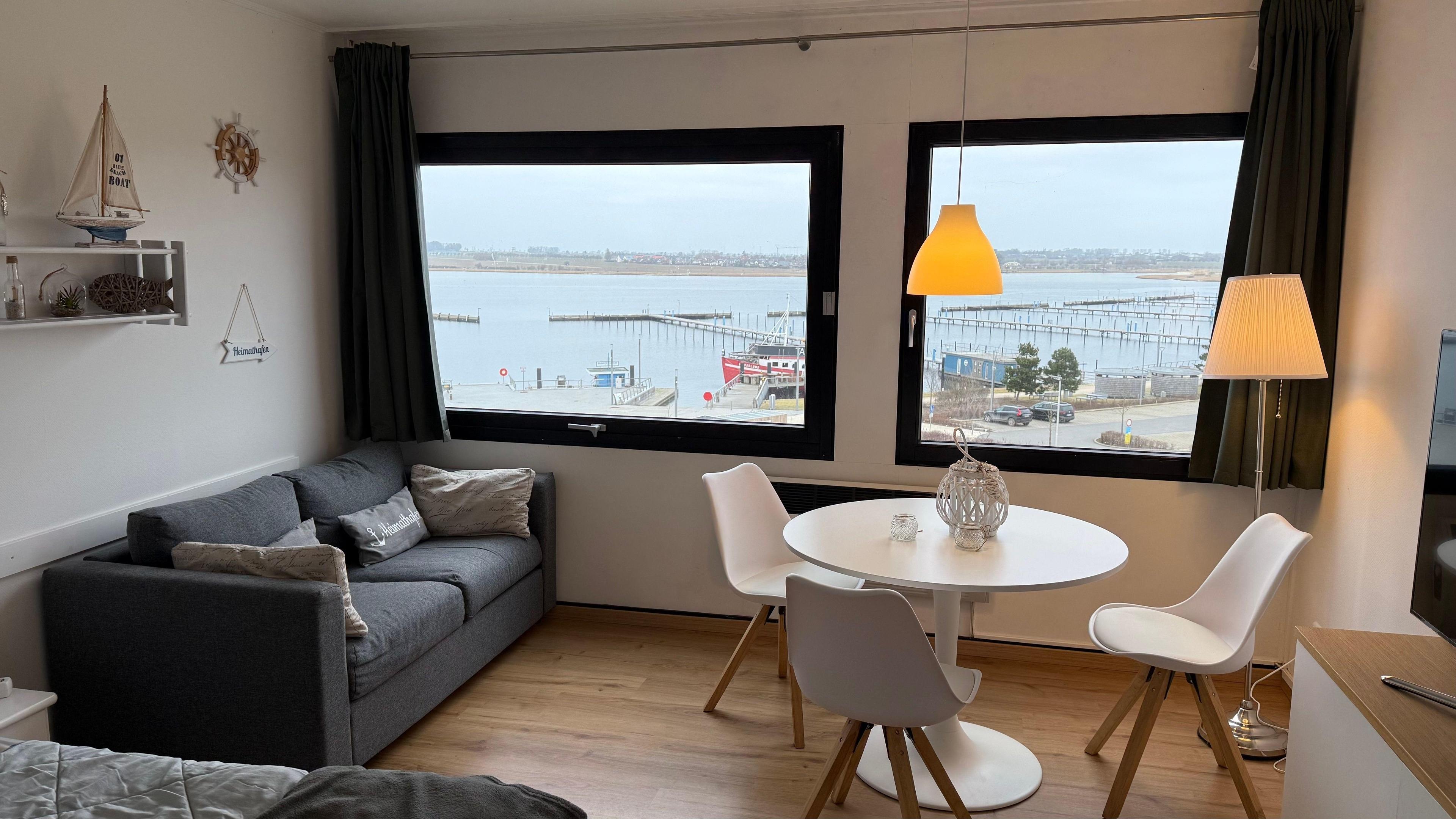 Mit dem Fahrstuhl in die 4. Etage (Endetage). Dort erwartet Sie ein gepflegtes und gemütlich eingerichtetes Appartement mit herrlichem Blick auf den Yachthafen.