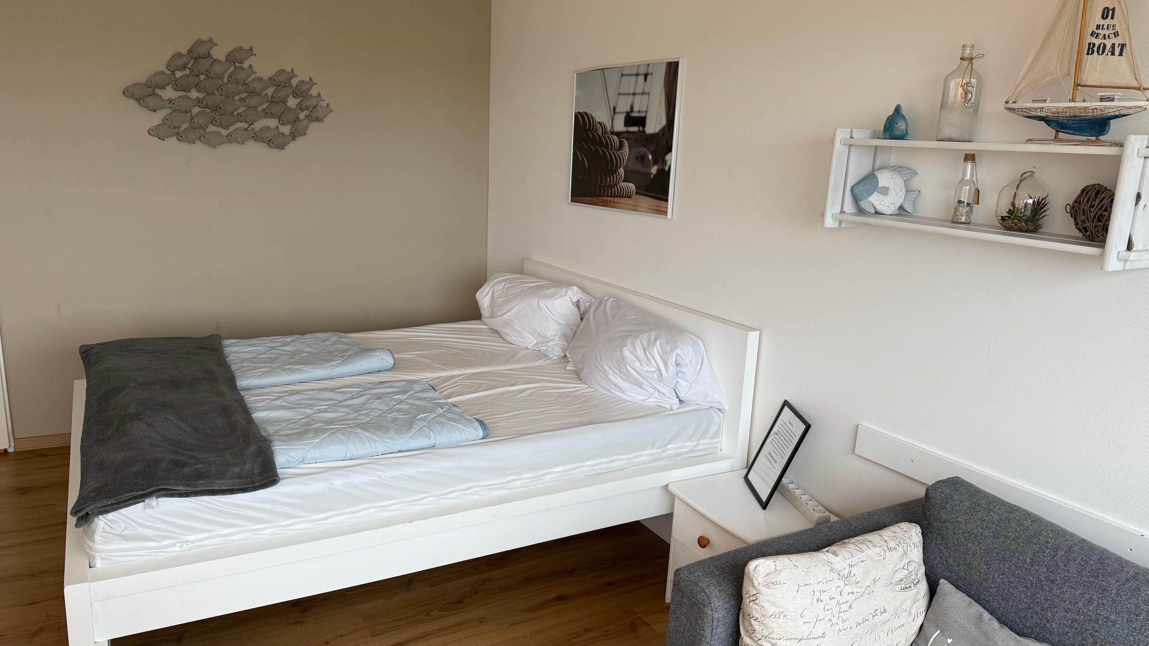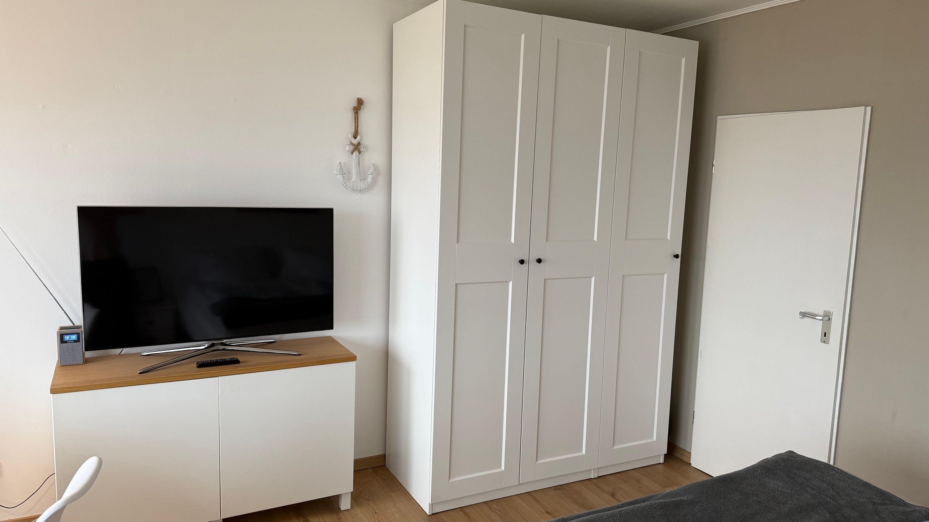 Der Wohn-/Schlafraum ist liebevoll dekoriert. Er verfügt über ein bequemes Doppelbett, unter das Sie Ihr Gepäck schieben können,und dazugehörigen Nachtschränken, ein kleines Schlafsofa mit Couchtisch, einen geräumigen Kleiderschrank mit ausreichend Bügeln, einer Essgruppe mit ausziehbarem Tisch und passenden Stühlen. In einem Hängeschrank befinden sich Gläser und Kaffeebecher und auf Borden eine Anzahl Lesestoff. Ein TV, ein CD-Player und ein kleines Radio fehlen auch nicht. Sollte es draussen kalt sein: Im App. brauchen Sie dank einem Heizkörper nicht zu frieren.