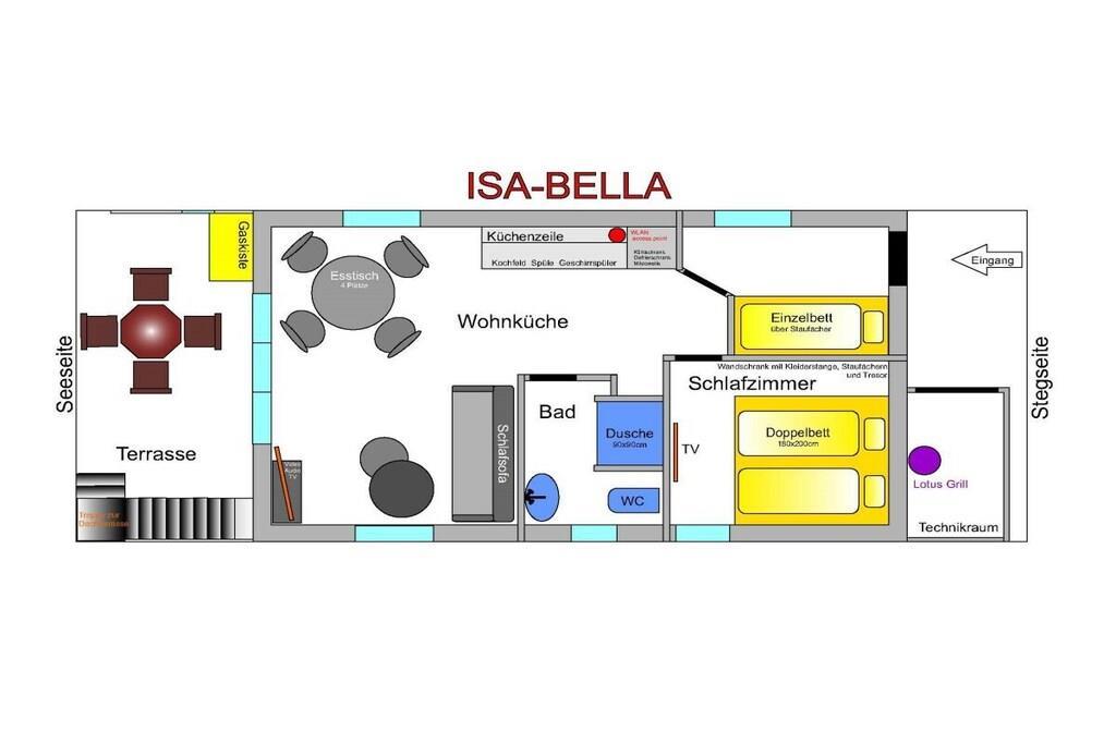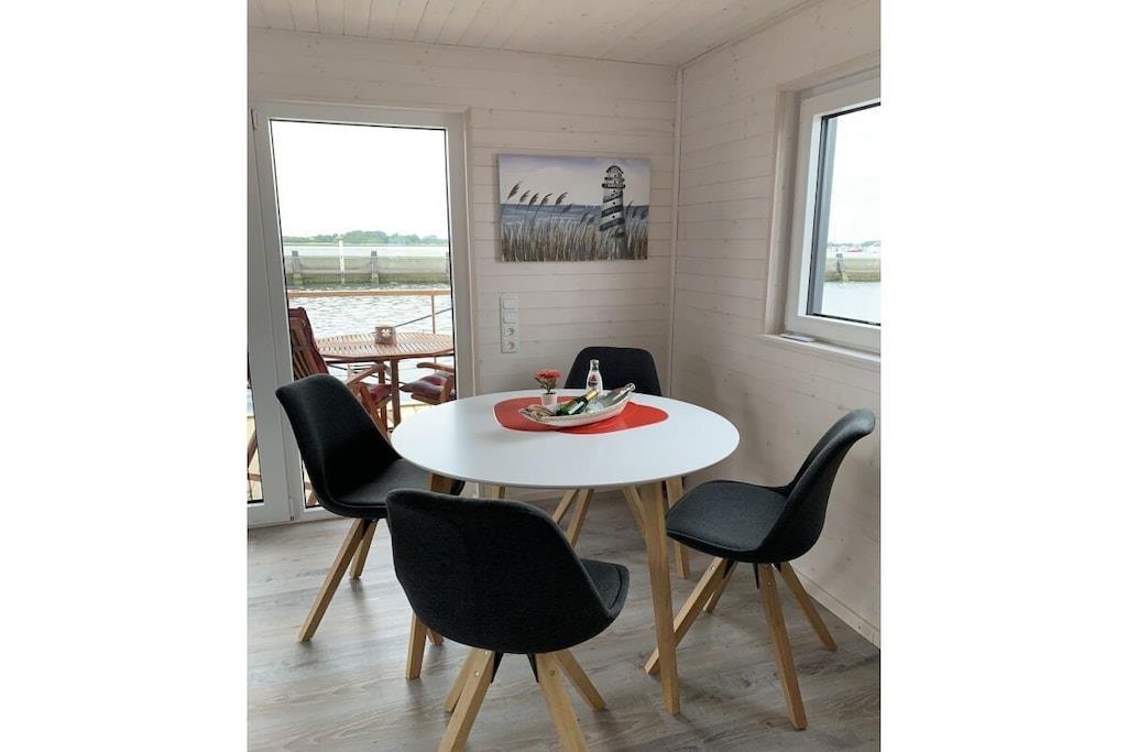 Komfortables Hausboot in Burgtiefe mit Terrasse, WLAN und voll ausgestatteter Küche für einen erholsamen Urlaub auf dem Wasser.