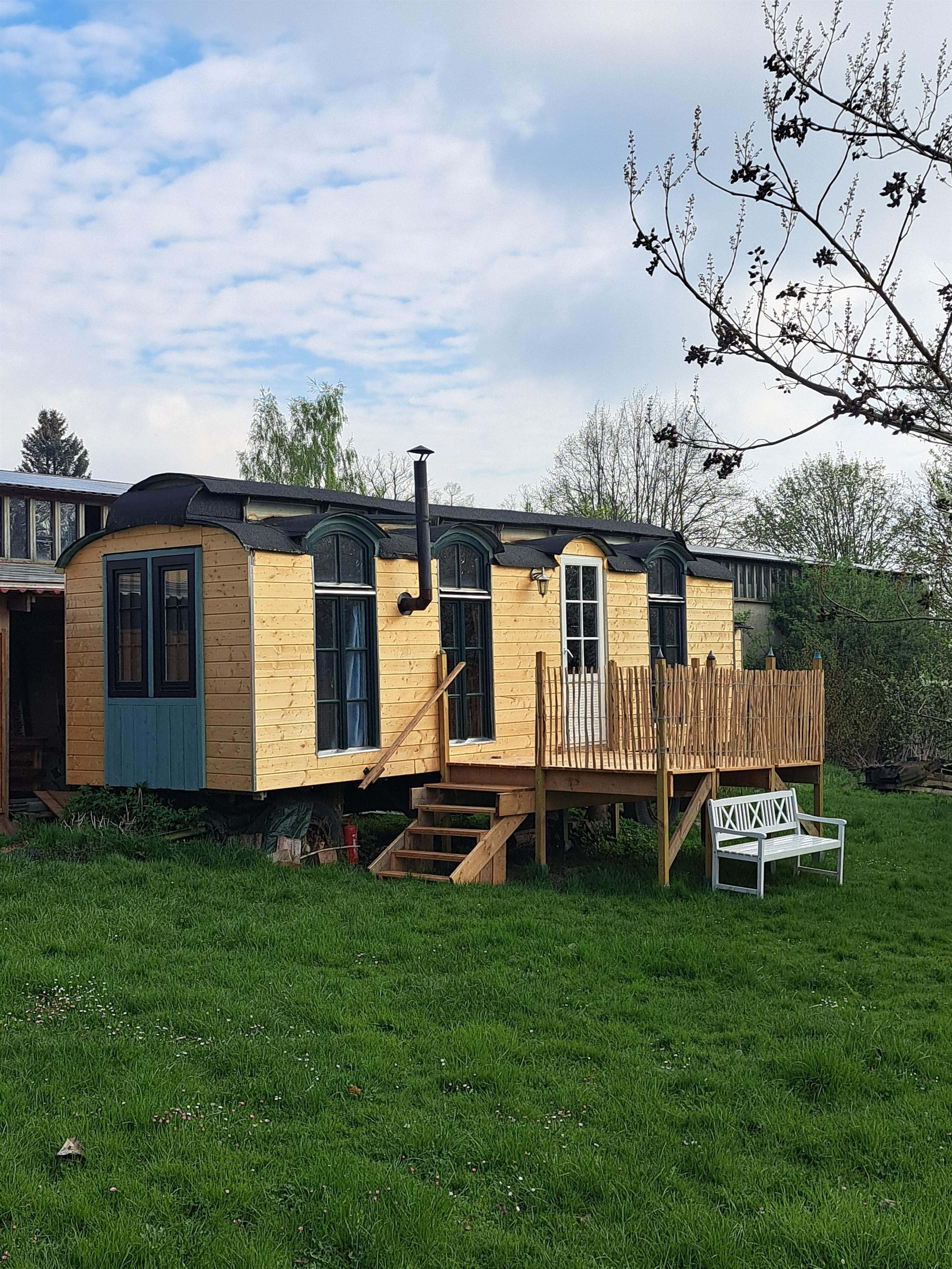 Bei schönem Wetter spielt sich eh alles im Freien ab. Auf der Wiese vor dem Wagen kann man frühstücken, sich sonnen, mit den Kindern spielen oder ein Buch lesen. Schatten spenden im Hochsommer die benachbarten Bäume