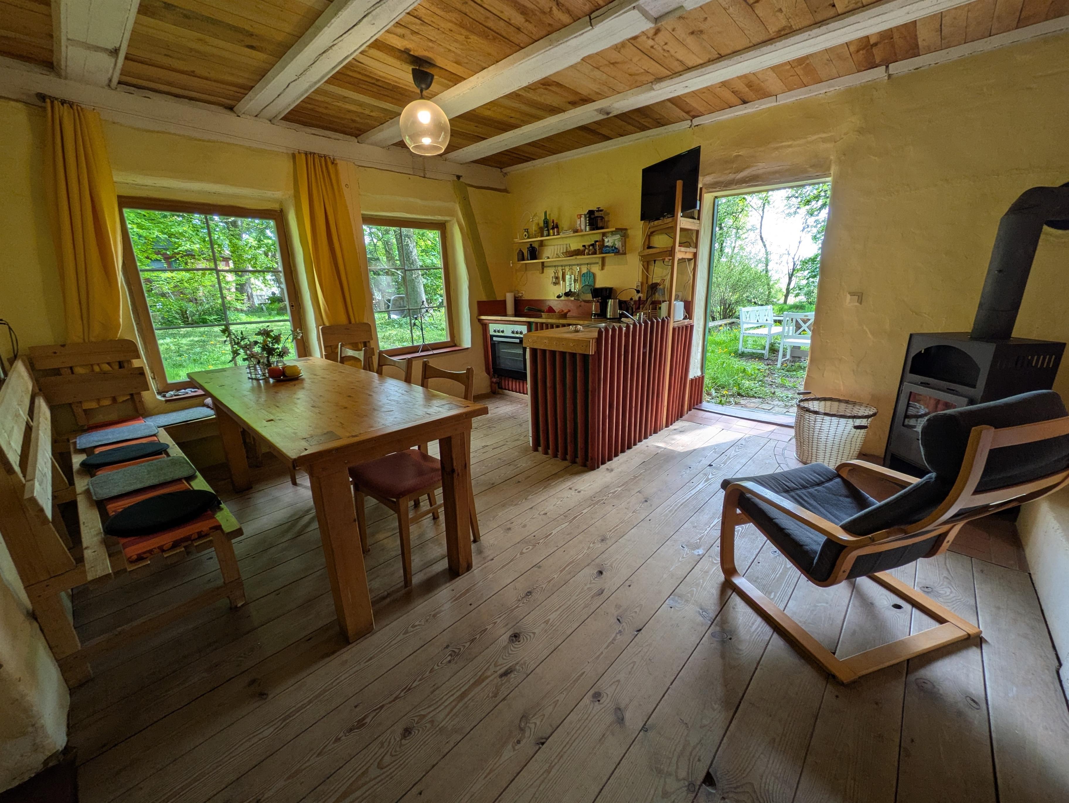 ?Die Wohnküche? Geräumig genug, um sich nicht gleich auf die Füße zu treten – und vollgestopft mit allem, was du brauchst. Der Esstisch ist groß. Richtig groß. Ideal für gemeinsame Mahlzeiten oder um einfach mal weit weg von den Plagen zu sitzen.