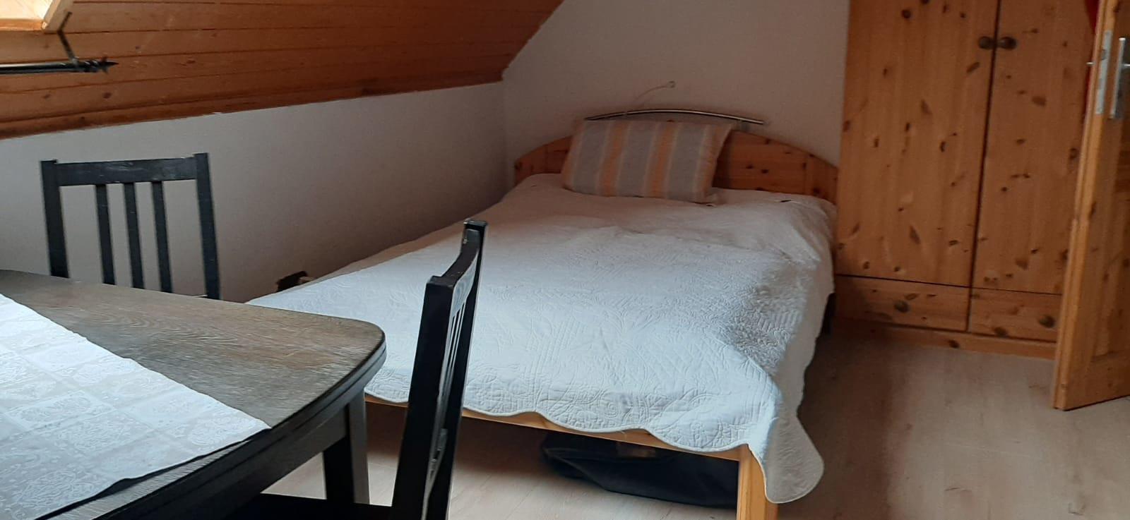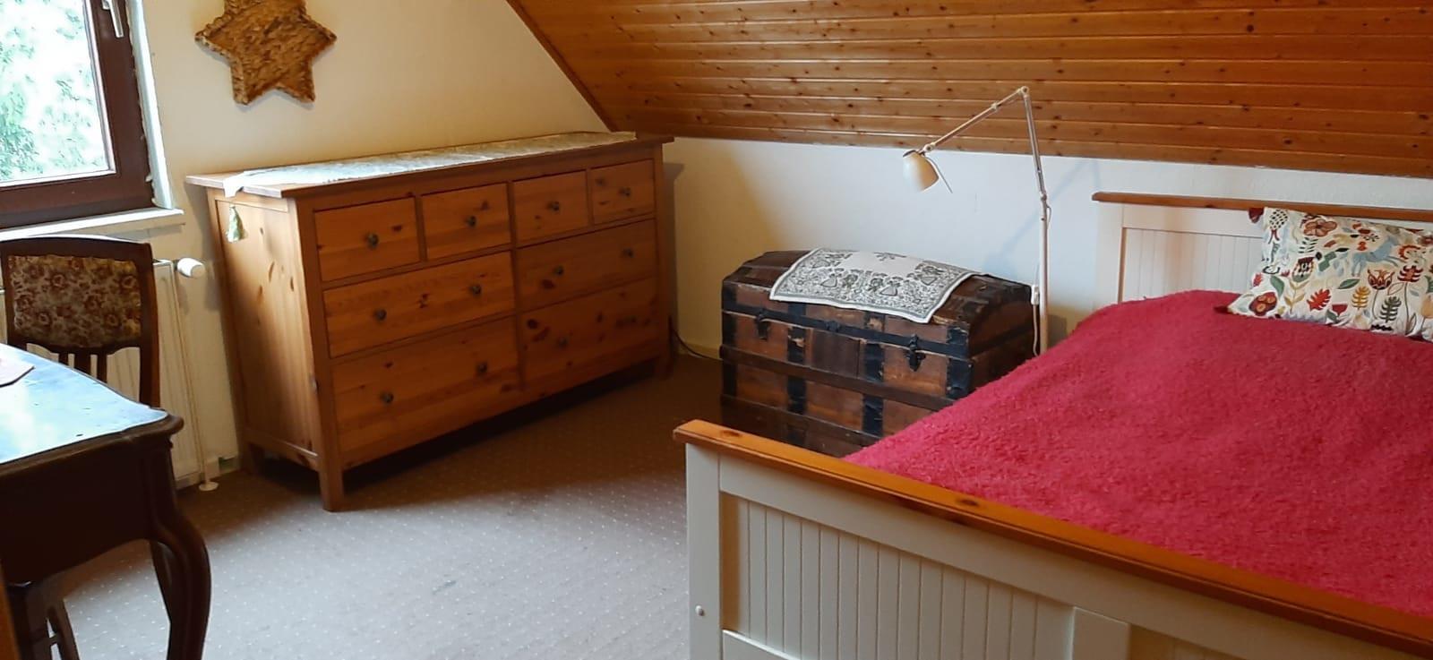 Die Ferienunterkunft befindet sich im Dachgeschoss unseres Einfamilienhauses und ist über den gemeinschaftlich genutzten Flur und eine hölzerne Treppe erreichbar. Hier befinden sich drei Schlafzimmer, sowie ein Gästebad mit Dusche, Waschbecken und WC als auch eine Miniküche.