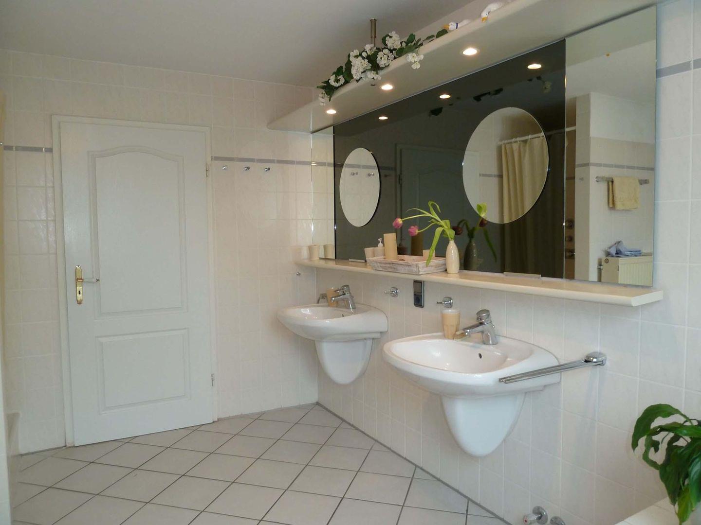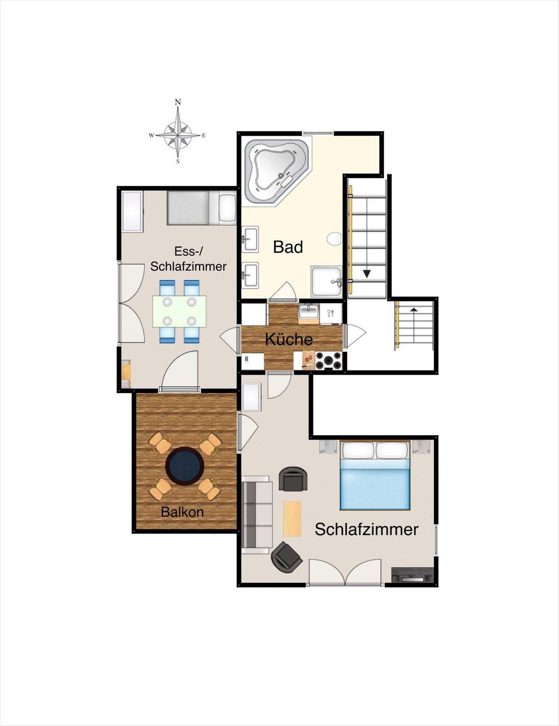 Die Ferienwohnung befindet sich im 1. OG eines 2-Familienhauses. Die beiden Räume (20 und 27 qm) bieten Schlafmöglichkeiten sowie Wohn- und Essgelegenheiten. Bei der Belegung mit 2 Personen ist das Bett im Esszimmer eine gemütliche Kuschelecke, bei der Belegung mit 3 Personen ein vollwertiges Bett. Das 16qm große Bad lädt zum Wohlfühlen ein mit Whirlpool, 2 Waschbecken und einer Komfortdusche mit mehreren Brausen.