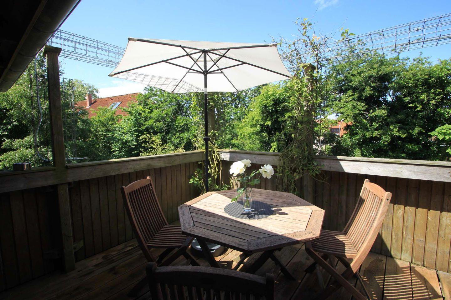 Ein Highlight der Wohnung ist die 12m² große, nach Süd-West ausgerichtete, windgeschützte Dachterrasse, die sowohl vom Ess- als auch vom Schlafzimmer betretbar ist. Sie ist ausgestattet mit Holzstühlen, Holztisch und Sonnenschirm und lädt zum Essen und Ausruhen in grüner Gartenatmosphäre ein.