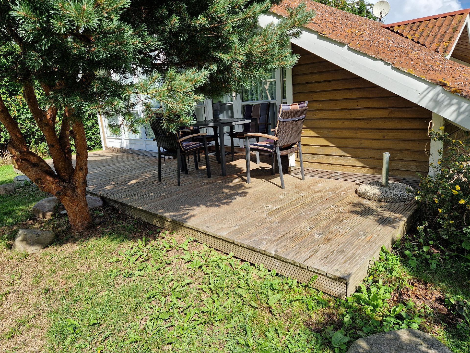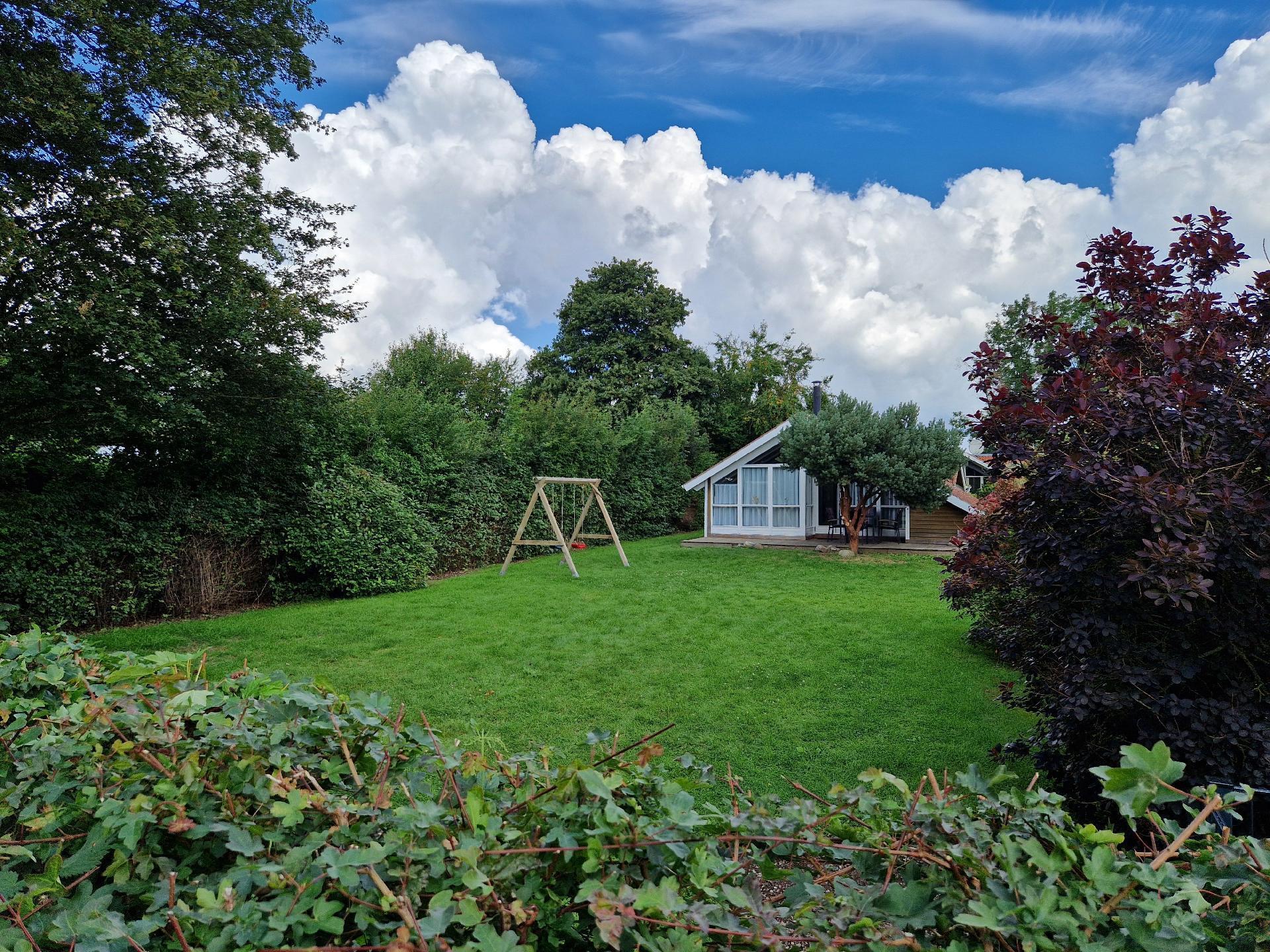 Um das Haus herum ist eine große Rasenfläche von ca. 600 qm, die sich für Rasenspiele aller Art gut eignet. Dort steht auch ein Schaukelgerüst mit zwei Schaukeln für die kleinen Gäste. Ein Sonnenschirm, Gartenstühle und ein Gartentisch sind vorhanden. Die Westseite des Grundstücks ist durch Bäume nachmittags zu einem kleinen Teil beschattet.