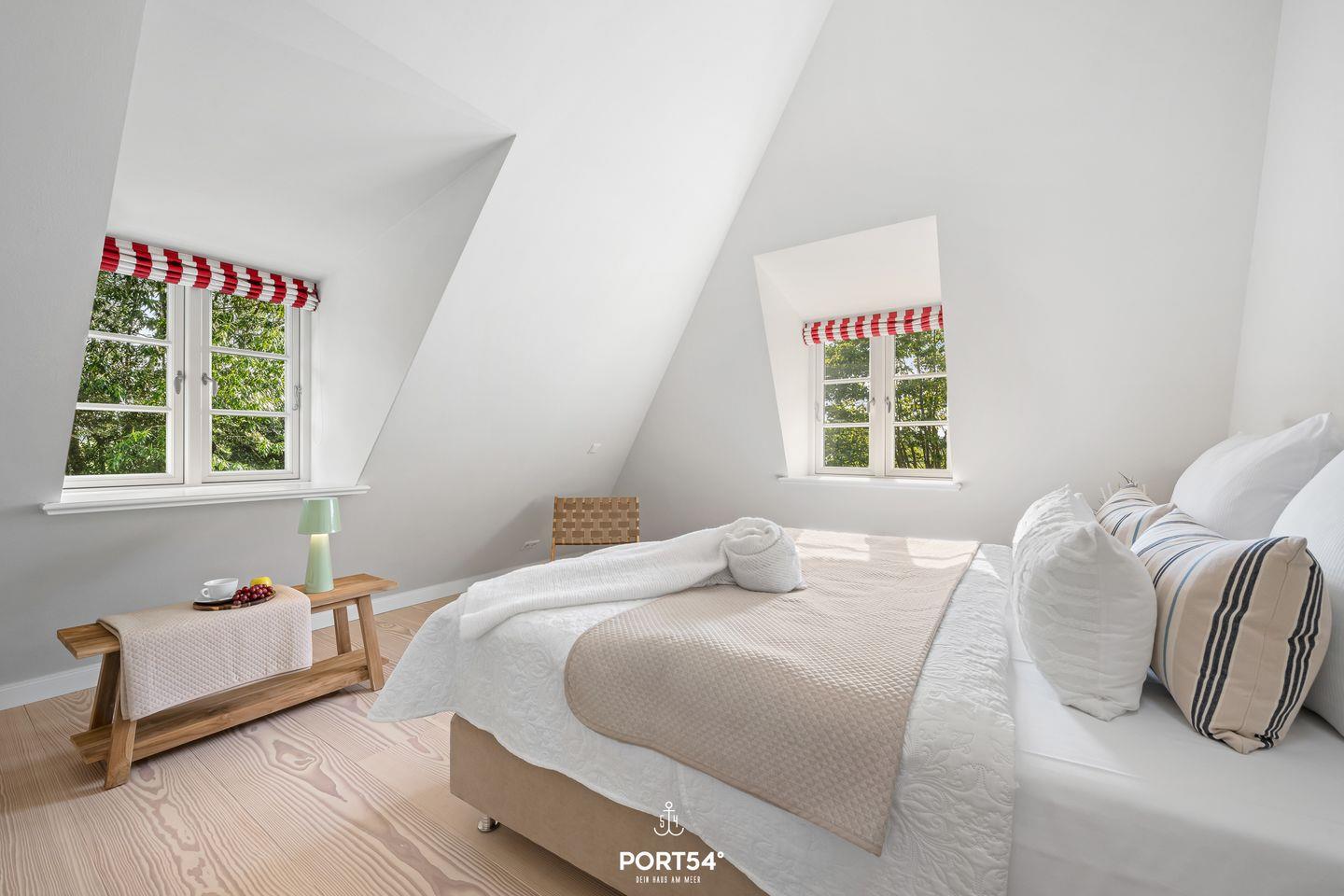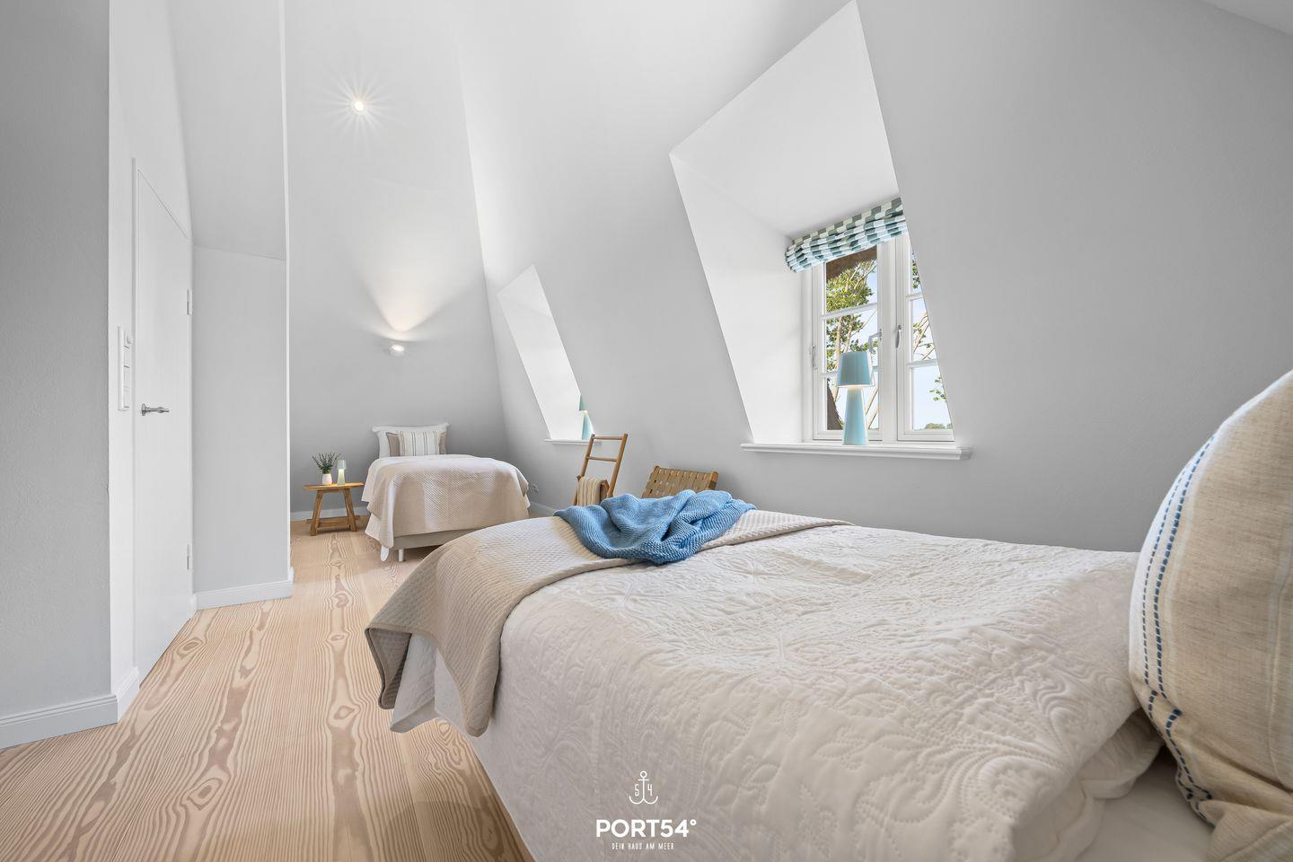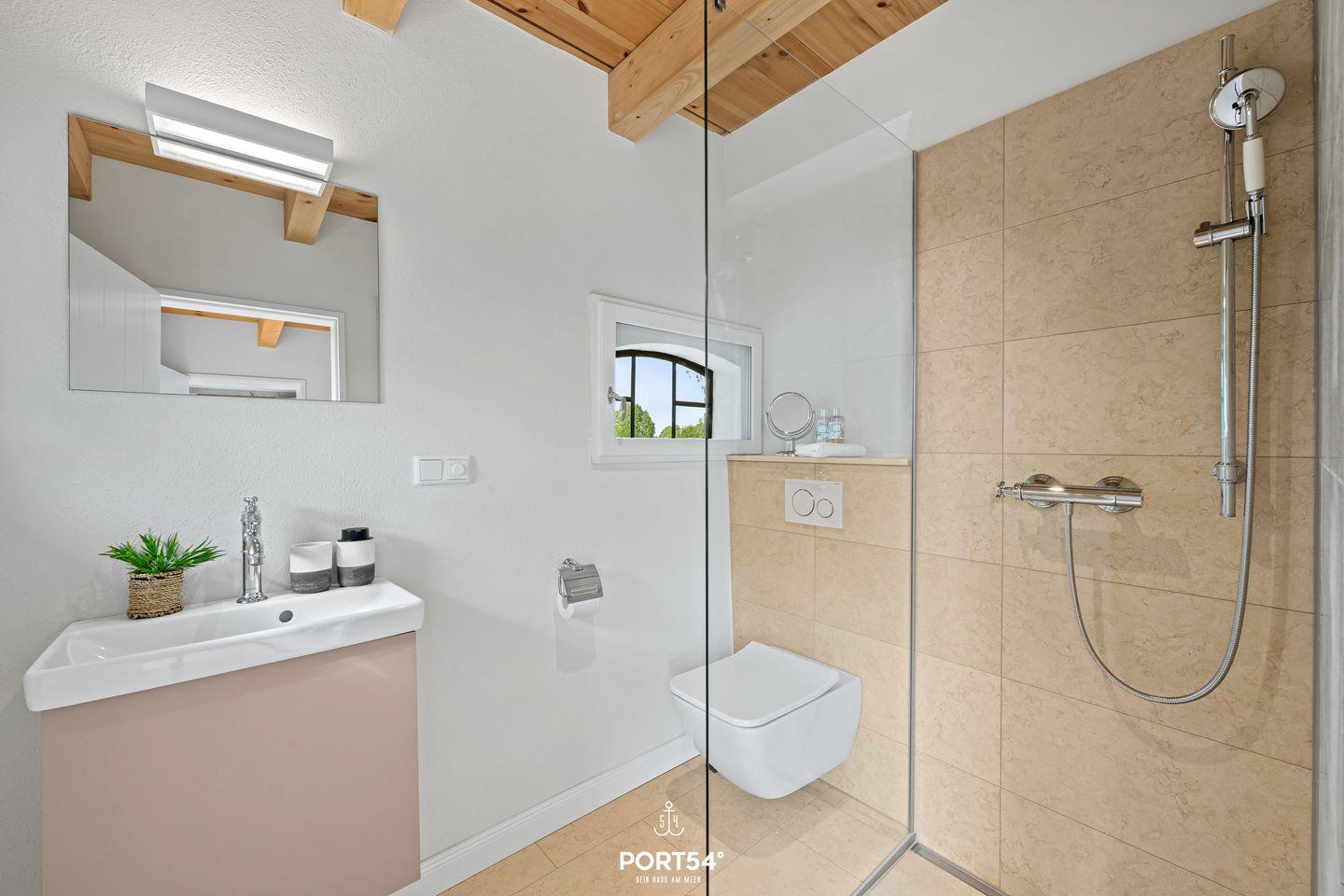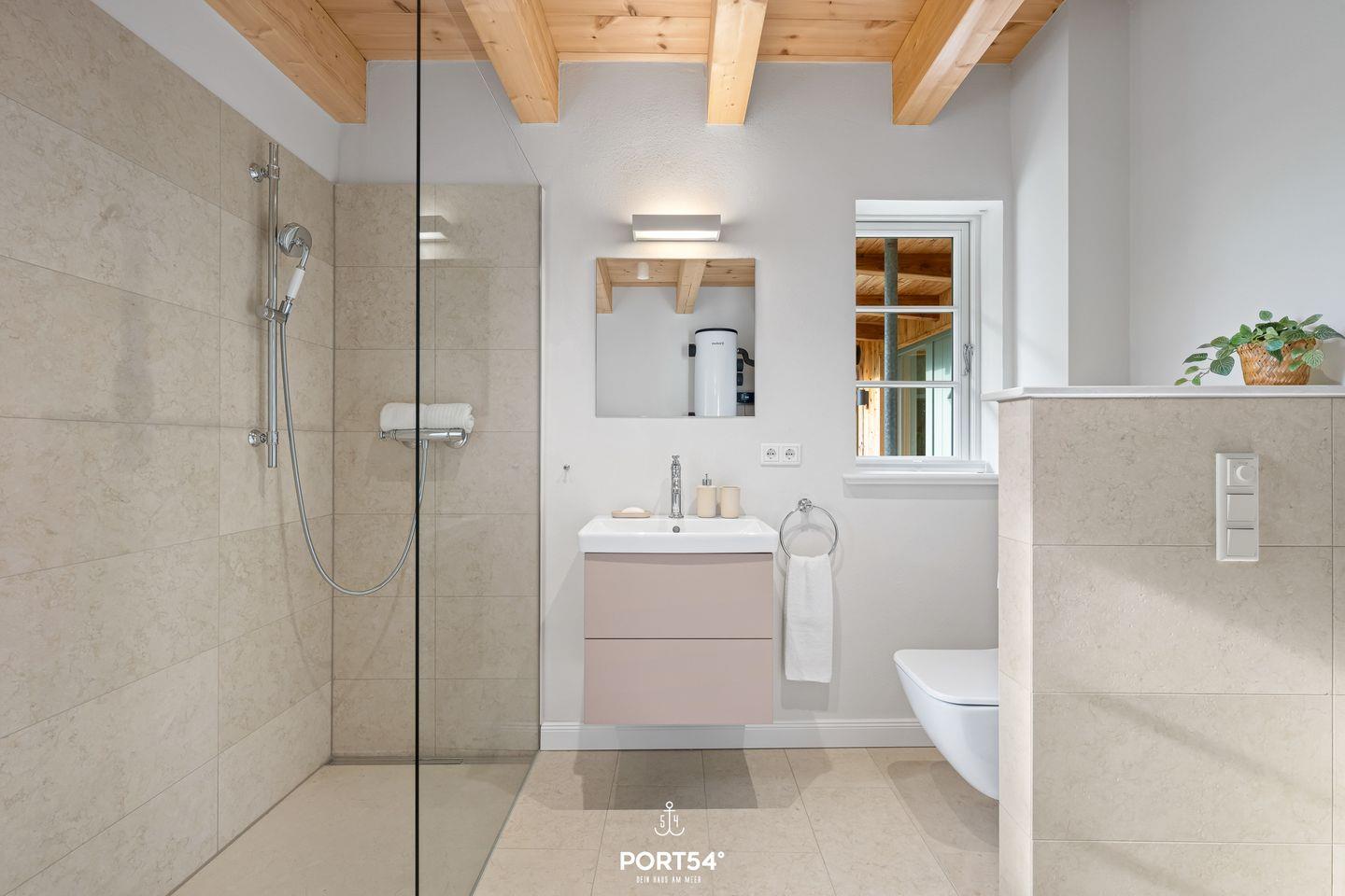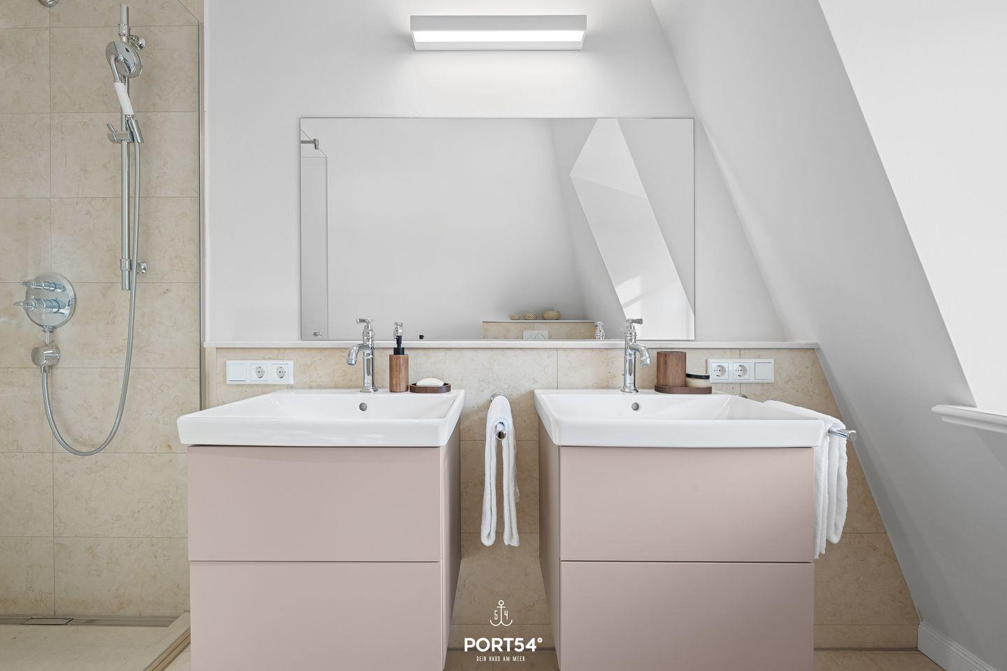 Die beiden Tageslichtbäder sind jeweils mit einer ebenerdigen Dusche ausgestattet, auch ein Föhn und ein Kosmetikspiegel sind vorhanden. Zwei Schlafzimmer befinden sich im Obergeschoss und sind mit vier Boxspring-Einzelbetten (90x200 cm) ausgestattet. Auch ein weiteres Duschbad mit Doppelwaschbecken steht Dir dort zur Verfügung.