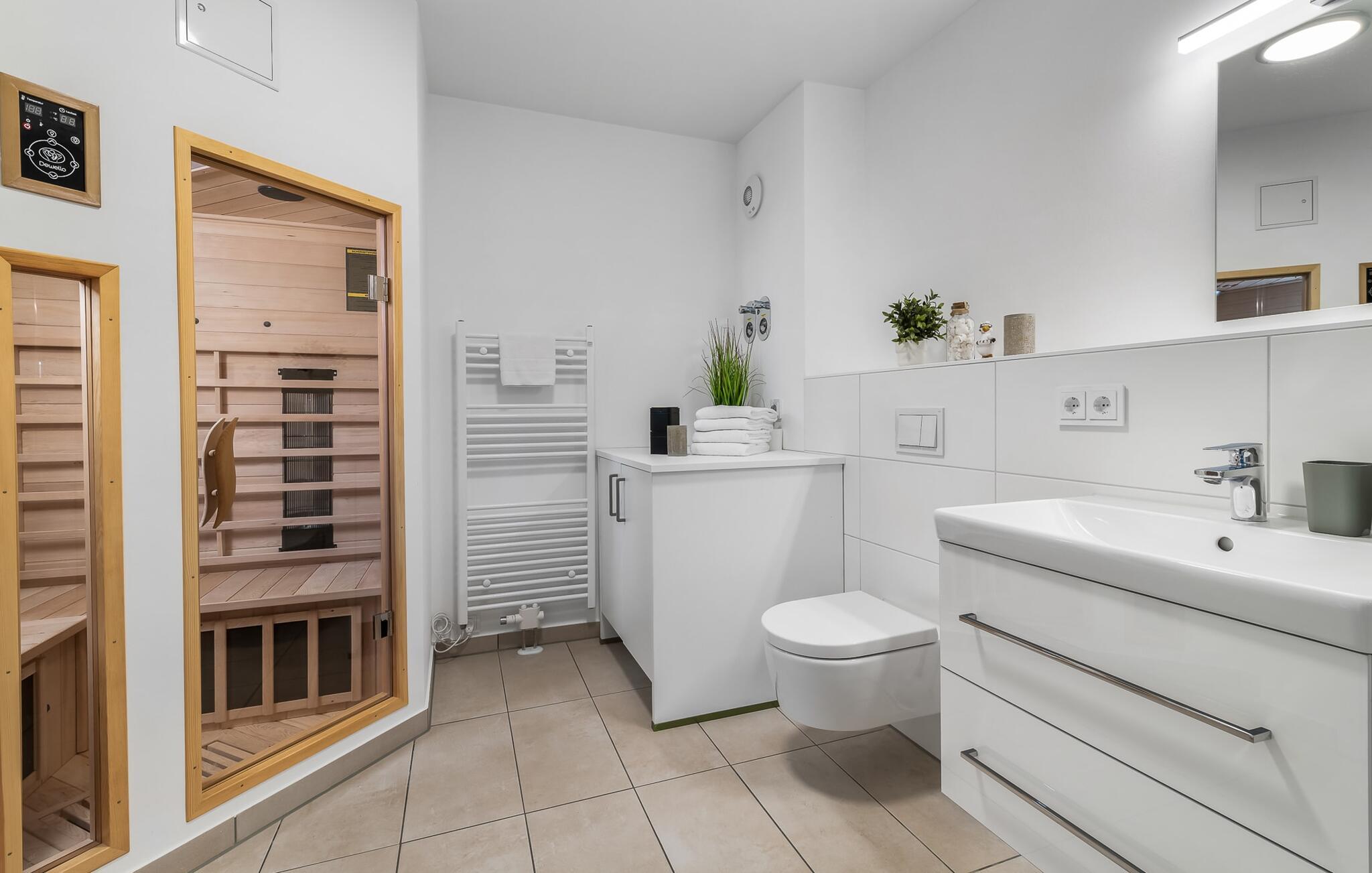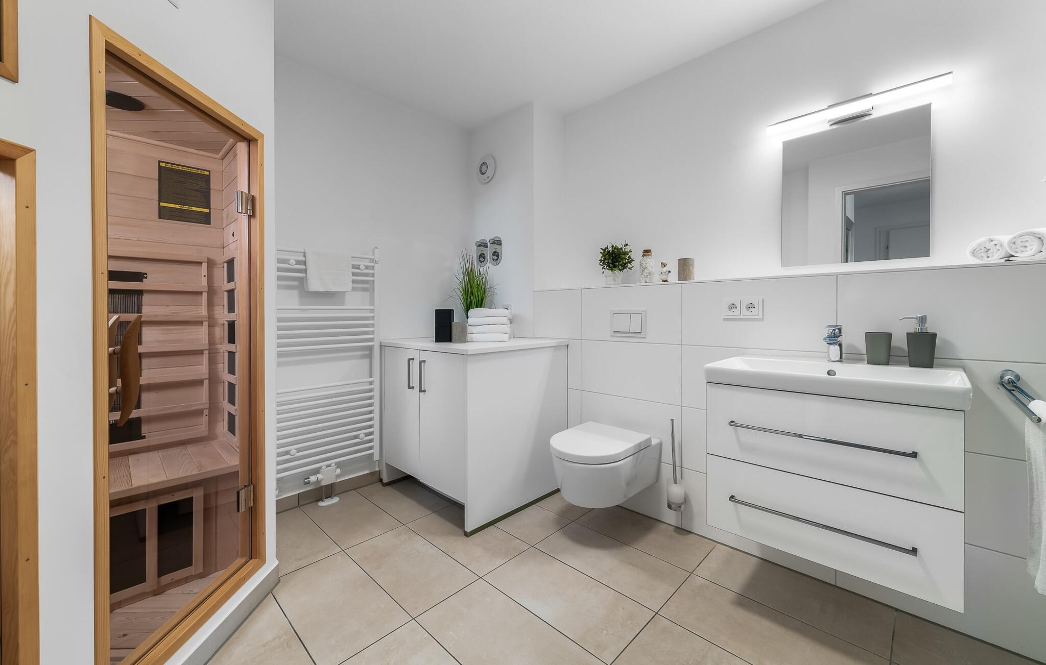 Zudem befindet sich auf dieser Etage ein bestens ausgestattetes Badezimmer mit bodengleicher Dusche und Infrarot-Sauna.