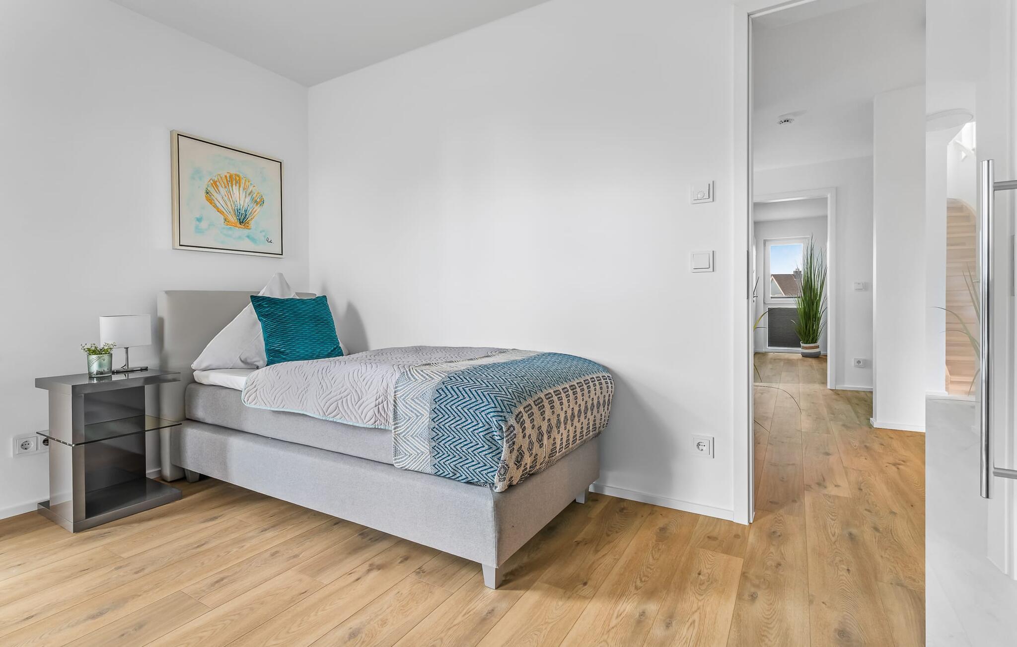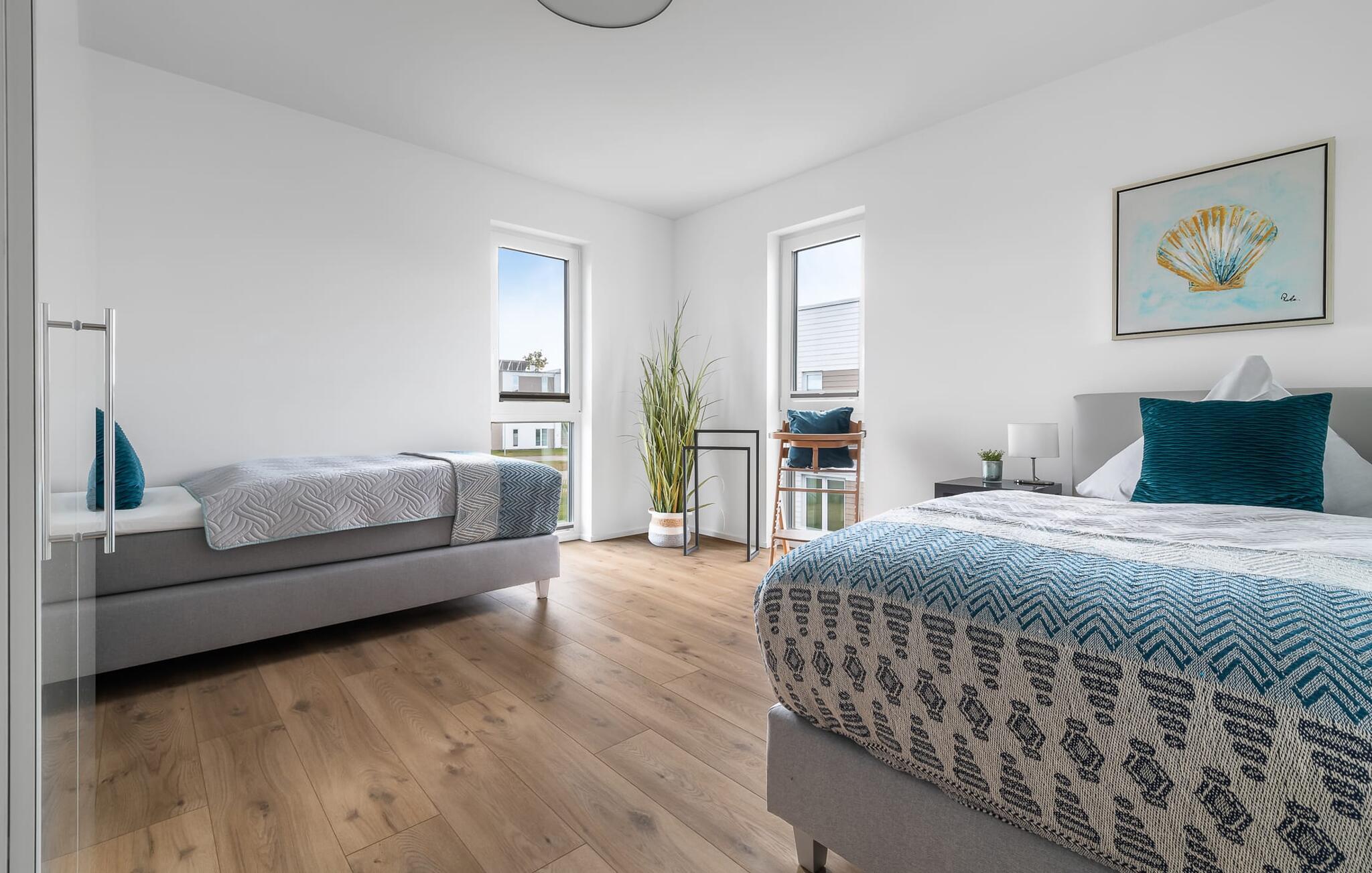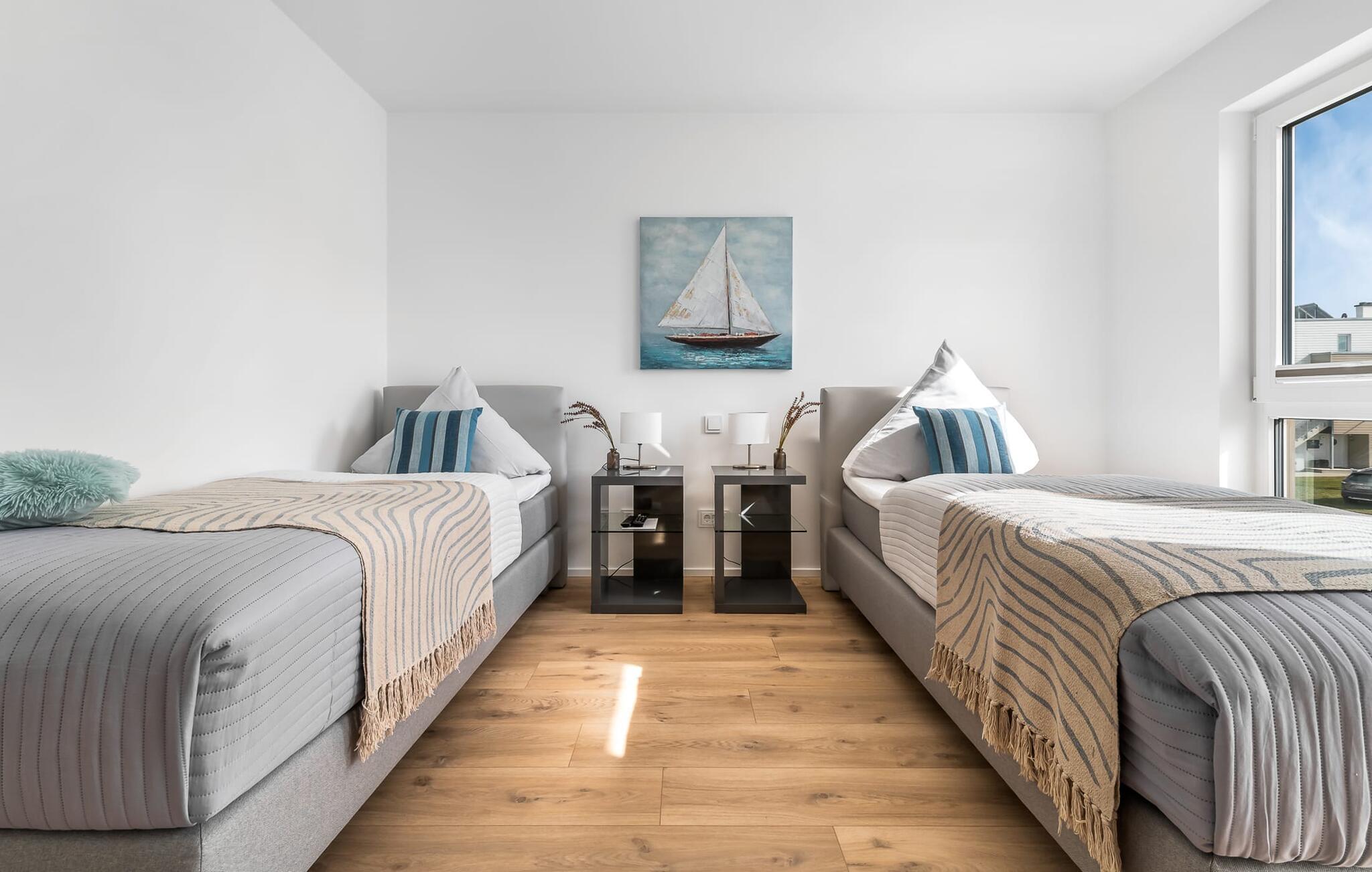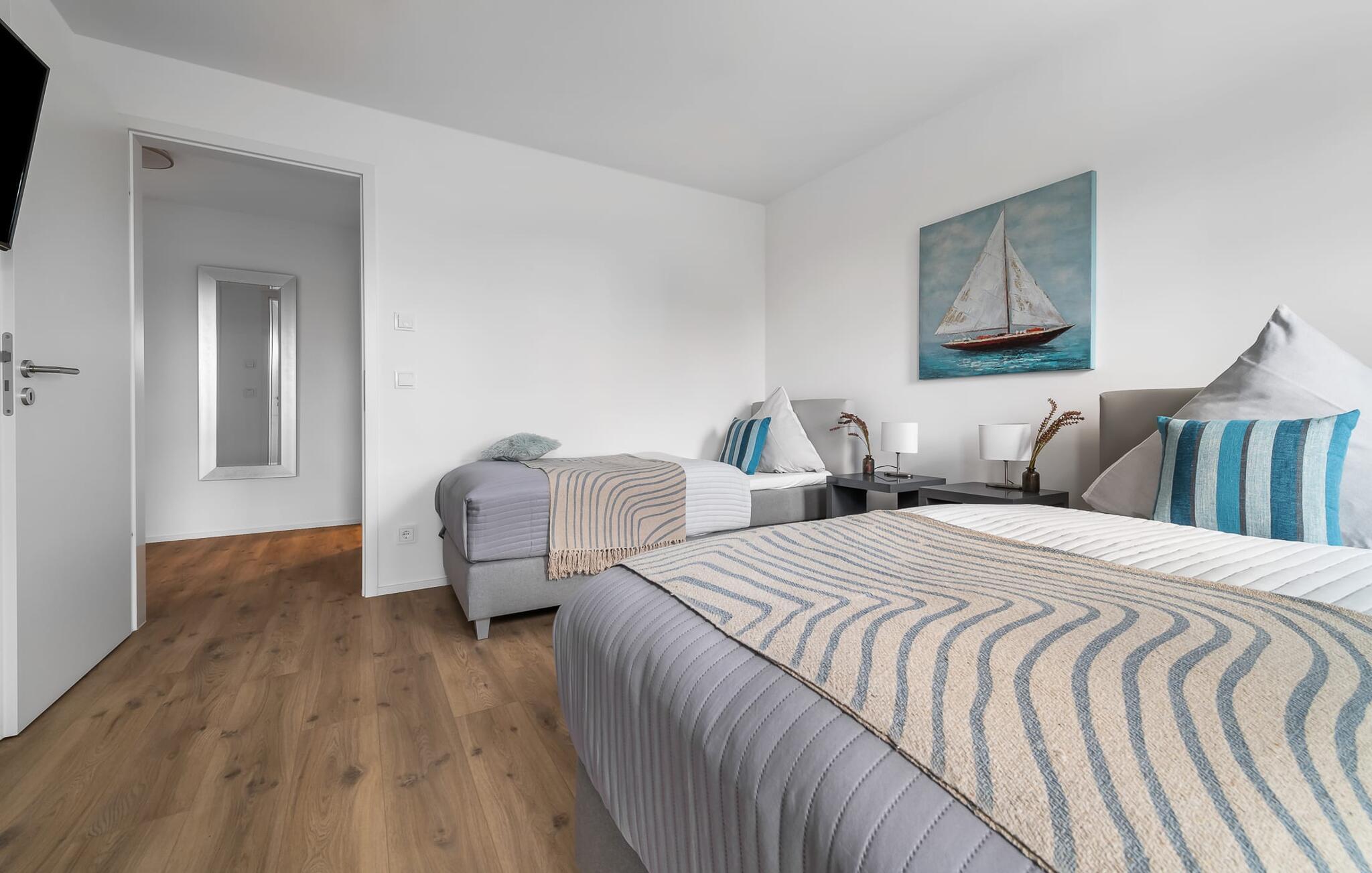 Beim Betreten der Ferienwohnung im ersten Obergeschoss, beginnt vom ersten Moment an der Urlaub. Es eröffnet sich direkt der Ruhebereich der Wohnung mit insgesamt drei Schlafzimmern. Egal für welches ihr euch entscheidet, erholsamer Schlaf ist euch sicher. Das Hauptschlafzimmer ist mit Doppelbetten sowie einem Fernseher ausgestattet. Das zweite und dritte Schlafzimmer bieten mit bequemen Einzelbetten vier weitere Schlafmöglichkeiten.