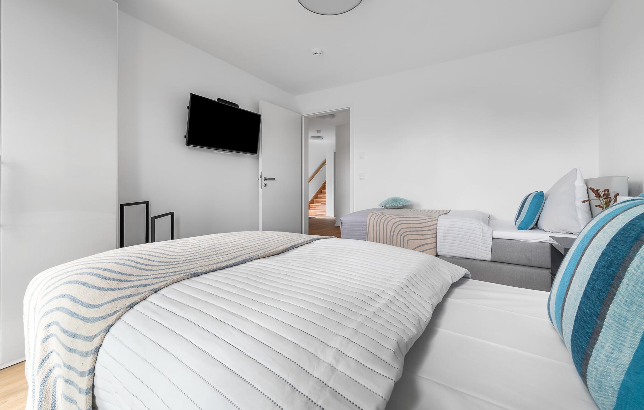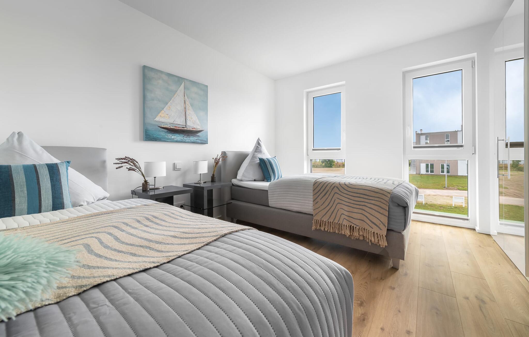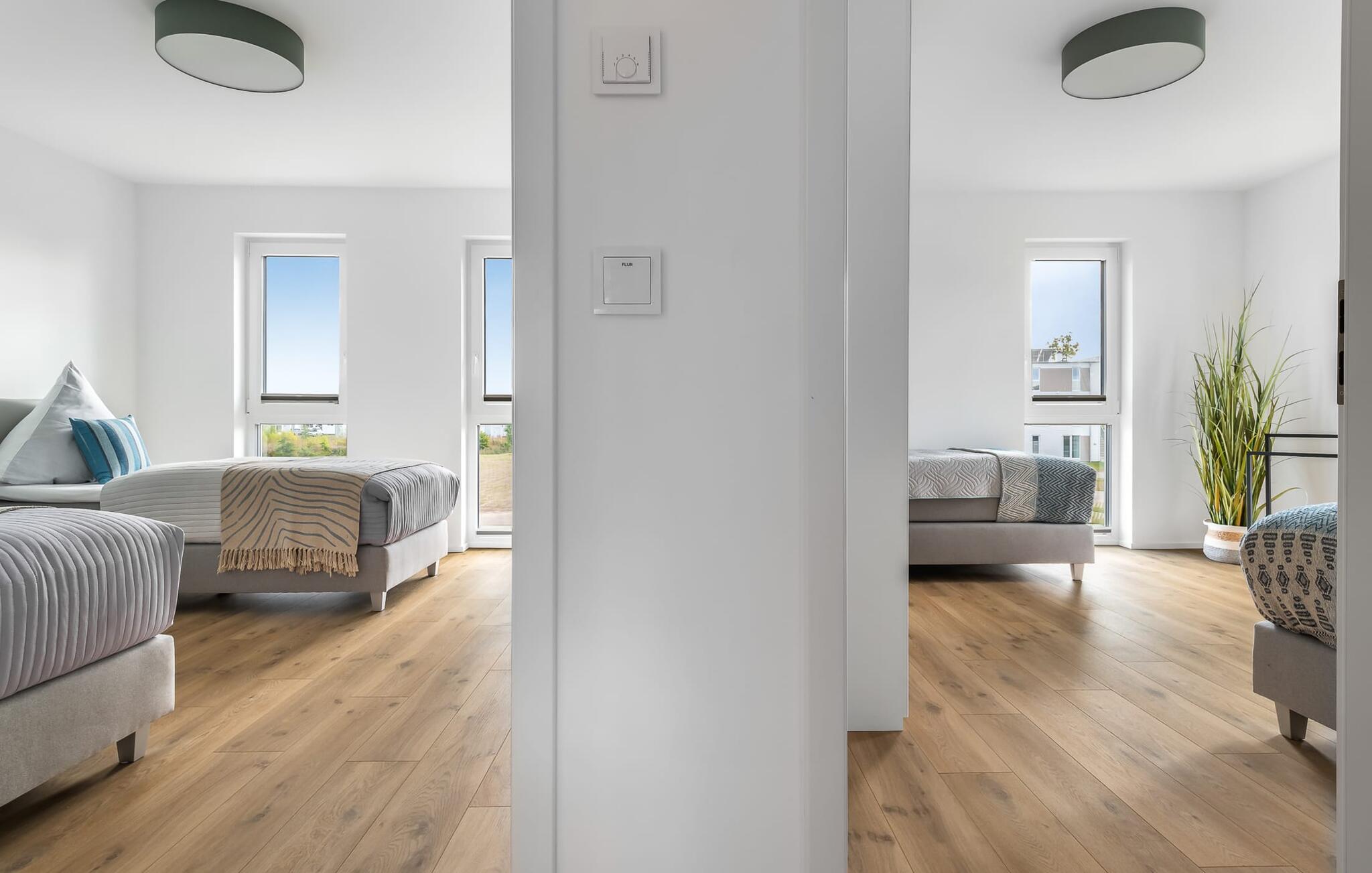 Beim Betreten der Ferienwohnung im ersten Obergeschoss, beginnt vom ersten Moment an der Urlaub. Es eröffnet sich direkt der Ruhebereich der Wohnung mit insgesamt drei Schlafzimmern. Egal für welches ihr euch entscheidet, erholsamer Schlaf ist euch sicher. Das Hauptschlafzimmer ist mit Doppelbetten sowie einem Fernseher ausgestattet. Das zweite und dritte Schlafzimmer bieten mit bequemen Einzelbetten vier weitere Schlafmöglichkeiten.