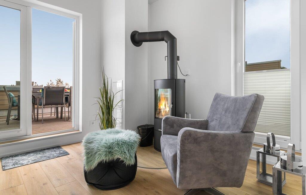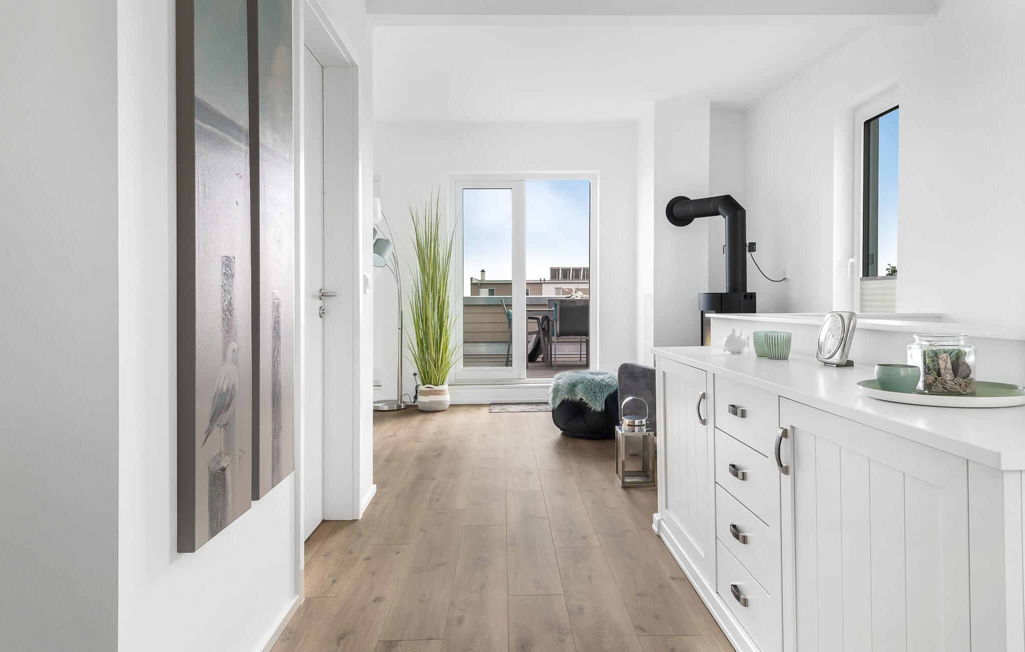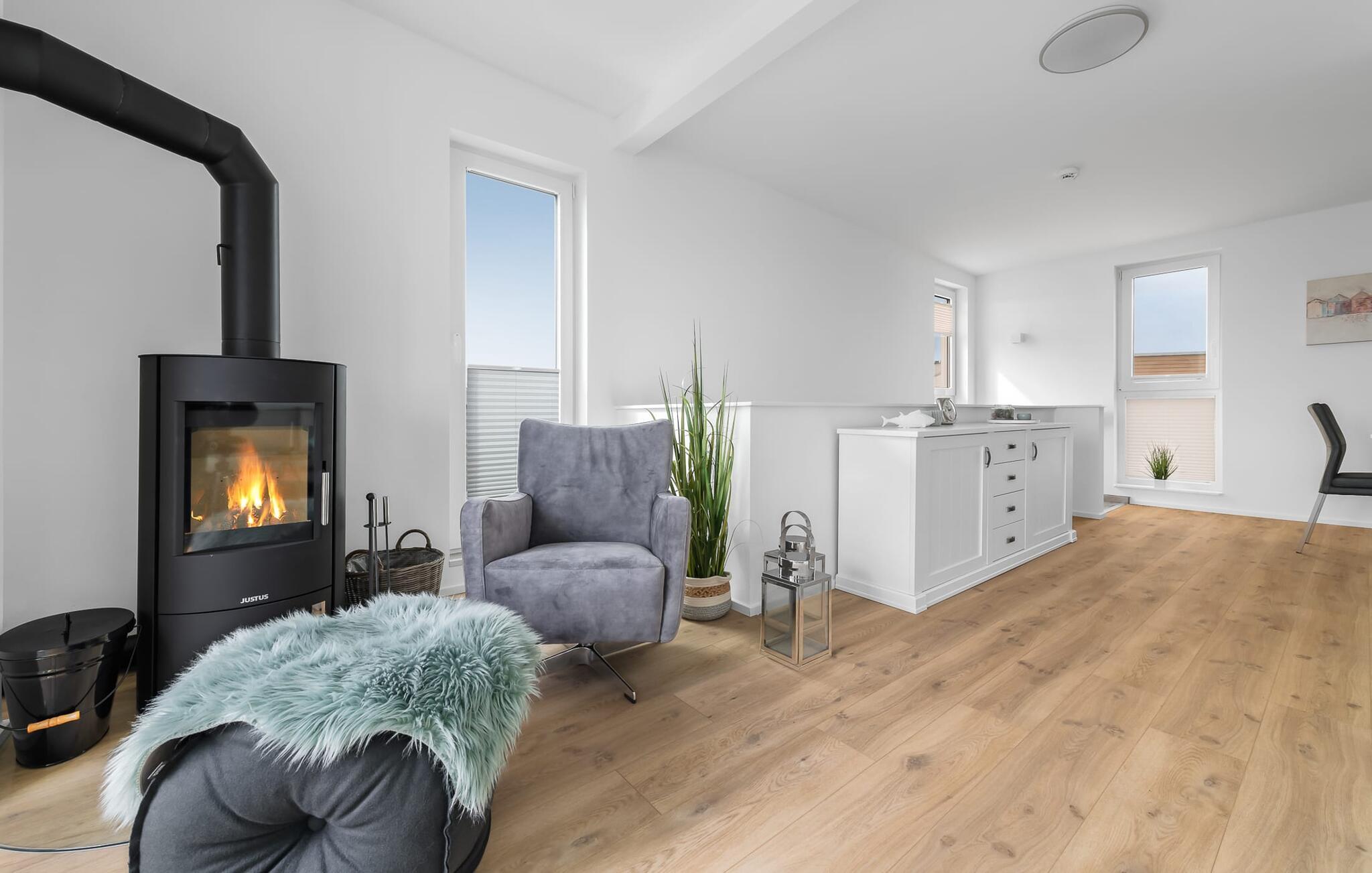 Im zweiten Obergeschoss angekommen, macht die Düne ihrem Namen alle Ehre. Hier werdet ihr von bodentiefen Fensterfronten, lichtdurchfluteten Räumen und nordisch maritimer Einrichtung begrüßt. Wohlfühlfaktor pur! Bei Schietwetter lässt sich der Tag auf dem gemütlichen Sofa und vor dem Knisternden Kamin verbringen.