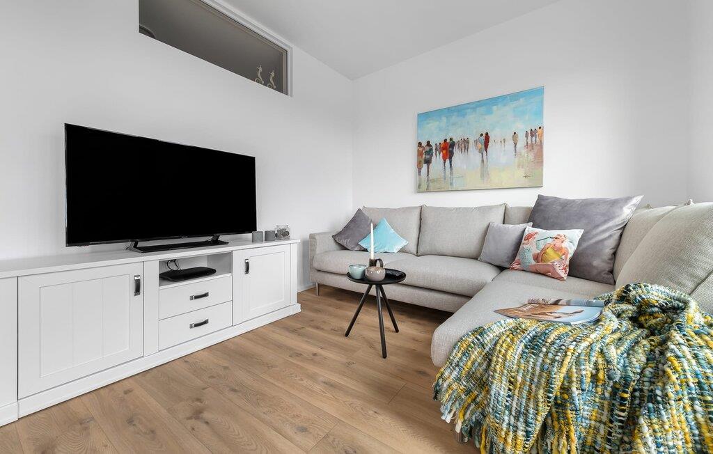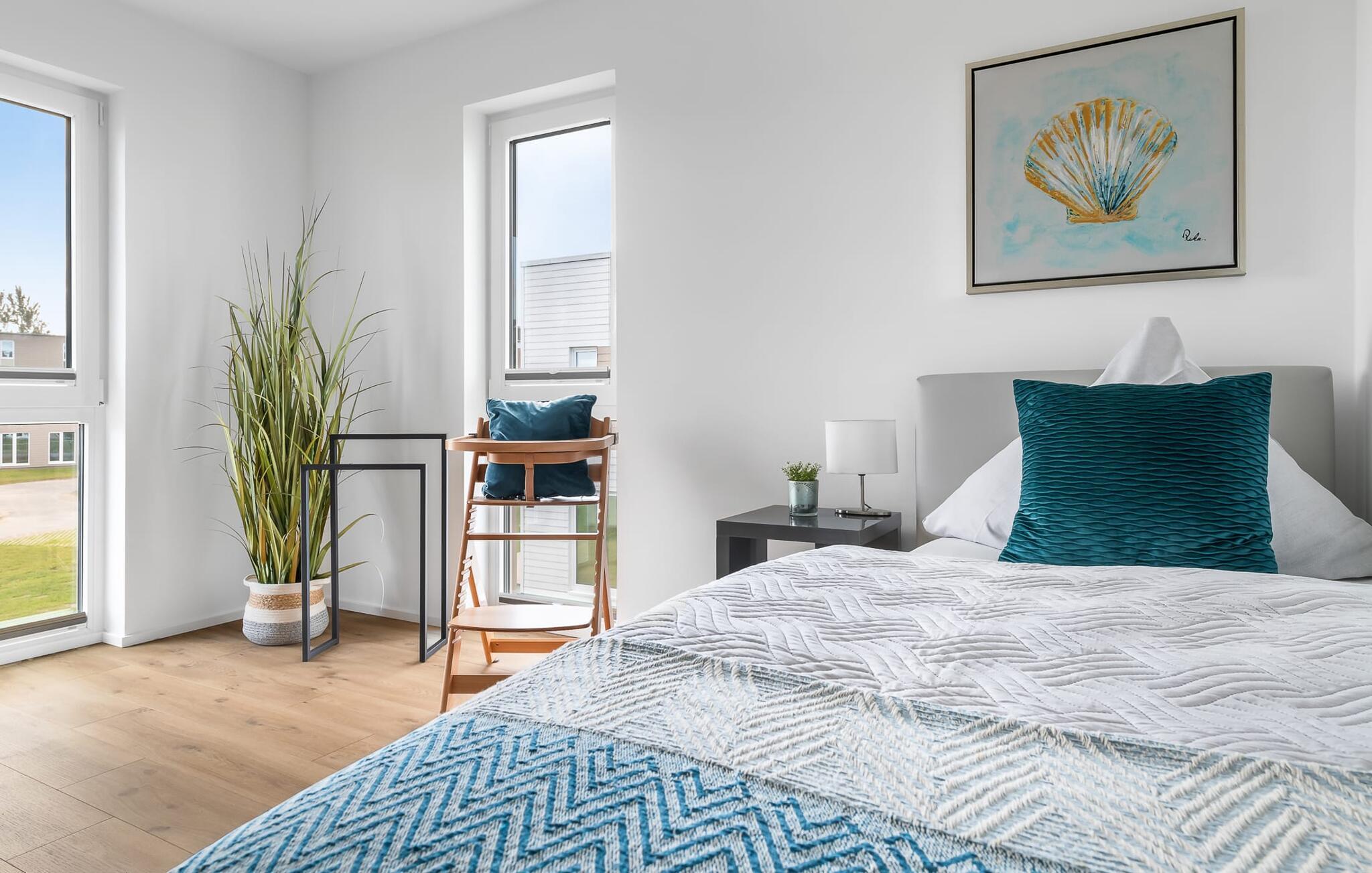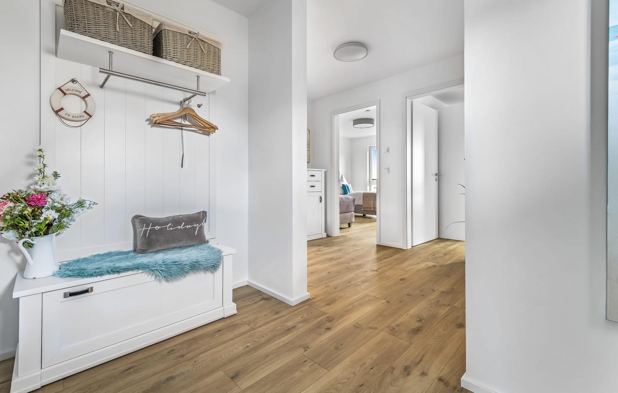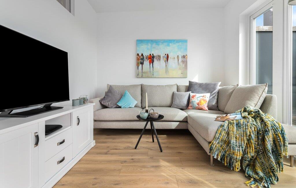 Im zweiten Obergeschoss angekommen, macht die Düne ihrem Namen alle Ehre. Hier werdet ihr von bodentiefen Fensterfronten, lichtdurchfluteten Räumen und nordisch maritimer Einrichtung begrüßt. Wohlfühlfaktor pur! Bei Schietwetter lässt sich der Tag auf dem gemütlichen Sofa und vor dem Knisternden Kamin verbringen.