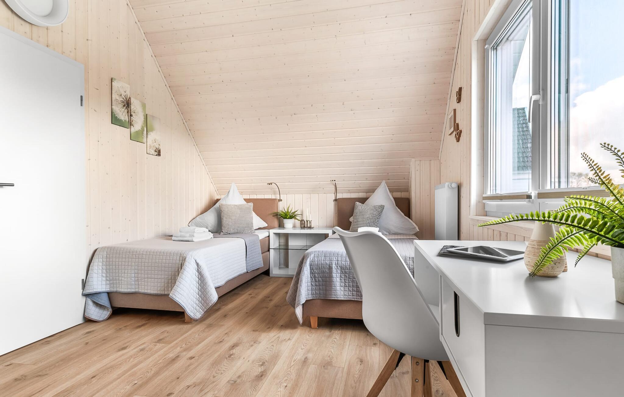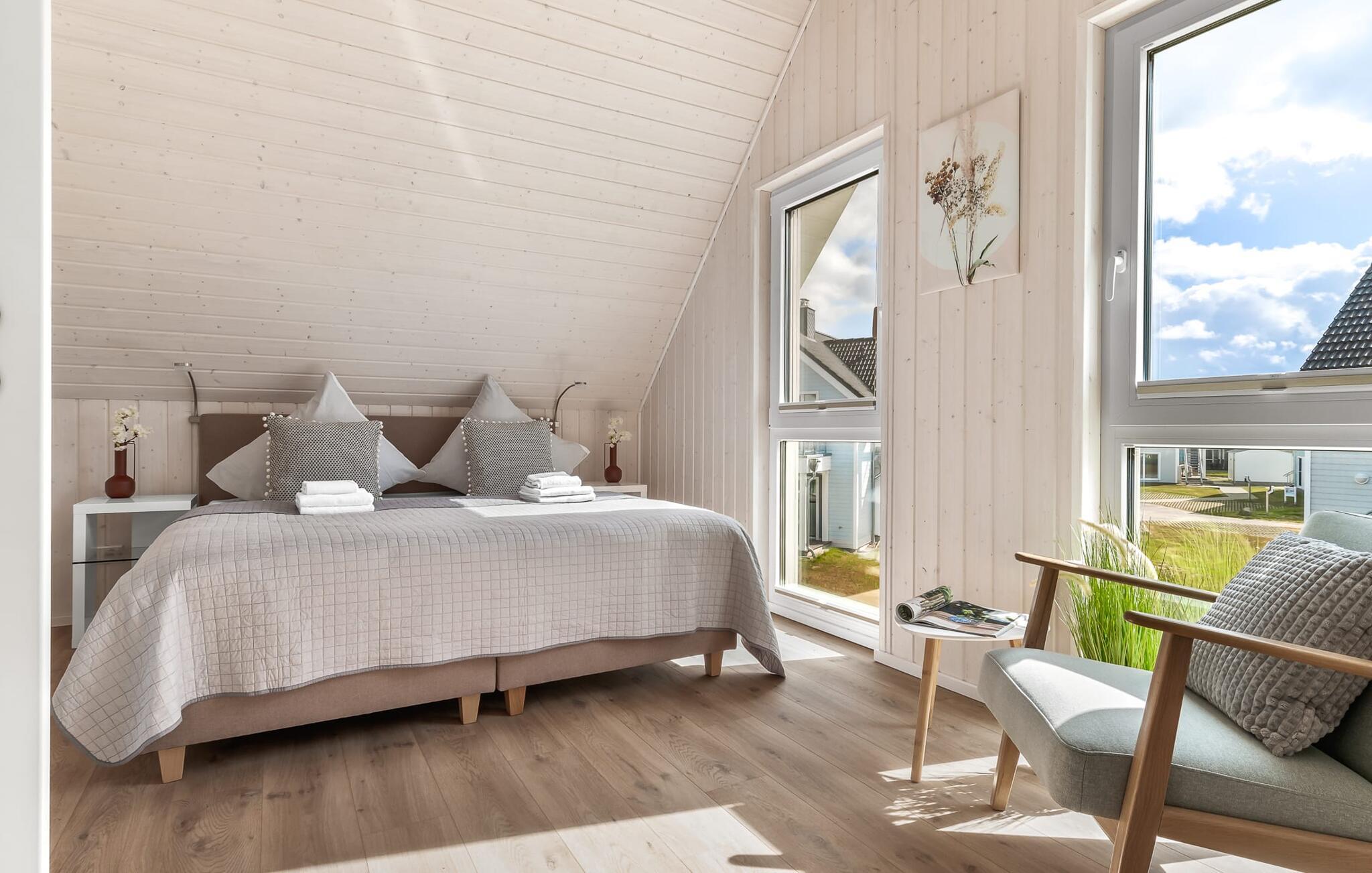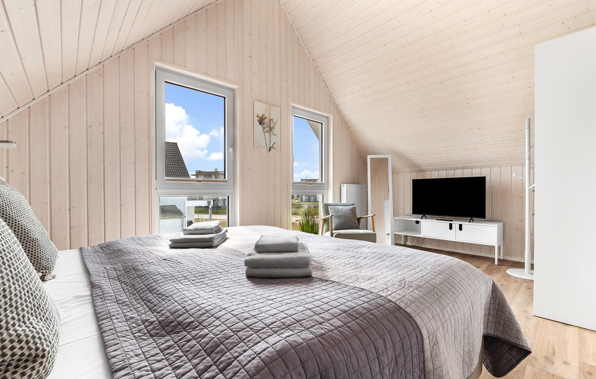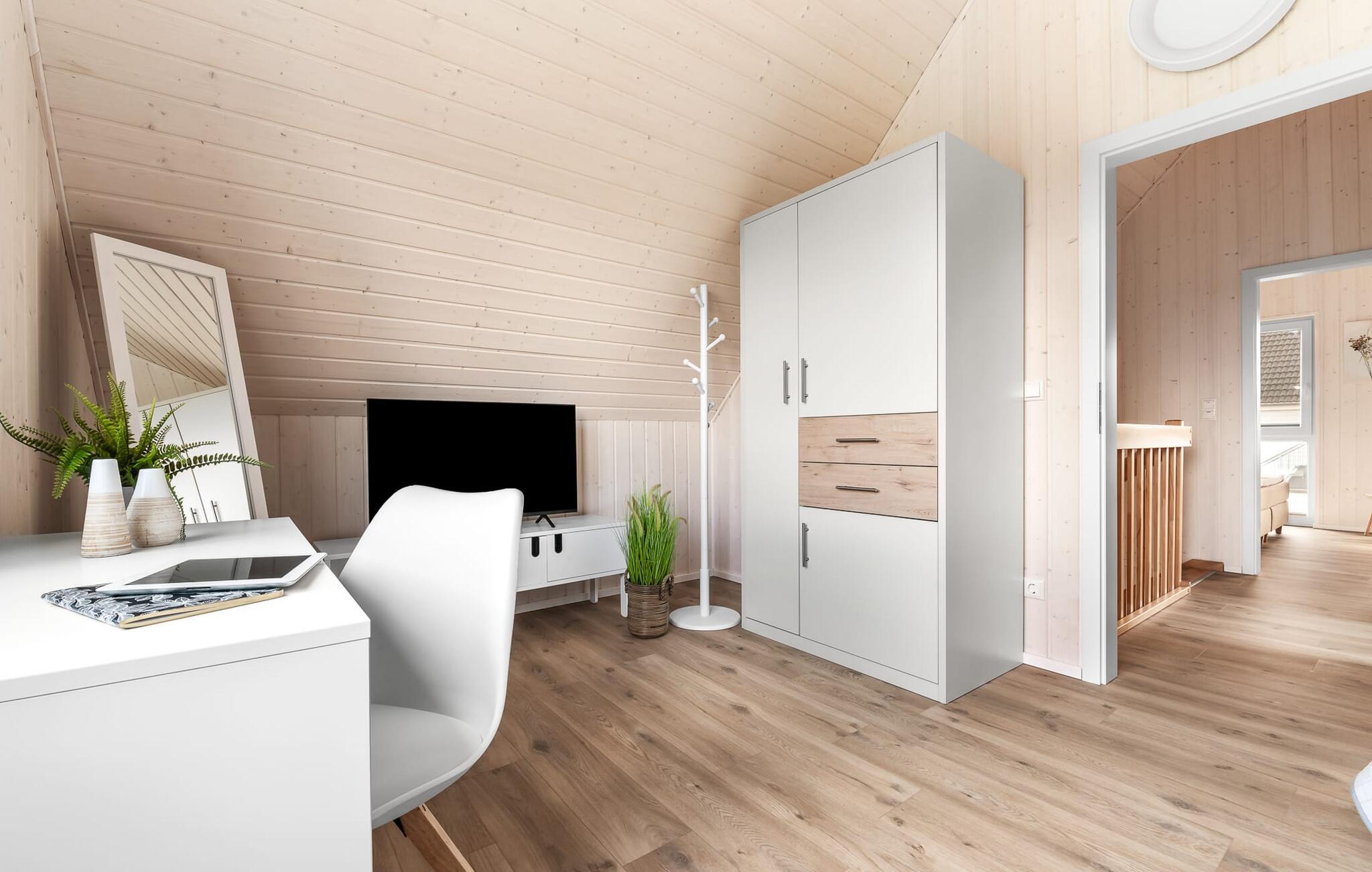 Im ersten Obergeschoss angekommen, empfängt euch der Ruhebereich des Hauses. Von hier aus gelangt man in die beiden Schlafzimmer. Eines der Schlafzimmer ist mit einem gemütlichen Boxspring-Doppelbett ausgestattet, im zweiten Schlafzimmer sind zwei Einzel-Boxspringbetten vorhanden. Für gemütliche Filmabende sind beide Schlafzimmer mit jeweils einem TV ausgestattet.
