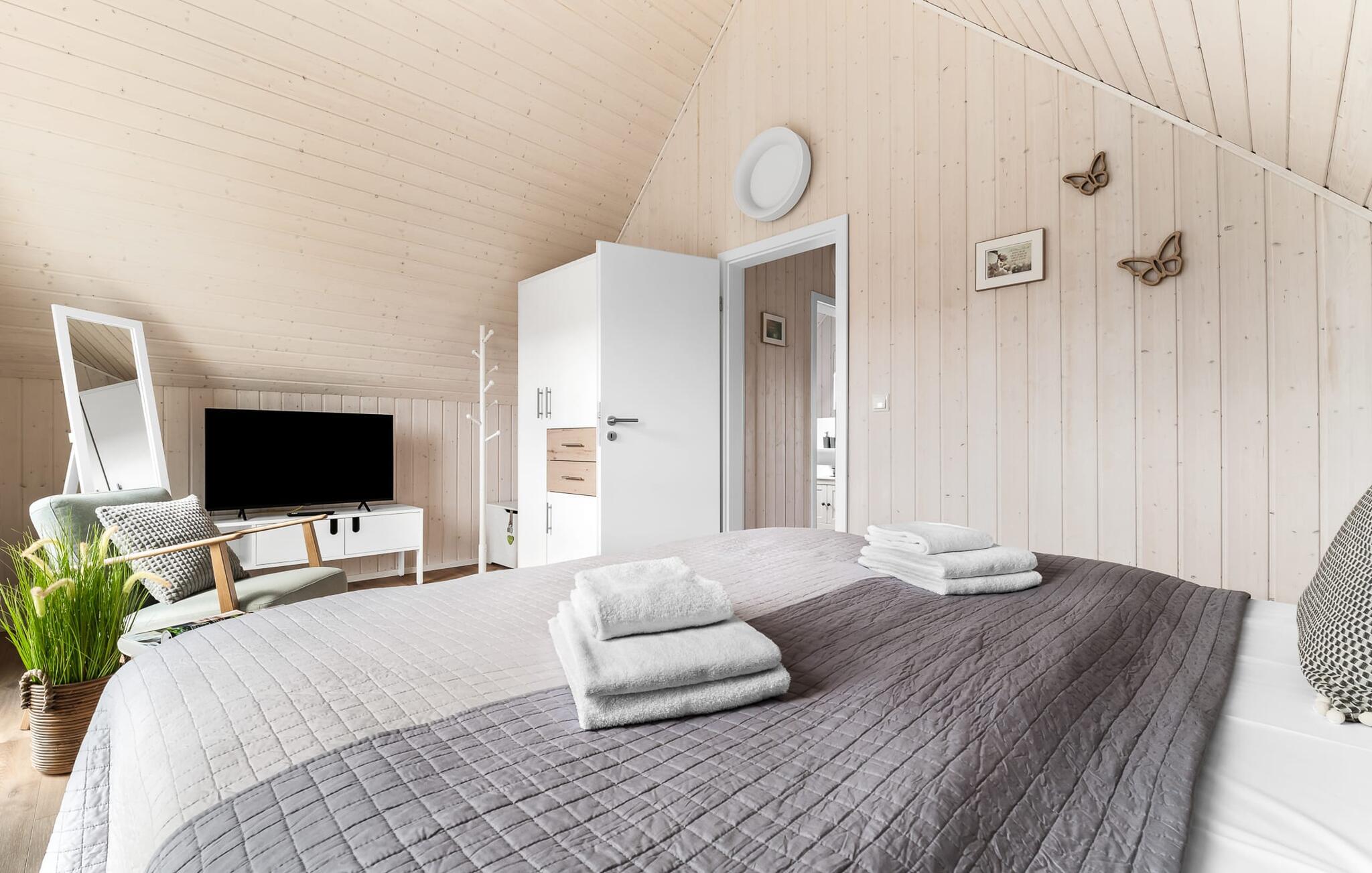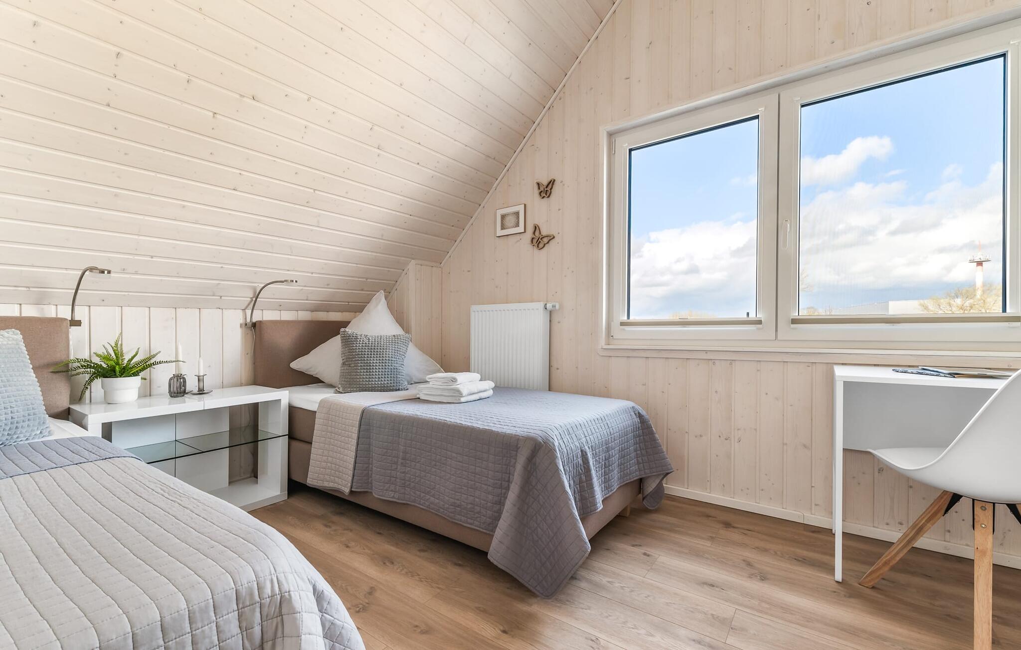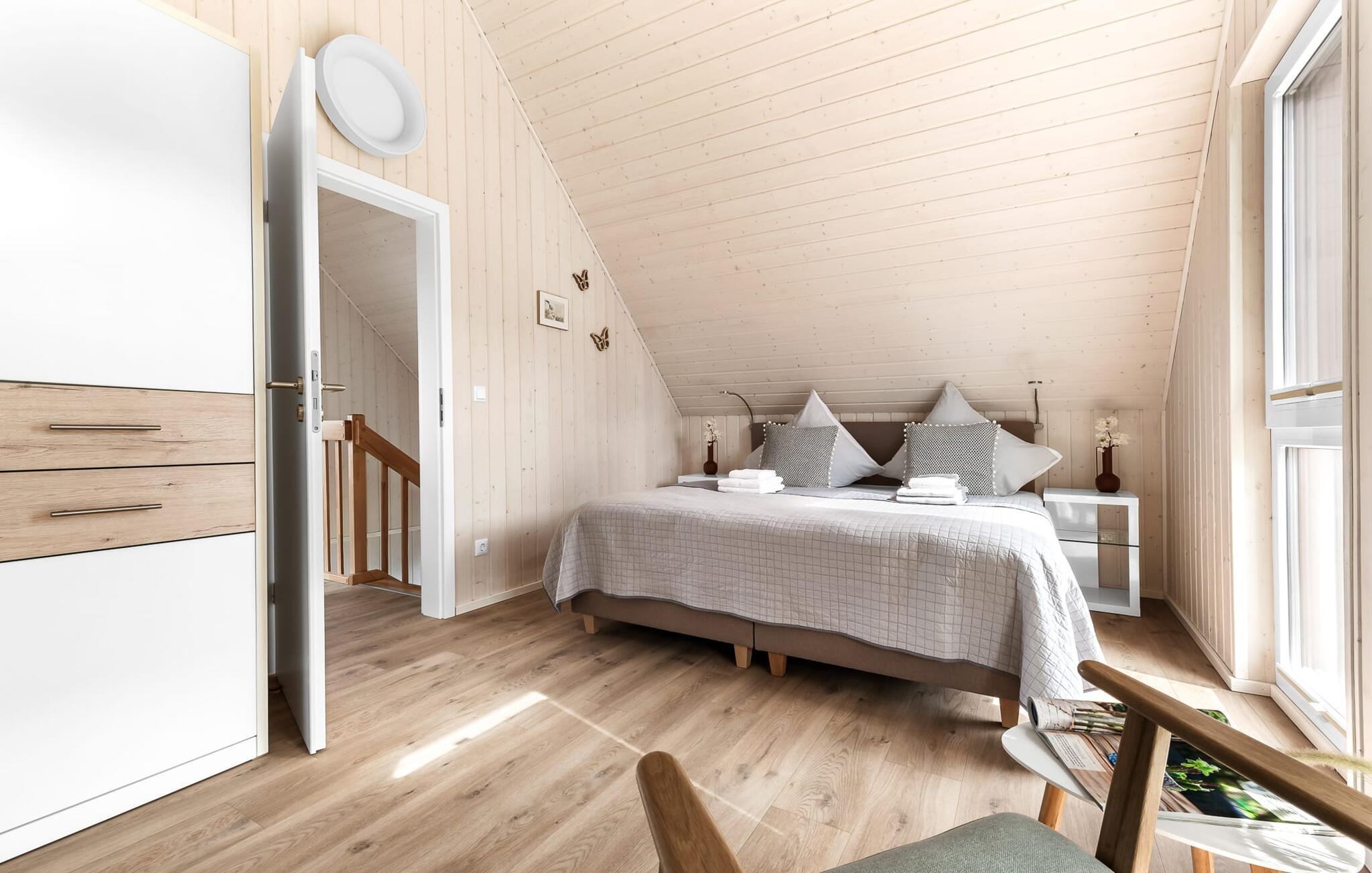 Im ersten Obergeschoss angekommen, empfängt euch der Ruhebereich des Hauses. Von hier aus gelangt man in die beiden Schlafzimmer. Eines der Schlafzimmer ist mit einem gemütlichen Boxspring-Doppelbett ausgestattet, im zweiten Schlafzimmer sind zwei Einzel-Boxspringbetten vorhanden. Für gemütliche Filmabende sind beide Schlafzimmer mit jeweils einem TV ausgestattet.