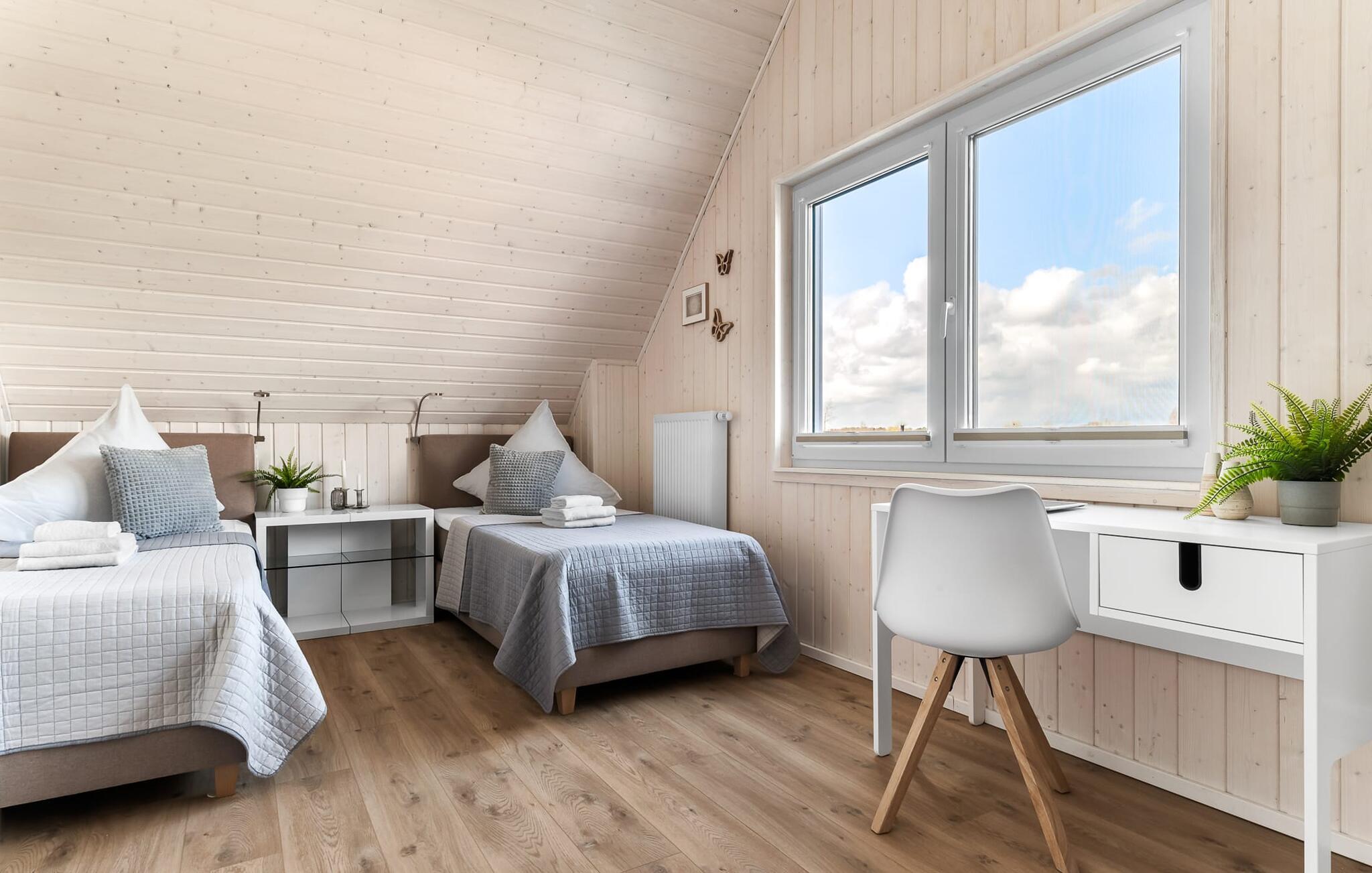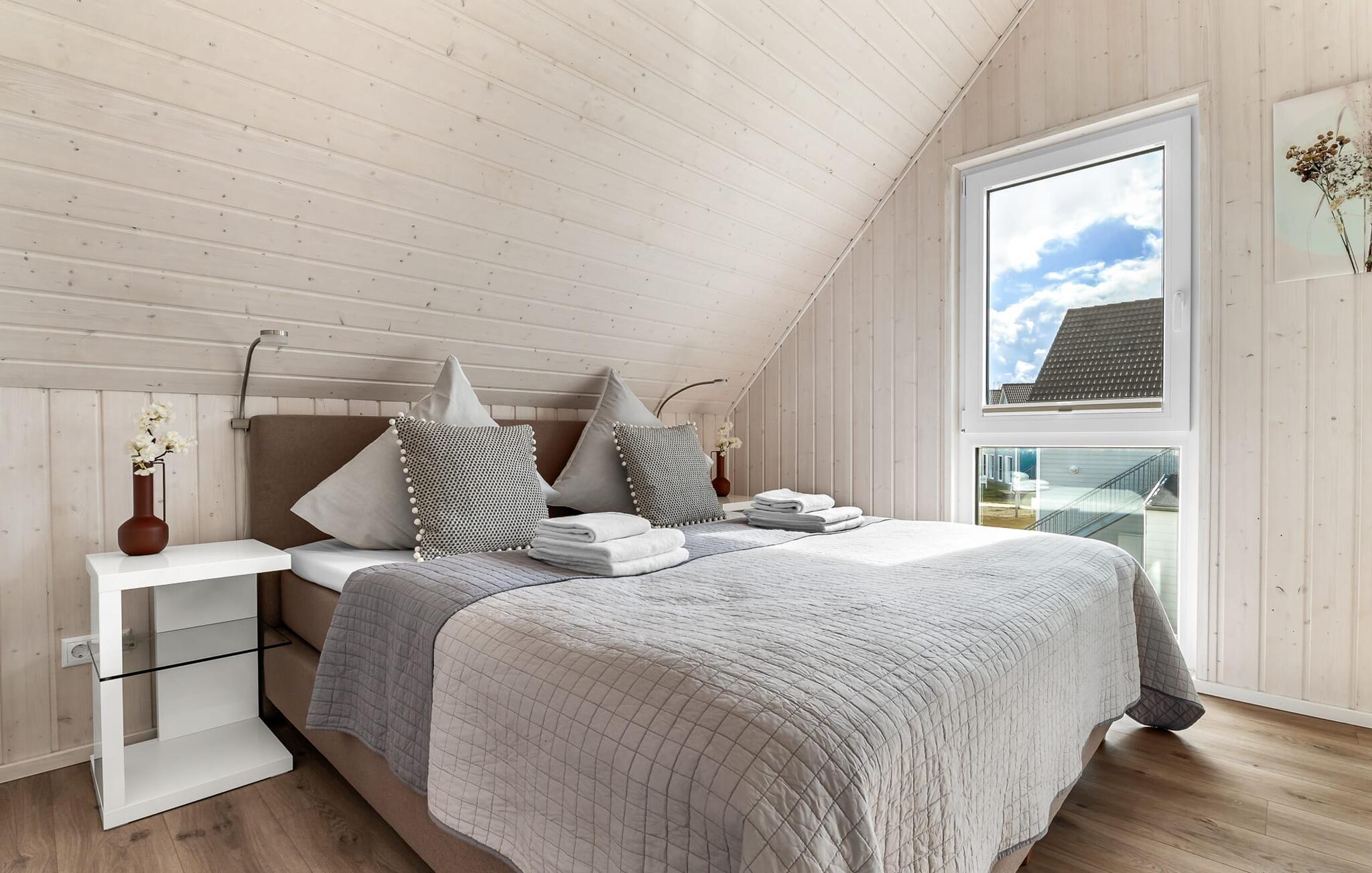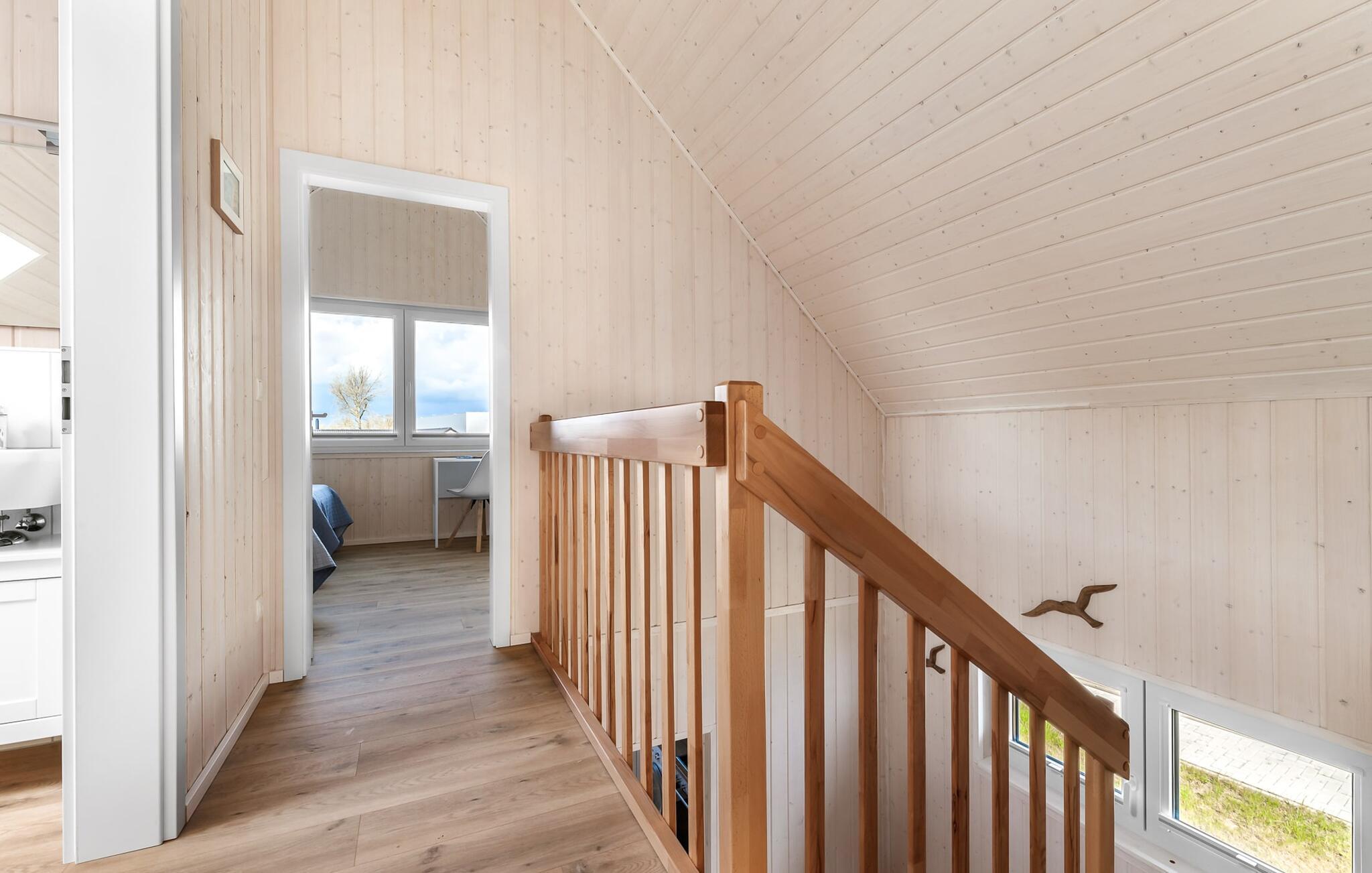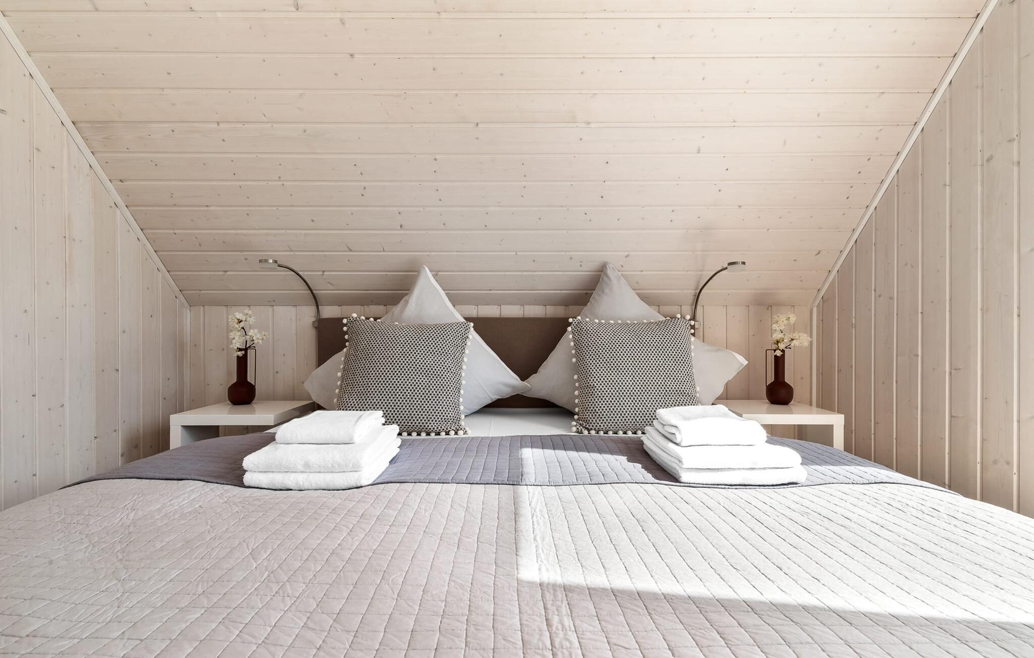 Im ersten Obergeschoss angekommen, empfängt euch der Ruhebereich des Hauses. Von hier aus gelangt man in die beiden Schlafzimmer. Eines der Schlafzimmer ist mit einem gemütlichen Boxspring-Doppelbett ausgestattet, im zweiten Schlafzimmer sind zwei Einzel-Boxspringbetten vorhanden. Für gemütliche Filmabende sind beide Schlafzimmer mit jeweils einem TV ausgestattet.