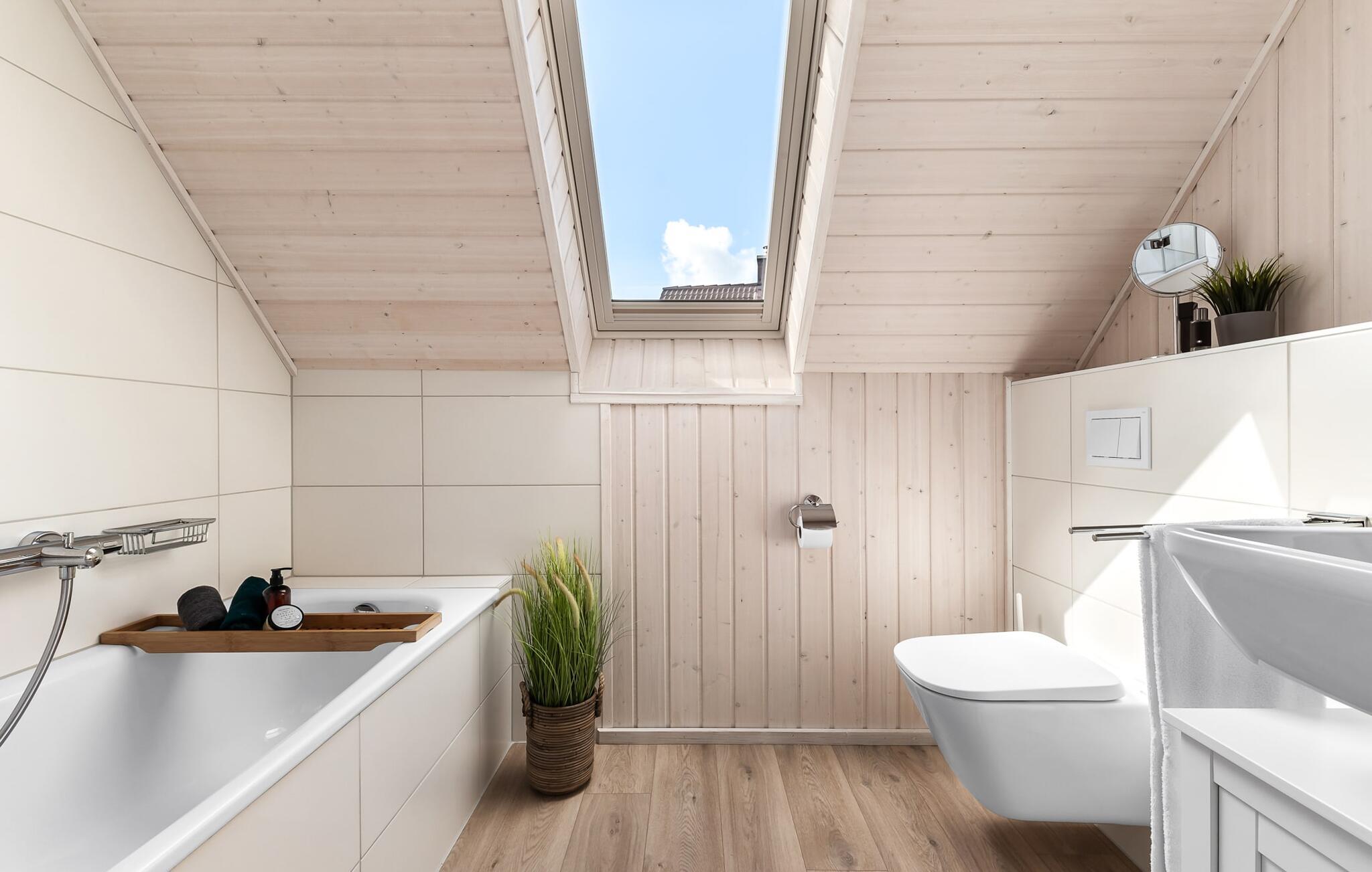 Neben den beiden Schlafzimmern rundet das zweite Badezimmer das Urlaubsfeeling mit Badewanne und integrierter Duschmöglichkeit ab.