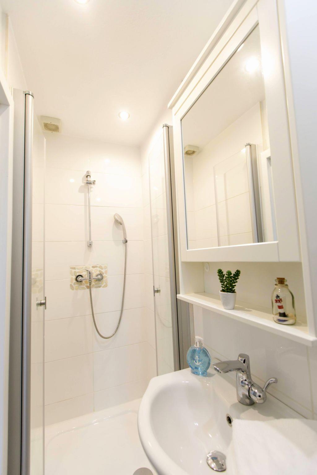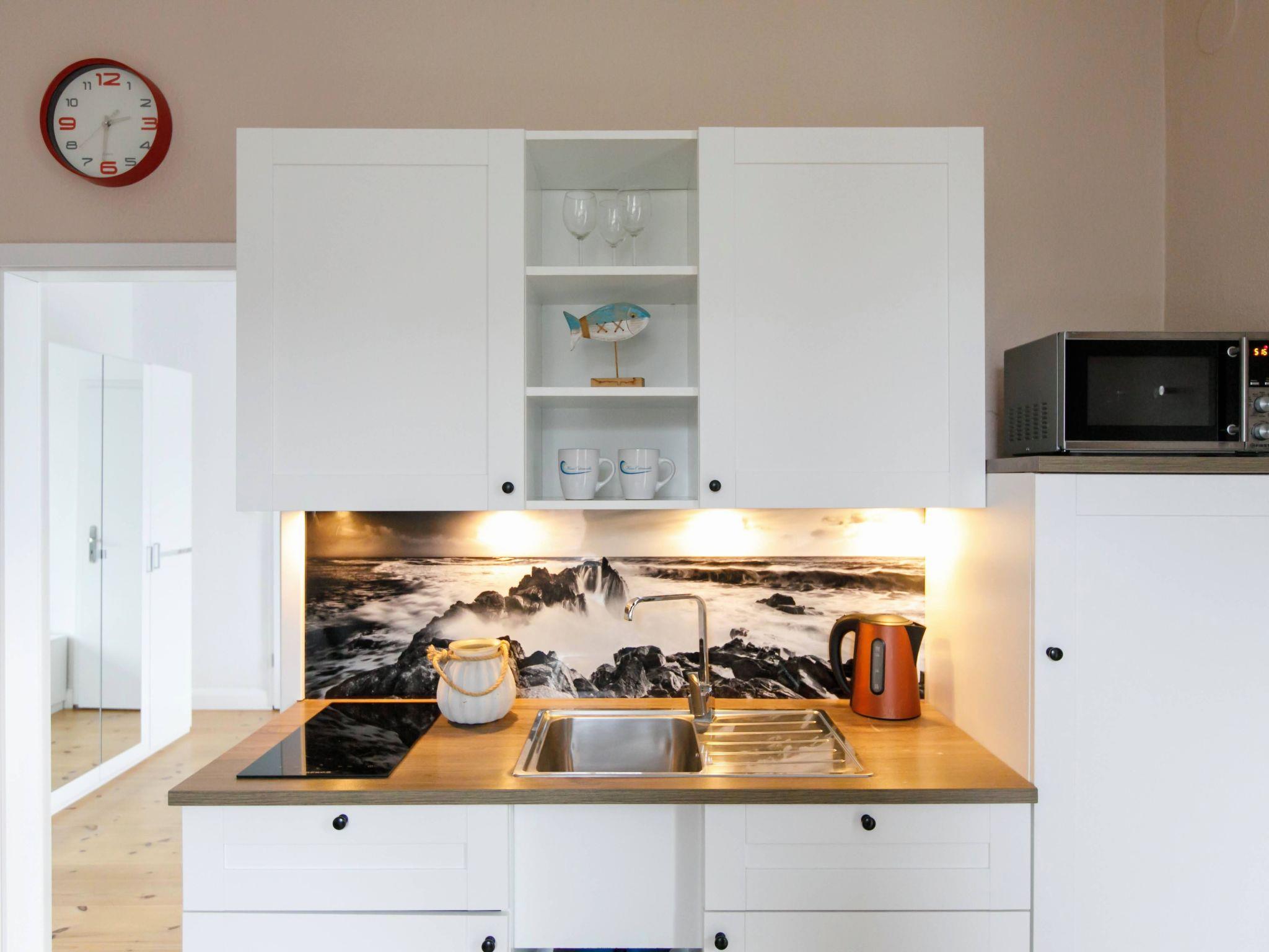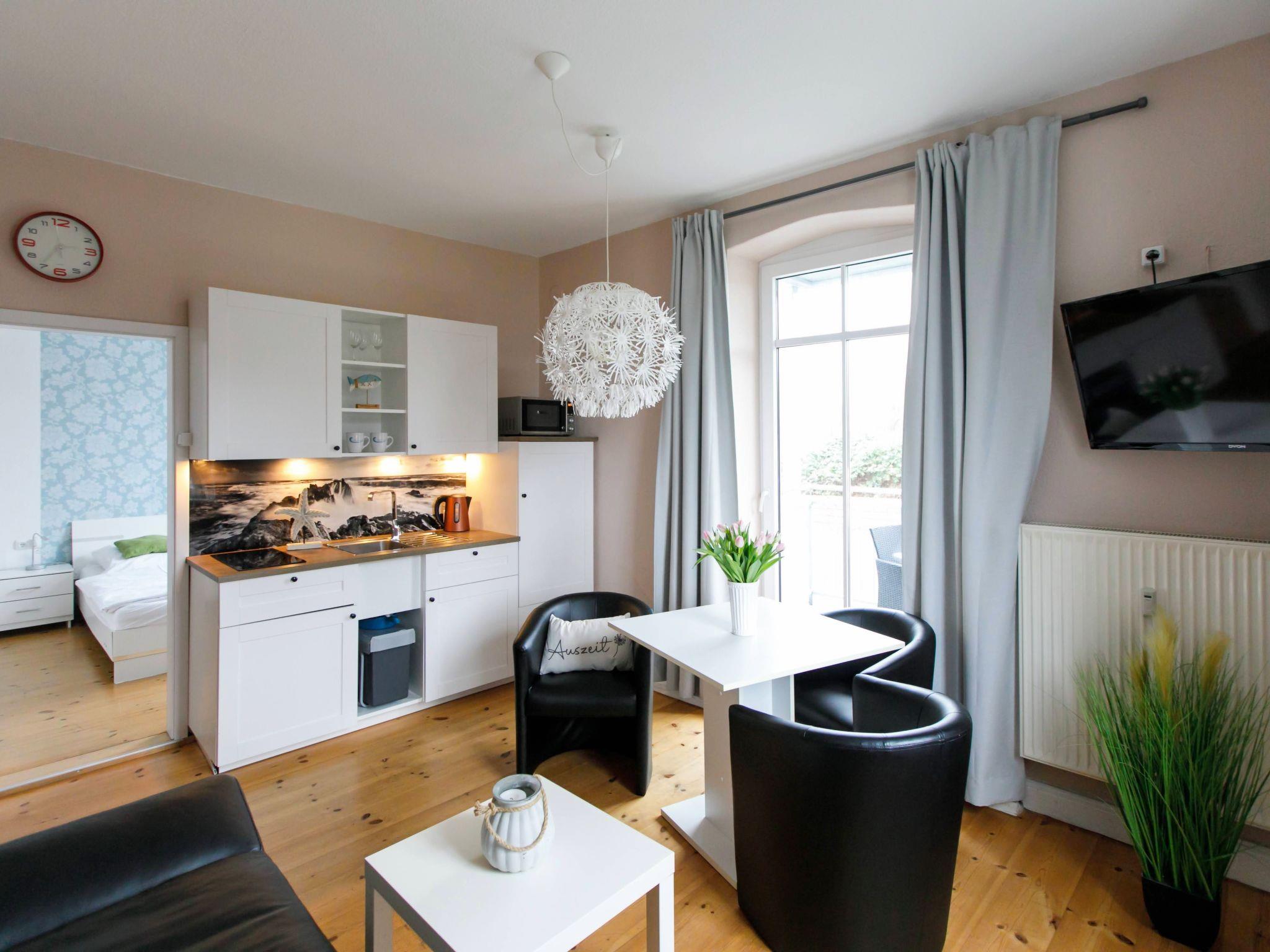Das HausOstseewelle liegt 150m vom Strand entfernt. Die Ferienwohnung 5 liegt im Erdgeschoss und hat einen Balkon. Die Wohnung hat ein Schlafzimmer ( Ehebett ) und ein Wohn- Esszimmer mit einer Schlafcouch. Die Küche ist im Wohnzimmer integriert, und ist mit Kaffeemaschine, Toaster, Eierkocher, Küchengeräten, Mikrowelle, Geschirr, Töpfen und einen Zweiflammen Ceranfeld ausgestattet. Die Küche hat keinen Backofen. Zur Ausstattung gehören ein Radio und ein LCD-DVBT- TV. Das Haus hat einen Stellplatz pro Ferienwohnung.