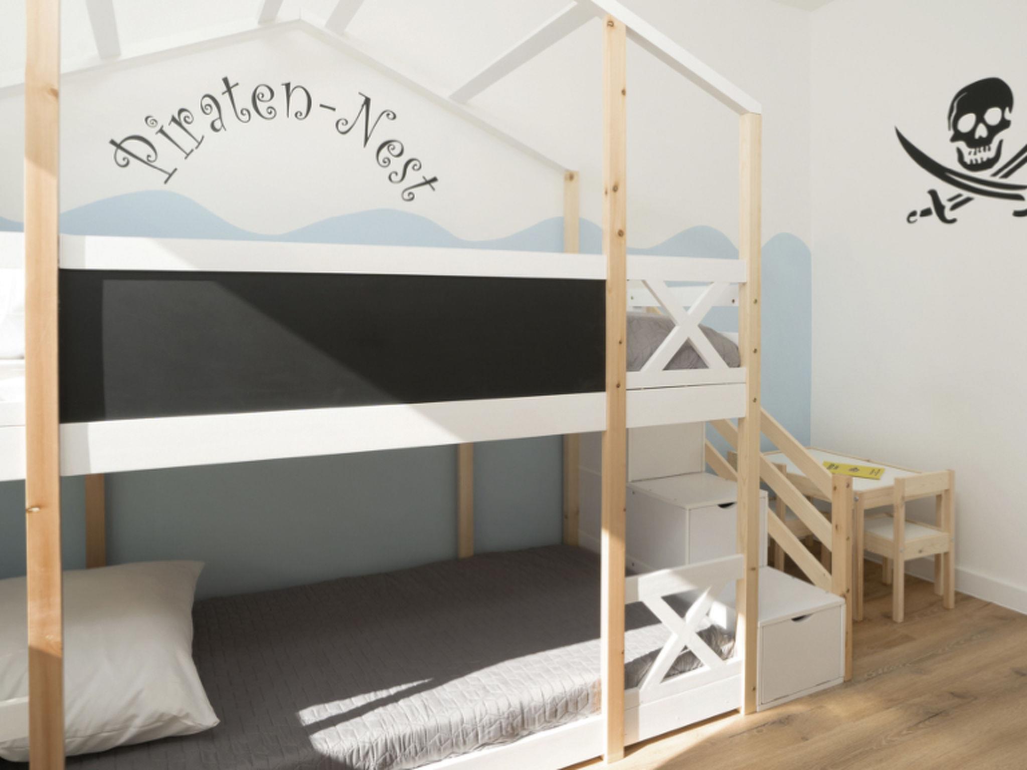 Damit auch die kleinen Gäste nicht zu kurz kommen, verfügt das Apartment über ein Kinderzimmer im Piraten-Stil mit einem Etagenbett für zwei Kinder. Das Piratennest wurde liebevoll gestaltet und sorgt dafür, dass sich auch die Kleinen rundum wohl fühlen. Zum Ausklingen eines gelungenen Urlaubstages lädt euch der Balkon mit Blick Richtung Ostsee ein. Hier kann man die Abendstunden genießen und es sich richtig gut gehen lassen.