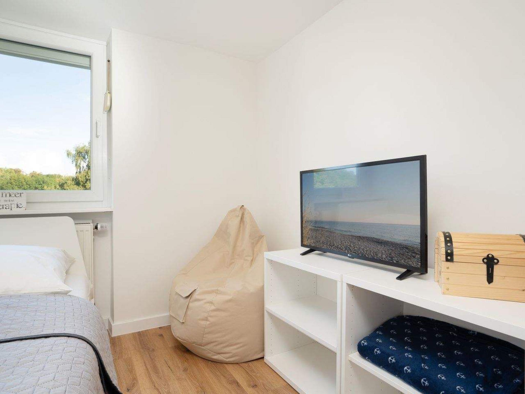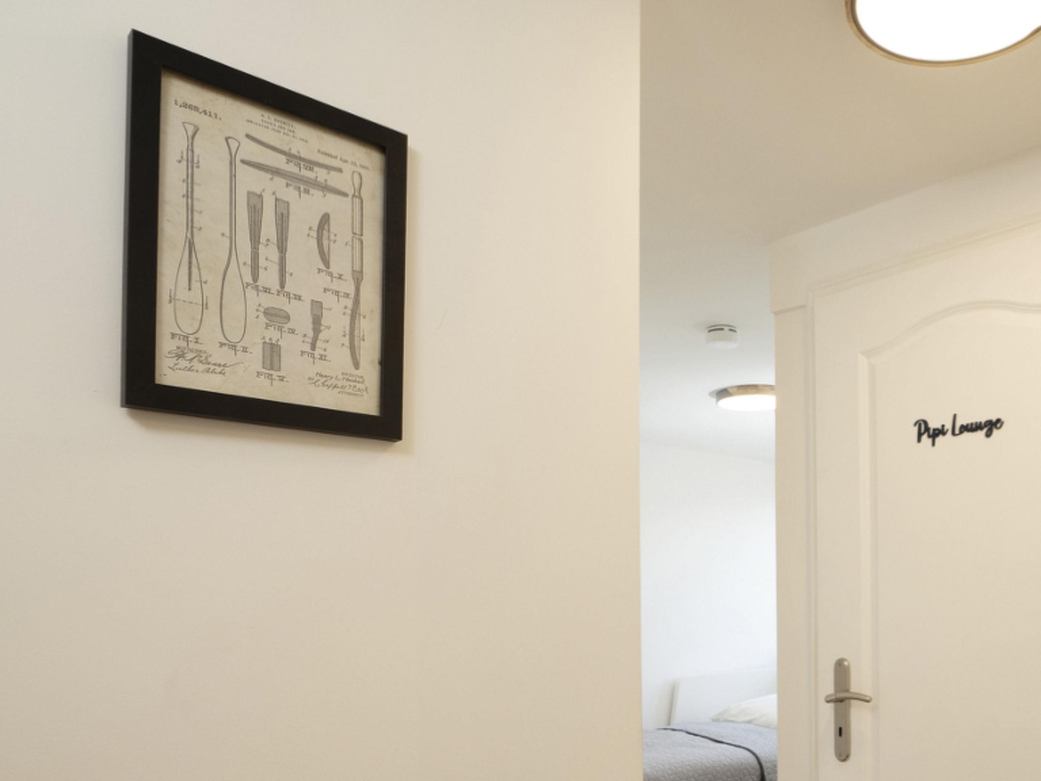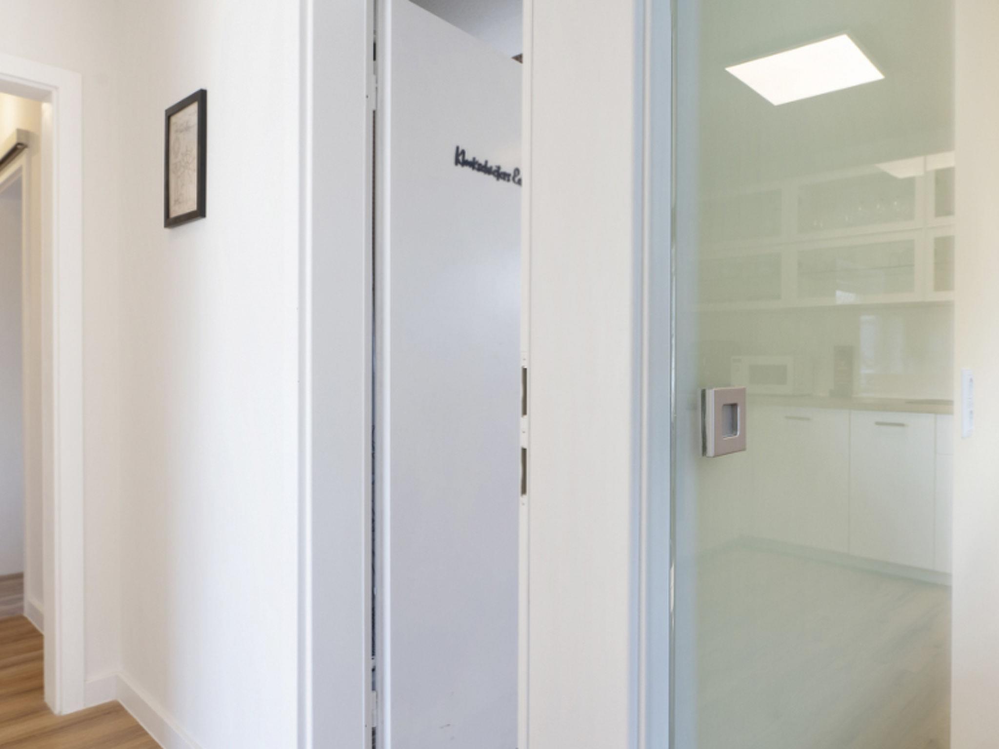 Im Flur finden ihr ausreichend Abstellmöglichkeiten für Strandutensilien, Jacken, Schuhe und Co. Auf der linken Seite des Flurs gelangt ihr in das gemütliche Gästezimmer. Mit dem ausziehbaren Schlafsofa (2 x 80 x 200 cm) kann der Raum ruckzuck zu einem zusätzlichen Schlafzimmer umgestaltet werden. Hier findet ihr allerhand Seemannsgarn für Bücherwürmer und einen Smart-TV für Couch-Potatoes (Streaming-Dienste inklusive). Direkt angrenzend befindet sich ein helles Duschbad mit Fenster.