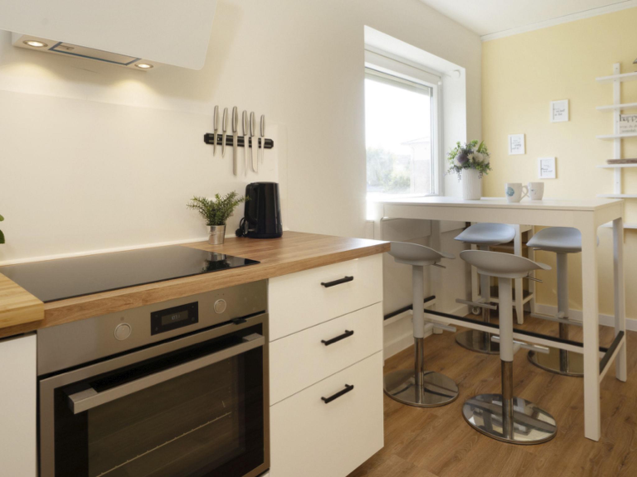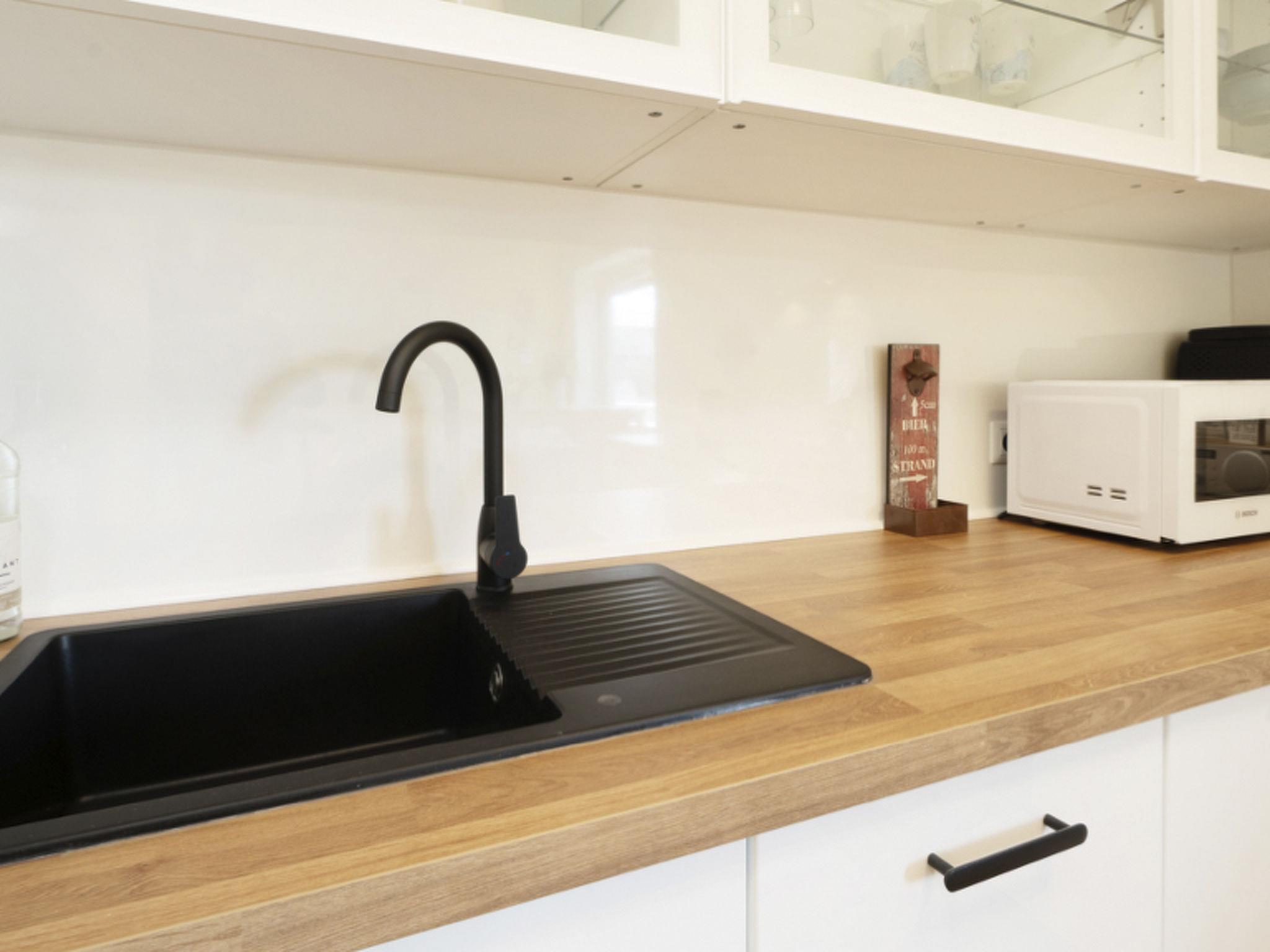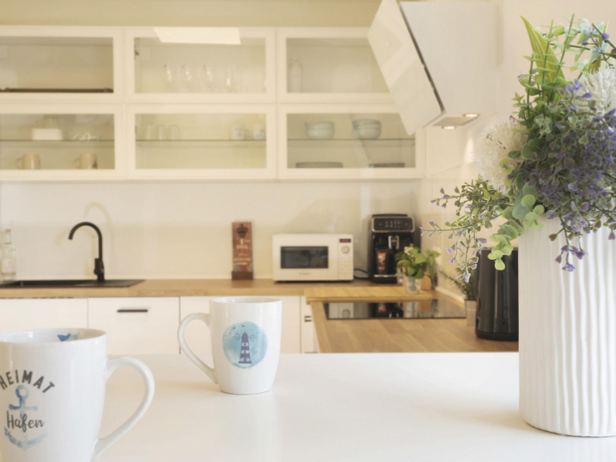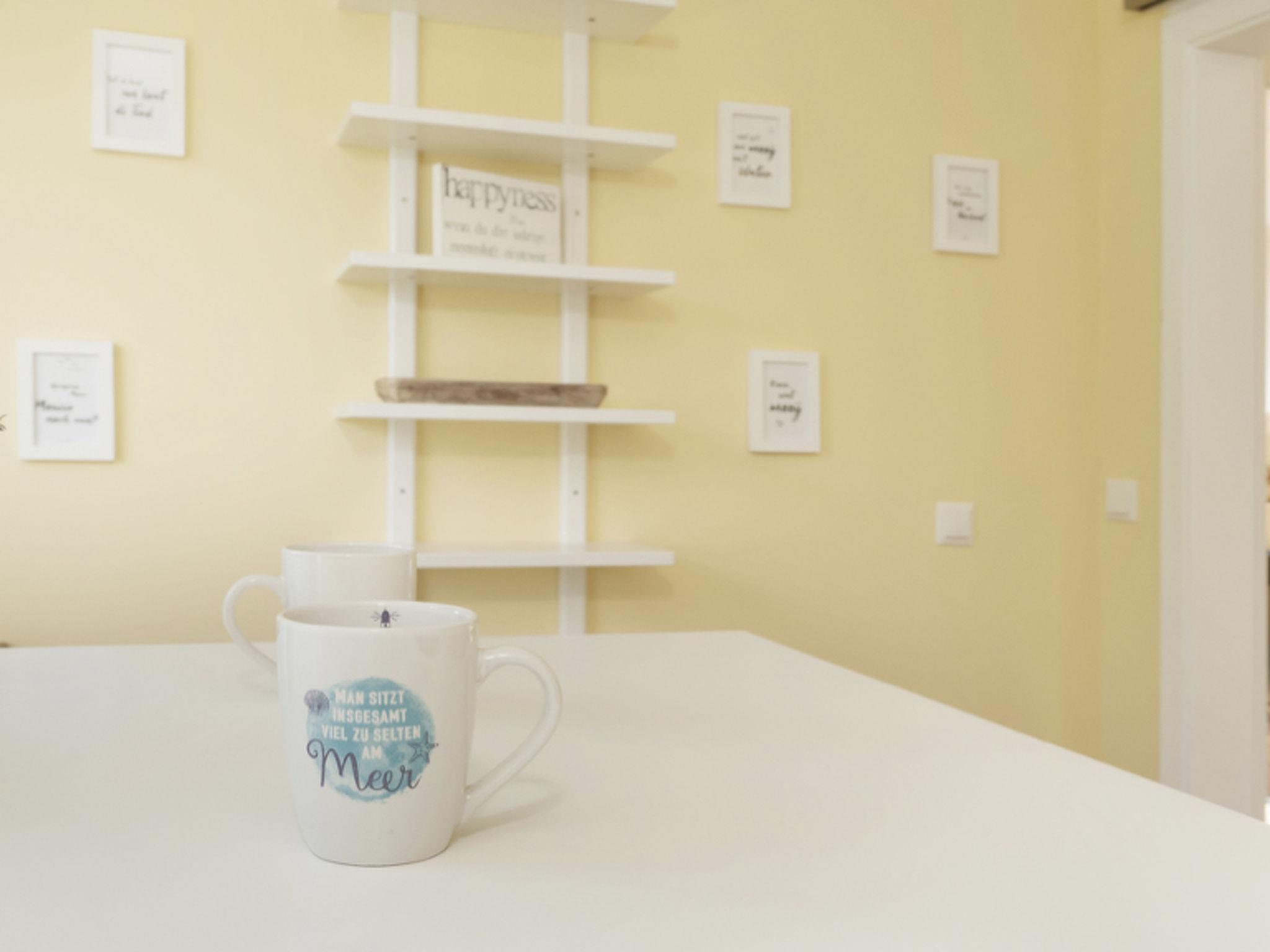 Am Ende des Flurs gelangt ihr in die moderne Wohnküche mit einer vollausgestatteten Küchenzeile und einem Esstresen. Hier findet ihr alles, was ihr für das perfekte Dinner braucht. Im angrenzenden Wohn- und Esszimmer wartet auf euch ein großer Esstisch mit Platz für bis zu sechs Personen, eine bequeme Auszieh-Couch (2 x 90 x 200 cm) und ein großer Smart-TV (55 Zoll). Hier findet ihr auch ein Regal mit einer Strandgutsammlung unserer Gäste.