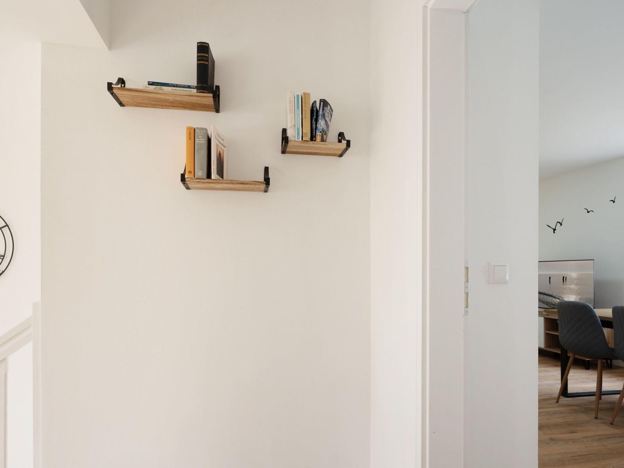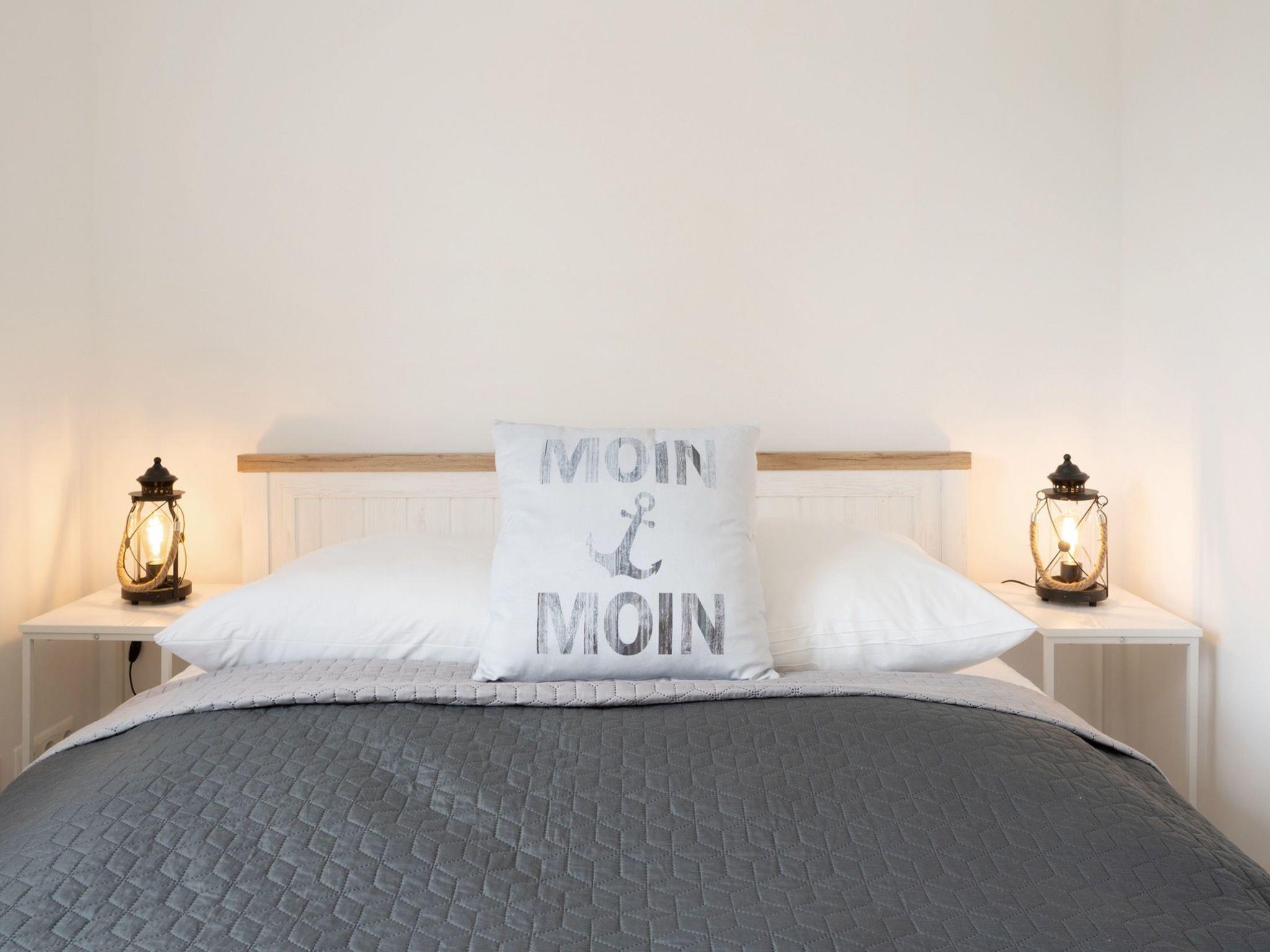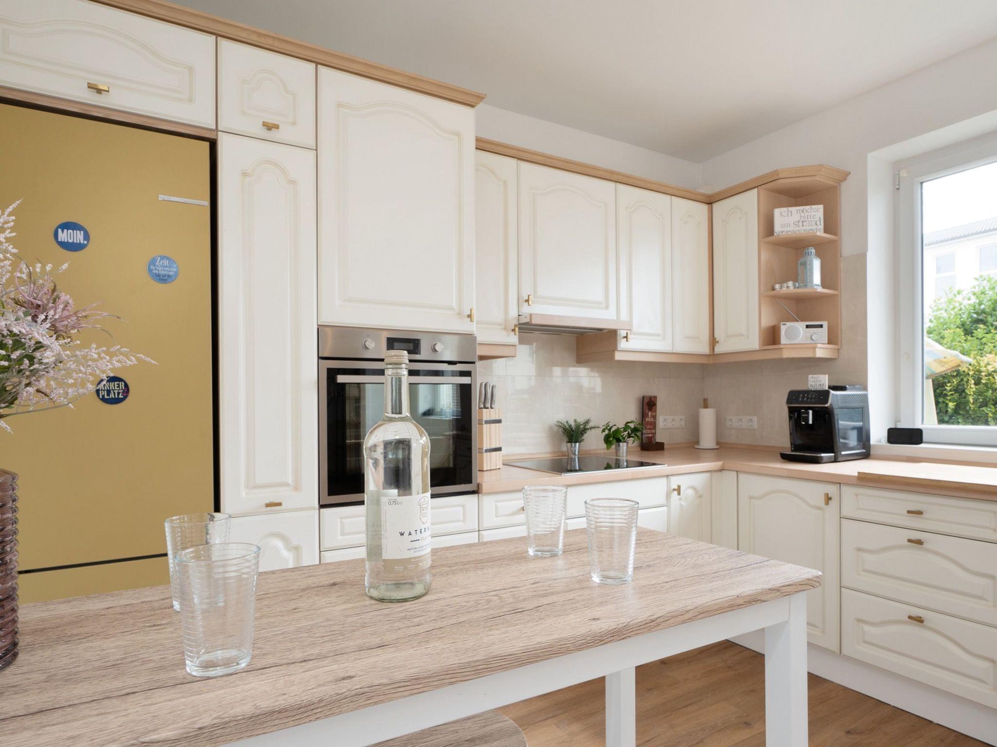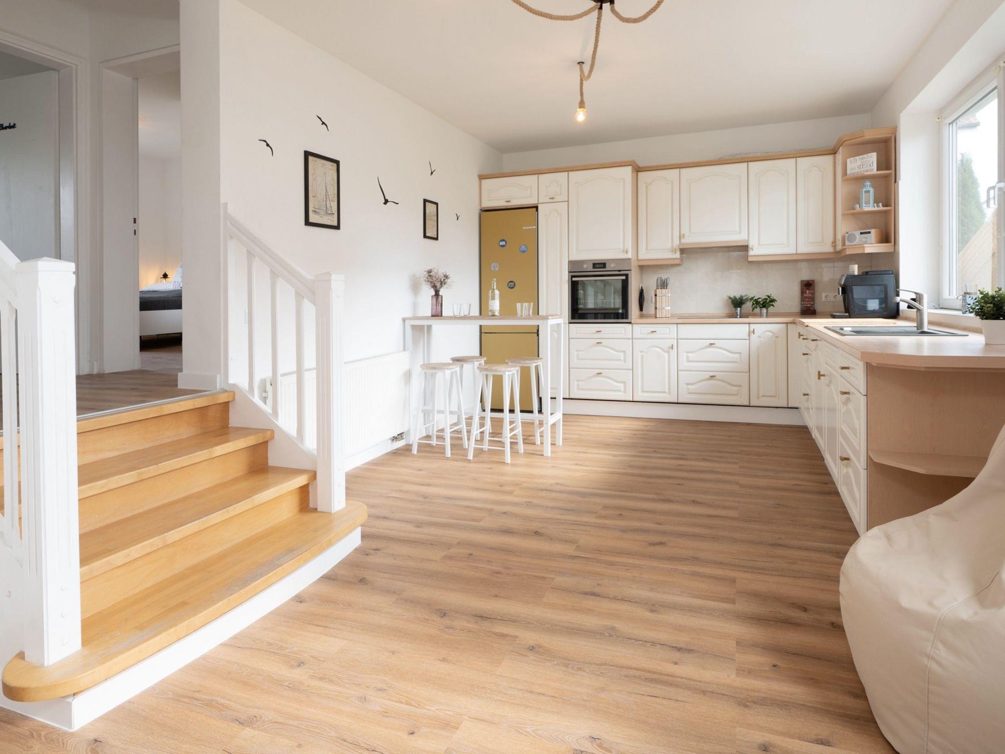 Erstmal richtig ankommen. Im maritim gestalteten Eingangsbereich wartet auf euch eine bequeme Sitzbank. Hier fühlt man sich gleich willkommen. Für ausreichend Abstellmöglichkeiten für Strandutensilien & Co. ist gesorgt. Direkt vom Empfangsbereich geht es in “Smutjes Revier” – eine geräumige Wohnküche mit einer voll ausgestatteten Küchenzeile sowie einem schönen Esstresen mit Barhockern. So könnt ihr euch während des Kochens über die neusten Urlaubserlebnisse austauschen. Oder wie wir im Norden sagen: “Ät, wat gor is. Drink, wat klor is. Sech, wat wohr is.”