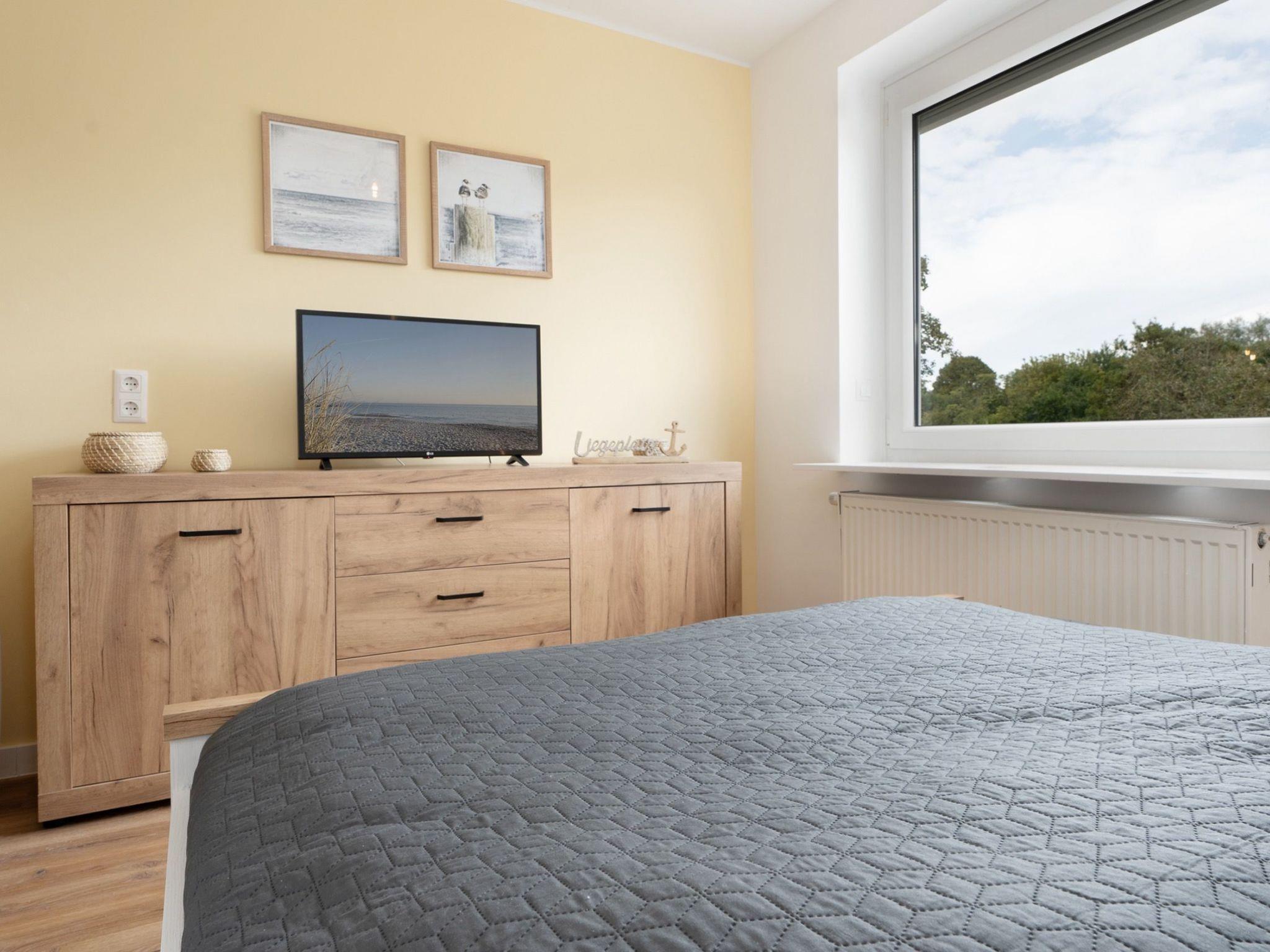 Das separate Schlafzimmer verfügt über zwei weitere Schlafmöglichkeiten. Ein großer Kleiderschrank bietet ausreichend Stauraum für die Urlaubsgarderobe. Das Doppelbett (160 x 200 cm) bietet Raum für geruhsame Nächte. Im Schlafzimmer findet ihr außerdem einen weiteren Smart-TV (Streaming-Dienste inklusive) für gemütliche Fernsehabende im Bett und einen praktischen Schreibtisch, an dem ihr in Ruhe eure Urlaubspost verfassen könnt. Das helle Duschbad mit Spiegelschrank und Fenster sowie rundum elektrische Fensterläden runden eure stilvolle Ferienunterkunft ab.