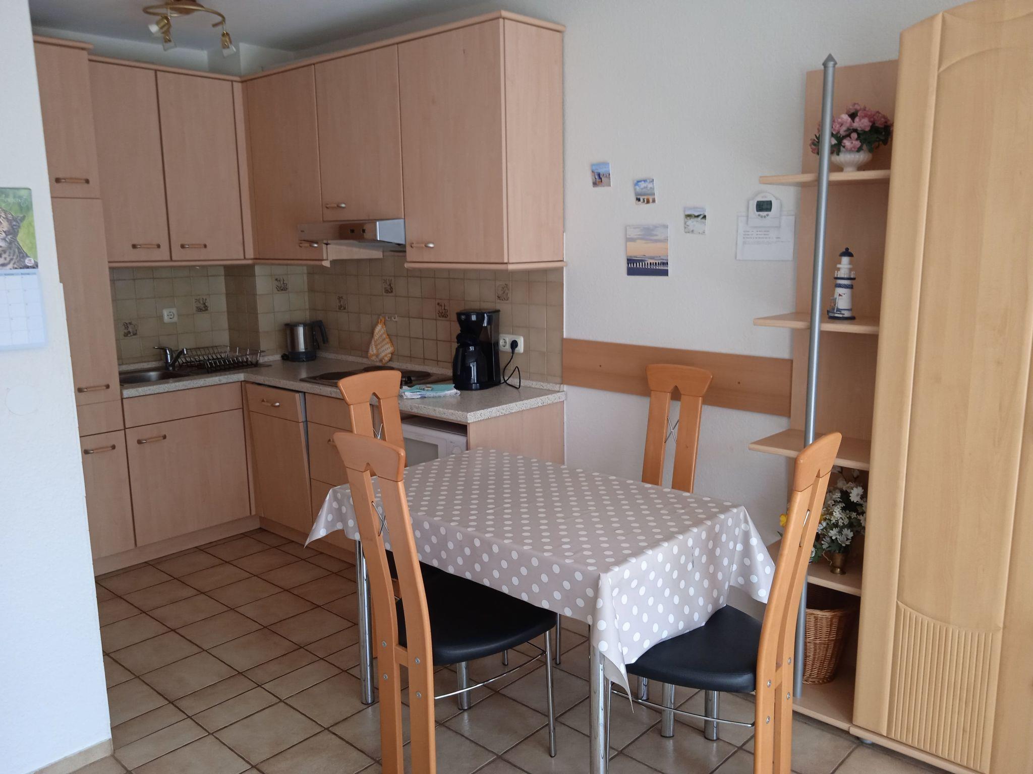 einer zum Wohnzimmer offenen Küche mit Cerankochfeld (neu in 2025), Dunstabzugshaube, Geschirrspülmaschine, Mikrowelle, Kühlschrank mit Gefrierfach, Kaffeemaschine, Wasserkocher, Toaster, Mixer, Eierkocher und Geschirr