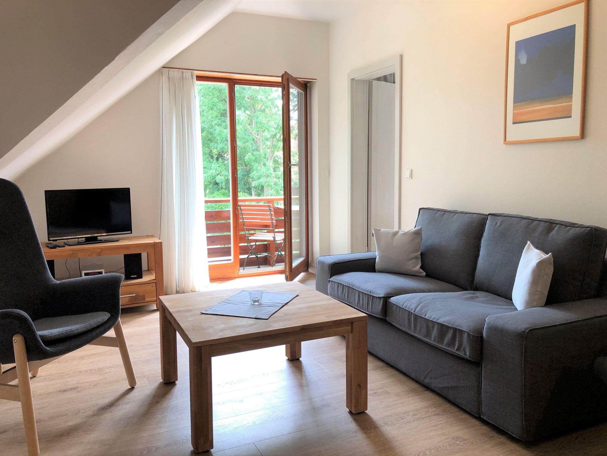 Moderne Ferienwohnung Hoffeld im sanierten Bauernhaus mit Balkon und Blick auf den Hof, ideal für naturnahe Erholung in Dahme.