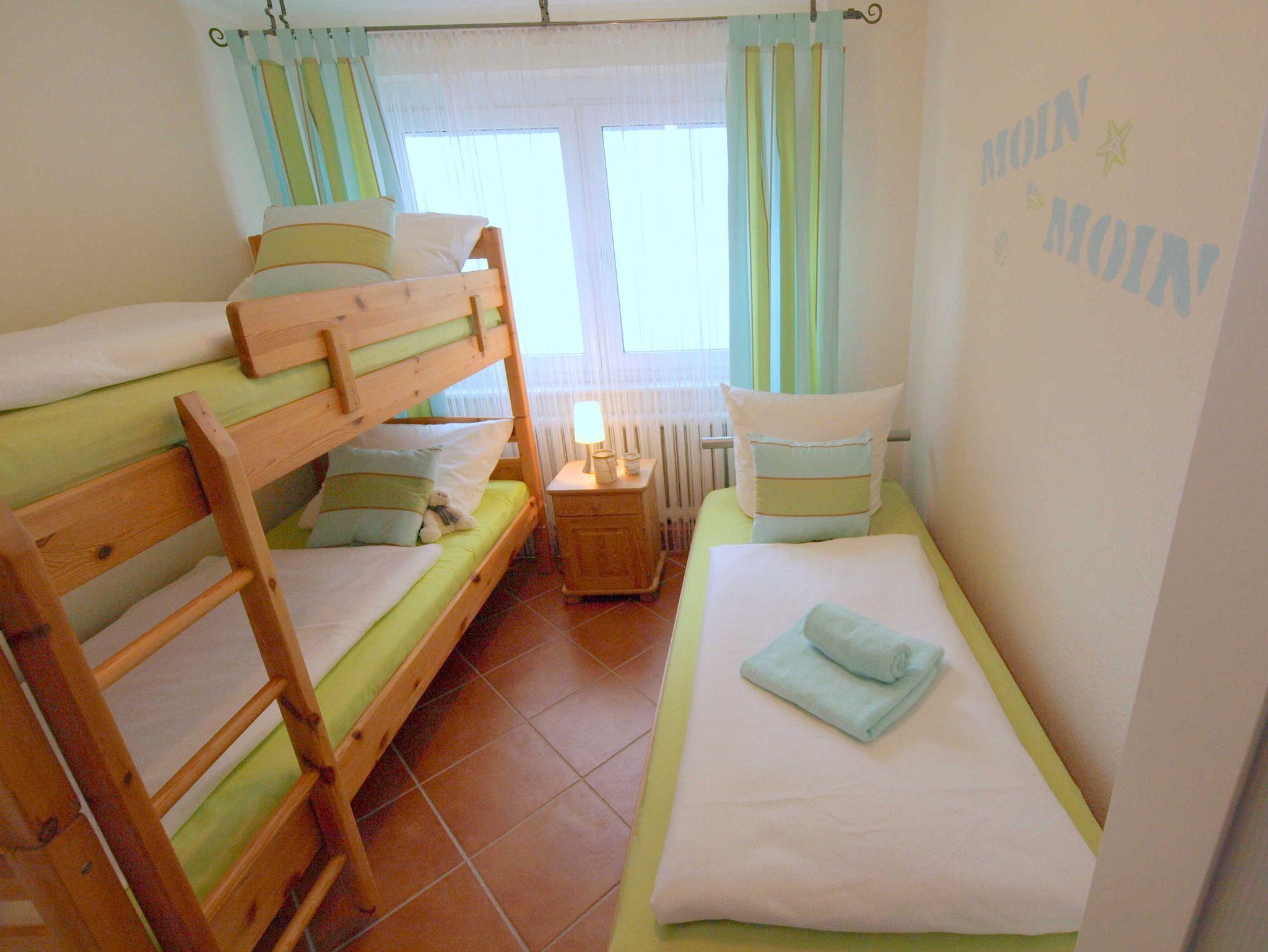 80 Meter Strandentfernung - Ferienwohnung ca. 75 qm für max. 5 Personen im Erdgeschoss mit direktem Zugang zum Garten und eigener Sitzecke im Garten. 2 Schlafzimmer, 1 Schlafzimmer mit Doppelbett und zusätzlichen TV, 1 Kinderzimmer mit Etagenbett und einem extra Einzelbett (100 x 200 cm). Separate Küche, Wohnzimmer mit Essecke Blue Ray/DVD Player, 2 moderne, neue Duschbäder. 1 kostenloser PKW-Stellplatz auf dem Grundstück. E-Bike Stellplätze, Nichtraucher. Keine Haustiere. WLAN kostenlos.