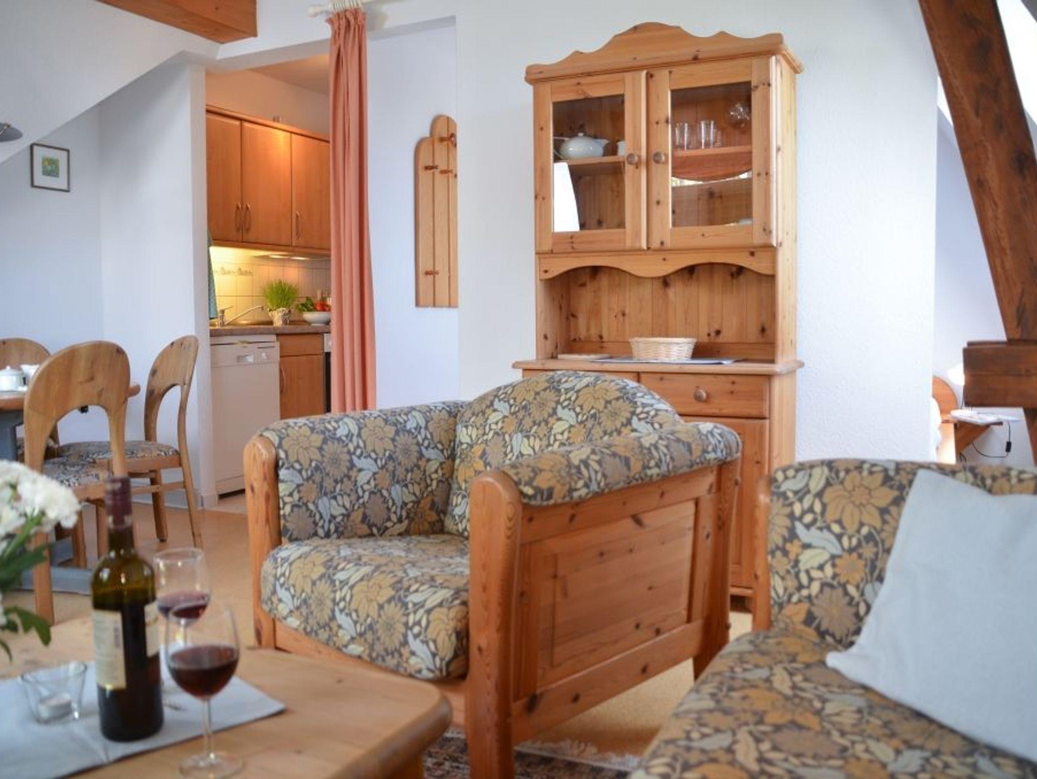 Die Wohnung verfügt über ein Wohnzimmer mit Essbereich, ein Elternschlafbereich, ein Kinderschlafzimmer, eine Küchenzeile inkl. Spülmaschine sowie ein Duschbad mit WC. Der Elternschlafbereich ist vom Wohnzimmer mit einer Trennwand abgegrenzt. Rustikales Dachgebälk sorgt für eine Wohlfühl-Atmosphäre.