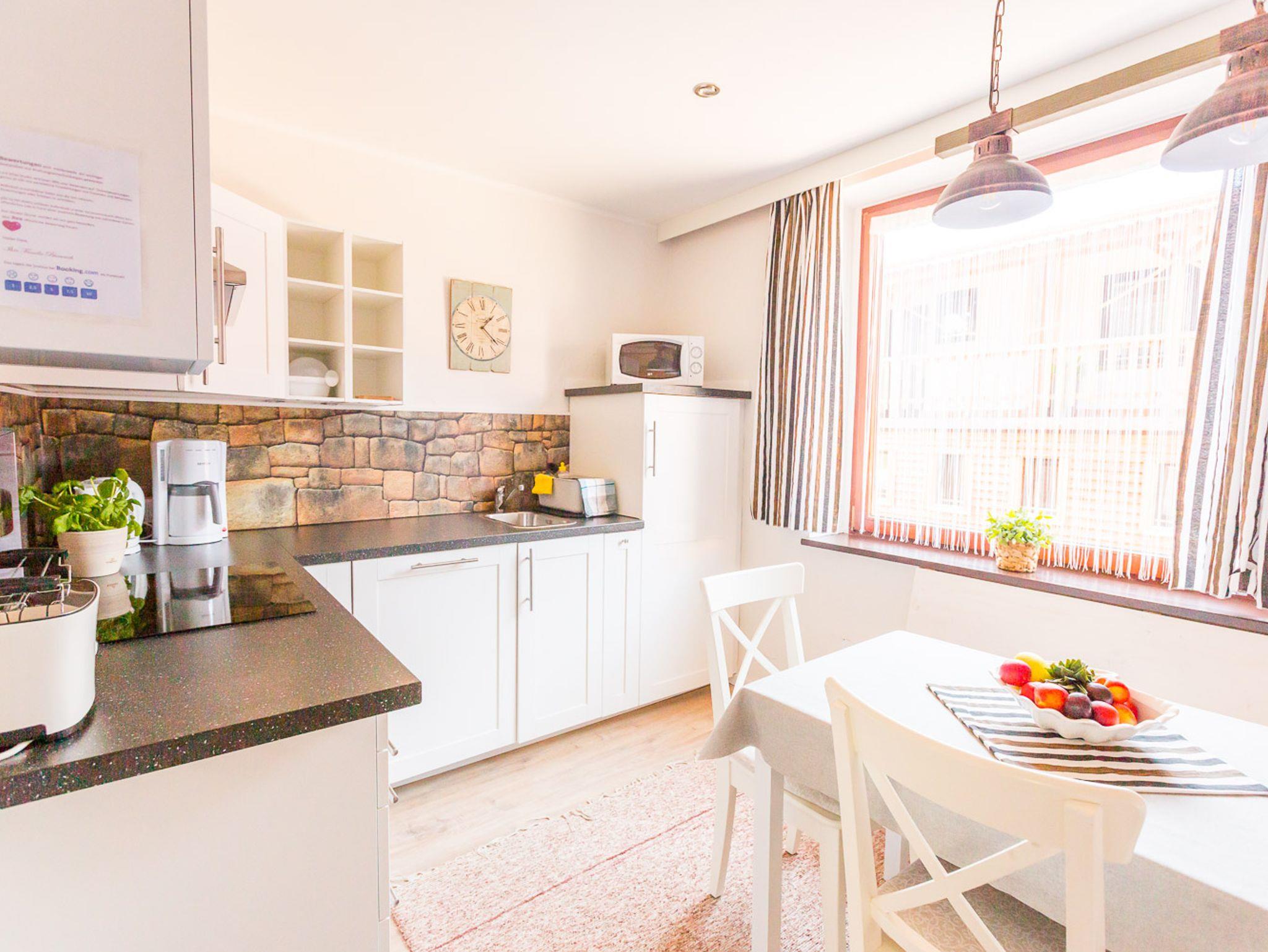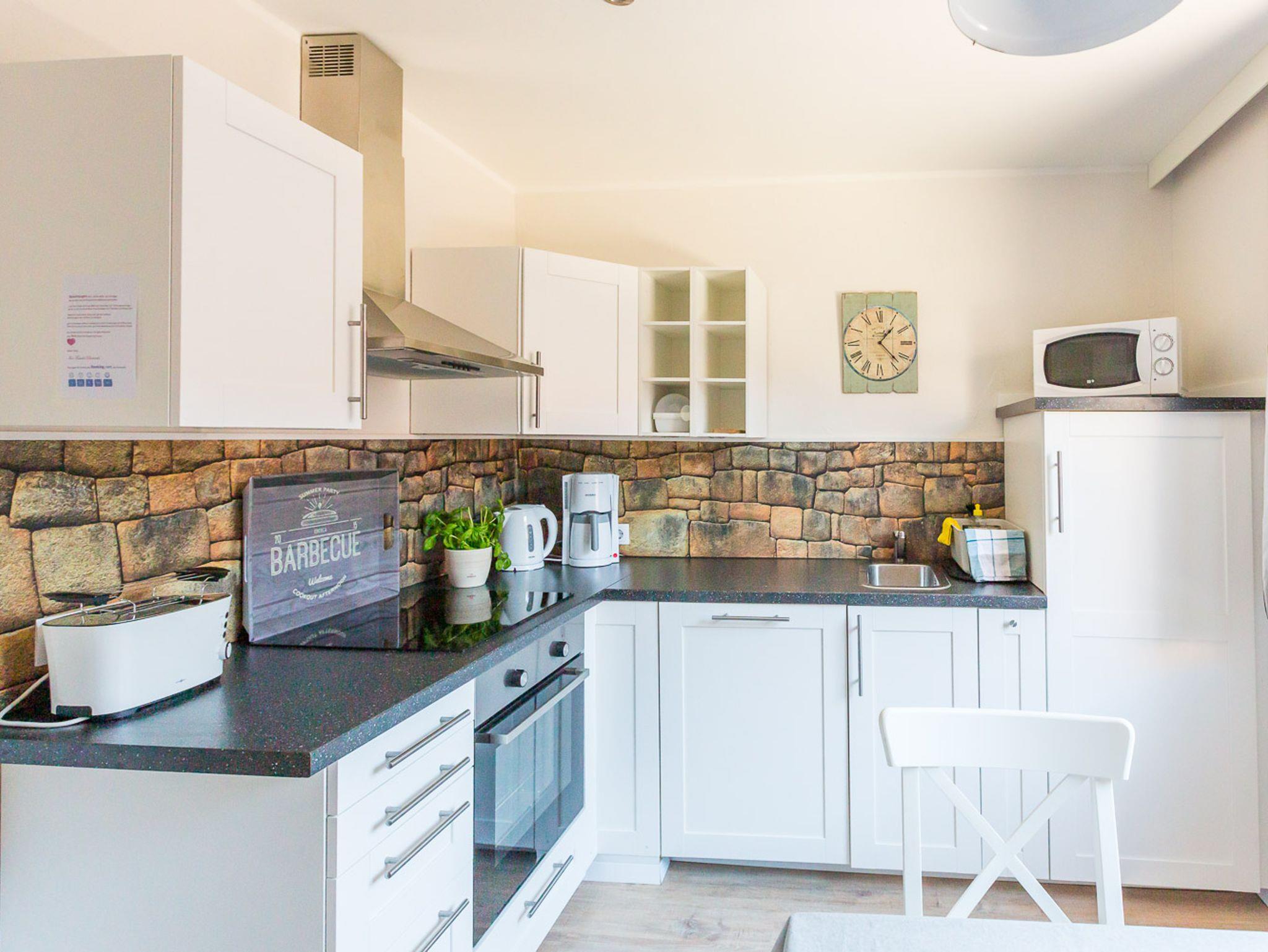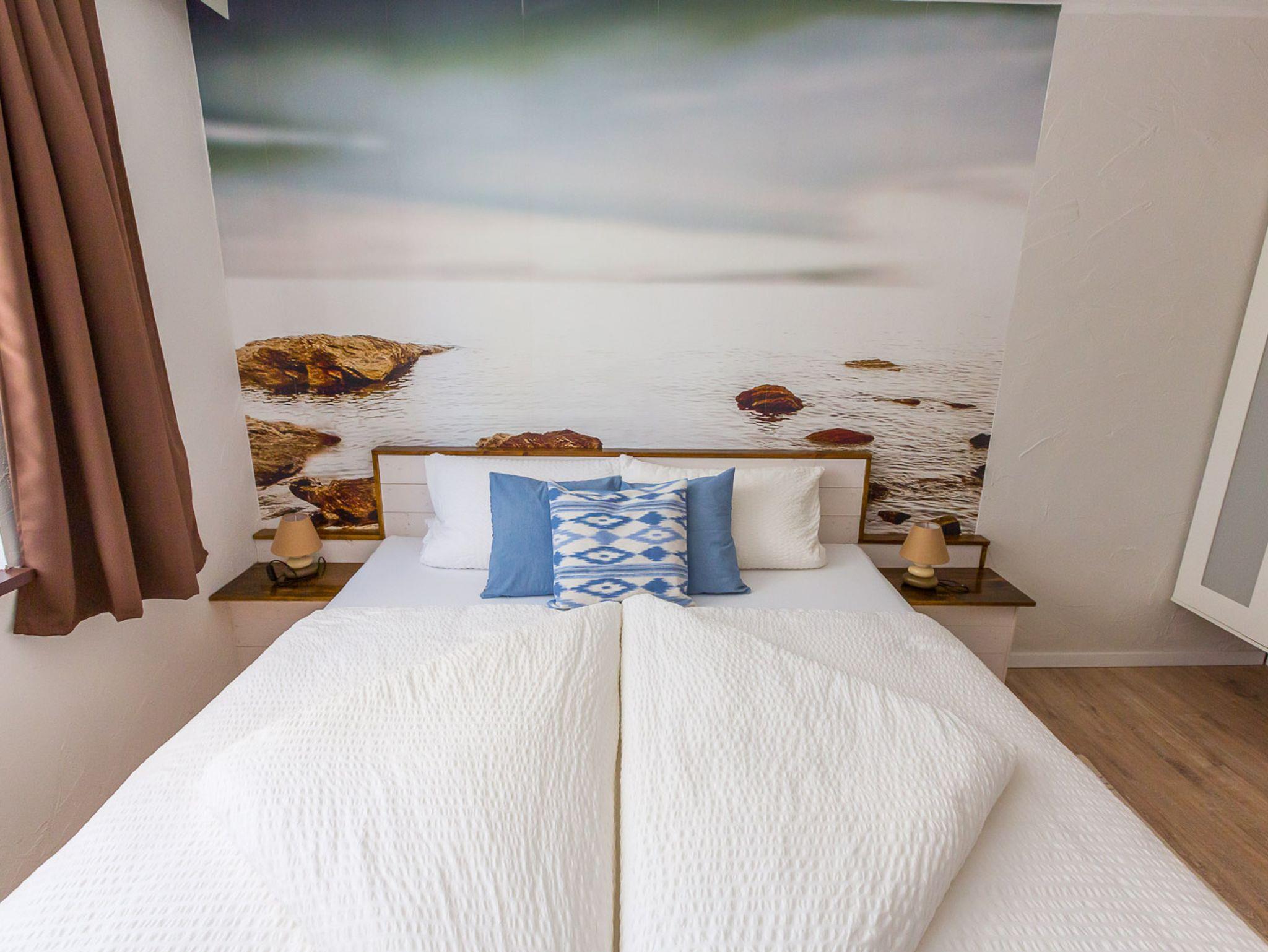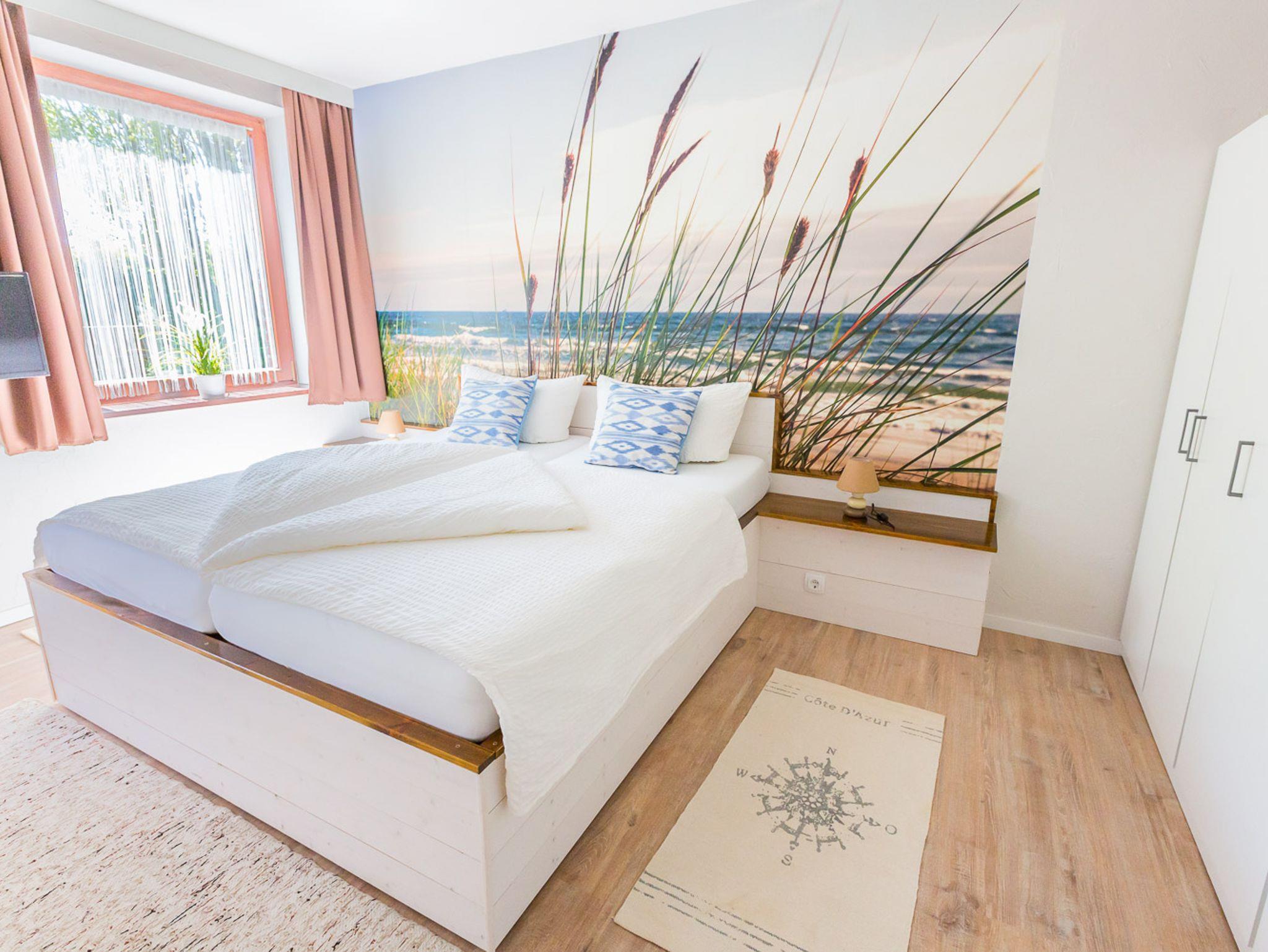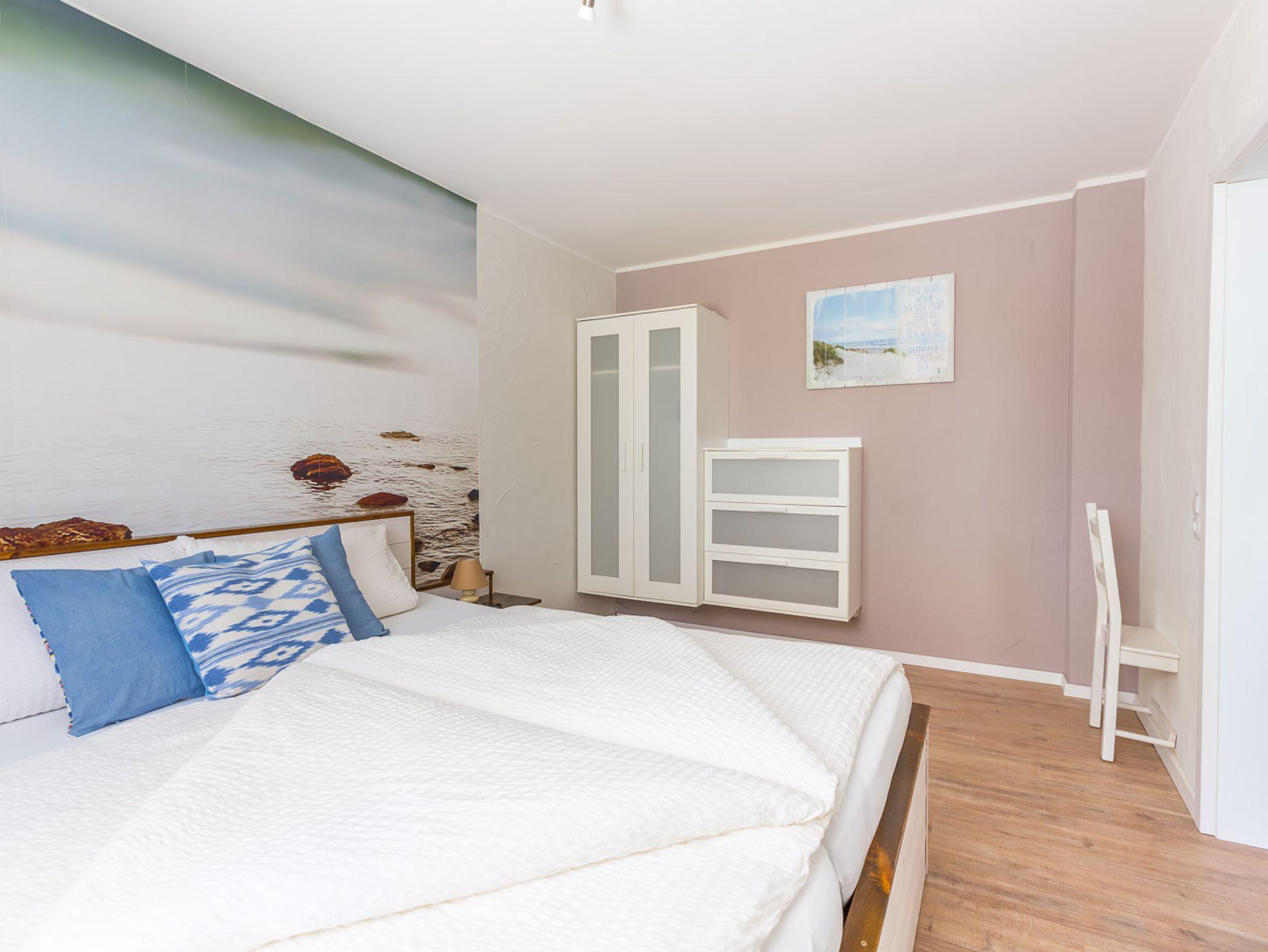 Die komfortable Ferienwohnung mit 85qm Wohnfläche bietet Platz für bis zu 5 Personen. Die Veranda ist mit gemütlichen Sitzmöbeln ausgestattet. Das maritime Flair des Hauses findet sich in der Wohnung auch in den Dekorationselementen wieder. Die Wohnung verfügt über ein Wohnzimmer und zwei Schlafzimmer, eine Küche und ein Wellness-Badezimmer. Ein Schlafzimmer ist mit einem Doppelbett eingerichtet. Das andere Schlafzimmer ist mit einem Doppelbett und einem Einzelbett ausgestattet. Das Wohnzimmer ist mit einer Sofalandschaft, einem Radio und einem Flat-TV möbliert. Für den TV ist ein DVD-Player vorhanden. Die Küche ist komplett ausgestattet. Sie finden Essecke, Kaffeemaschine, Wasserkocher, Backofen, Mikrowelle, Geschirrspüler, 4-Platten Cerankochfeld, Toaster, Kühlschrank mit Gefrierfach, Geschirr und Besteck vor. Das moderne Bad ist mit Dusche, WC und Fön ausgestattet. Gegen Aufpreis kann ein 1 Wäschepaket 1x Handtuch, 1x Duschtuch, 1x Bettwäsche zum selbst beziehen in Anspruch genommen werden. Das Rauchen in der Wohnung ist nicht gestattet. Im Außenbereich kann geraucht werden. Zudem gibt es im Garten einen Grillplatz. Die Nutzung des WLANs ist im Preis inbegriffen. Das Parken ist kostenfrei möglich. Auf Anfrage kann ein Babybett und ein Hochstuhl angeboten werden.
